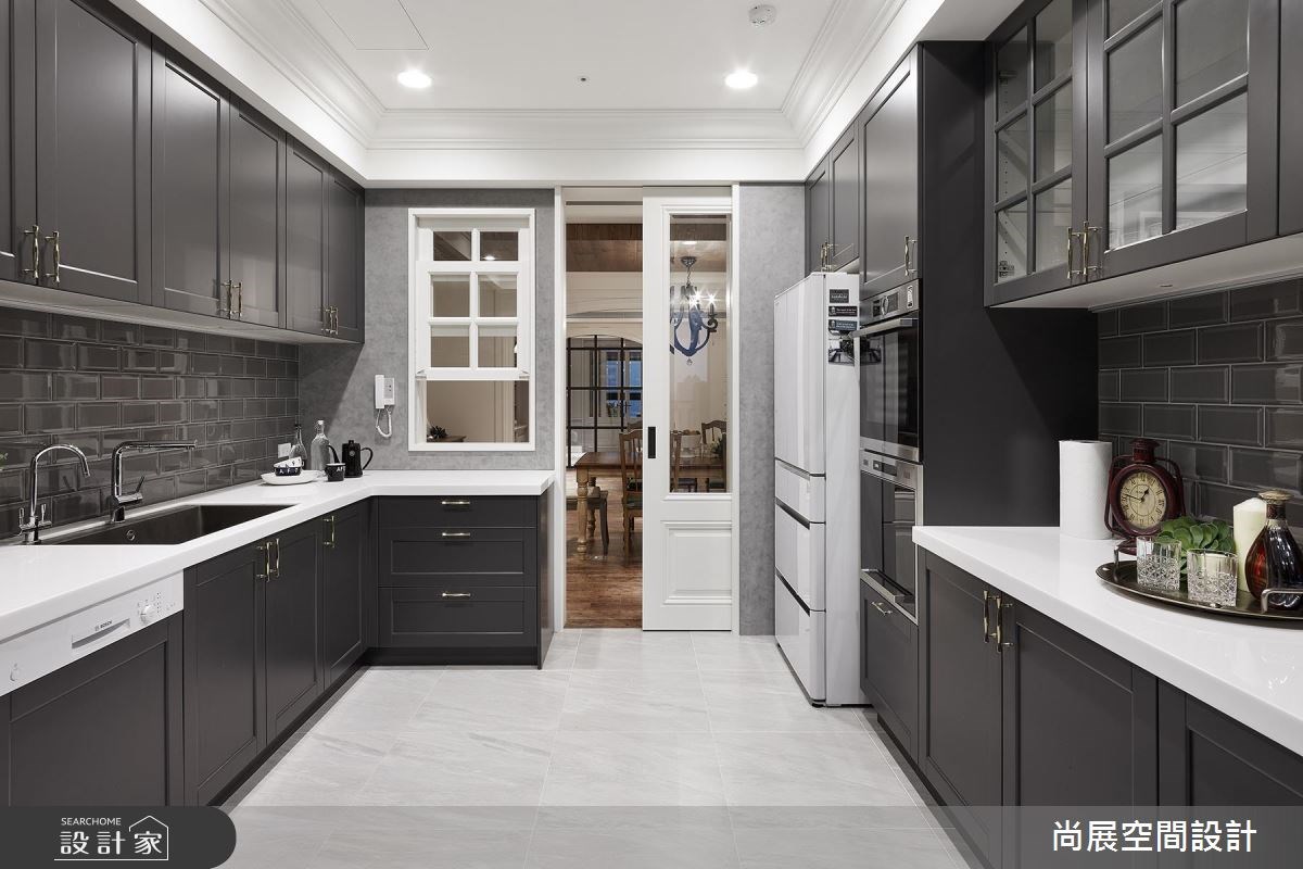 旅居過各地的醫師夫婦崇尚歐洲慢活態度,也嚮往美式居家的優雅簡約設計,因此最終以現代美式風定調這間 40 坪住宅。在開放式的公共空間中,以烘焙廚具齊全的中島廚房為家的中心,空氣中不時飄散的甜香氣息,增添了生活趣味及家的溫度,也調慢了平日忙碌的步調! 玄關地坪以黑白色系的花紋貼磚分野場域,入門處端景牆以復古的櫃體搭配掛畫及黃光壁燈,揭開了美式風情的序幕;客廳以壁爐為中心,佐布沙發及金邊家件呈現出悠閒溫馨又不失現代感的氛圍,充分發揮招待客人的交誼功能;書房兩側設計的隱藏推門延伸了客、餐廚區塊,兩邊皆可出入的設計,讓光線及動線同時暢流於室內;餐廚區設備齊全,中島式廚房方便製作,高科技烘培廚具節省了時間,讓鑽研多年甜點的太太能一展烘焙實力,能在動線良好的開闊空間完成;走入私領域,以 baby 藍搭配純白色系帶出臥房的浪漫輕透氣息,另還設有一更衣室,增加衣物收納同時留有一處太太的化妝空間。 小編的最愛 針對屋主的需求,設計師在酒櫃設計多下了些心思,除了餐桌旁一體成形的開放式鐵件展示櫃上方可收納酒瓶外,位於冰箱區旁還有一內崁式酒櫃冰箱,讓不同品種的佳釀都能擁有最適合的保存空間!