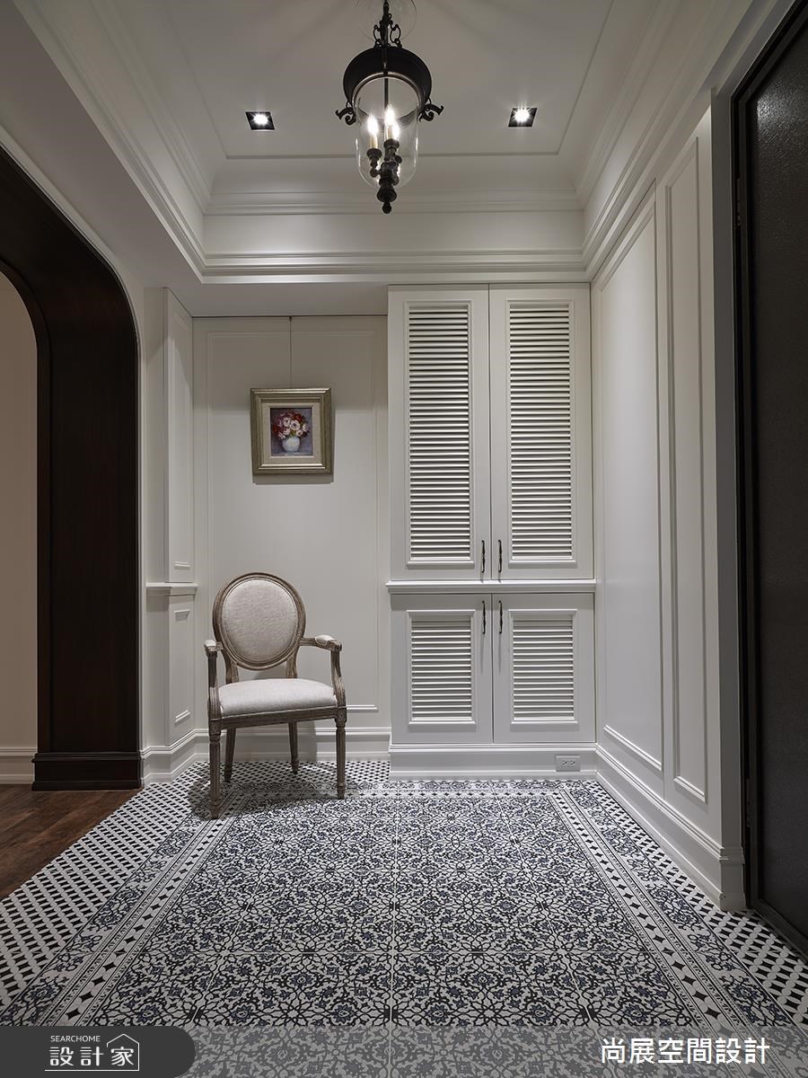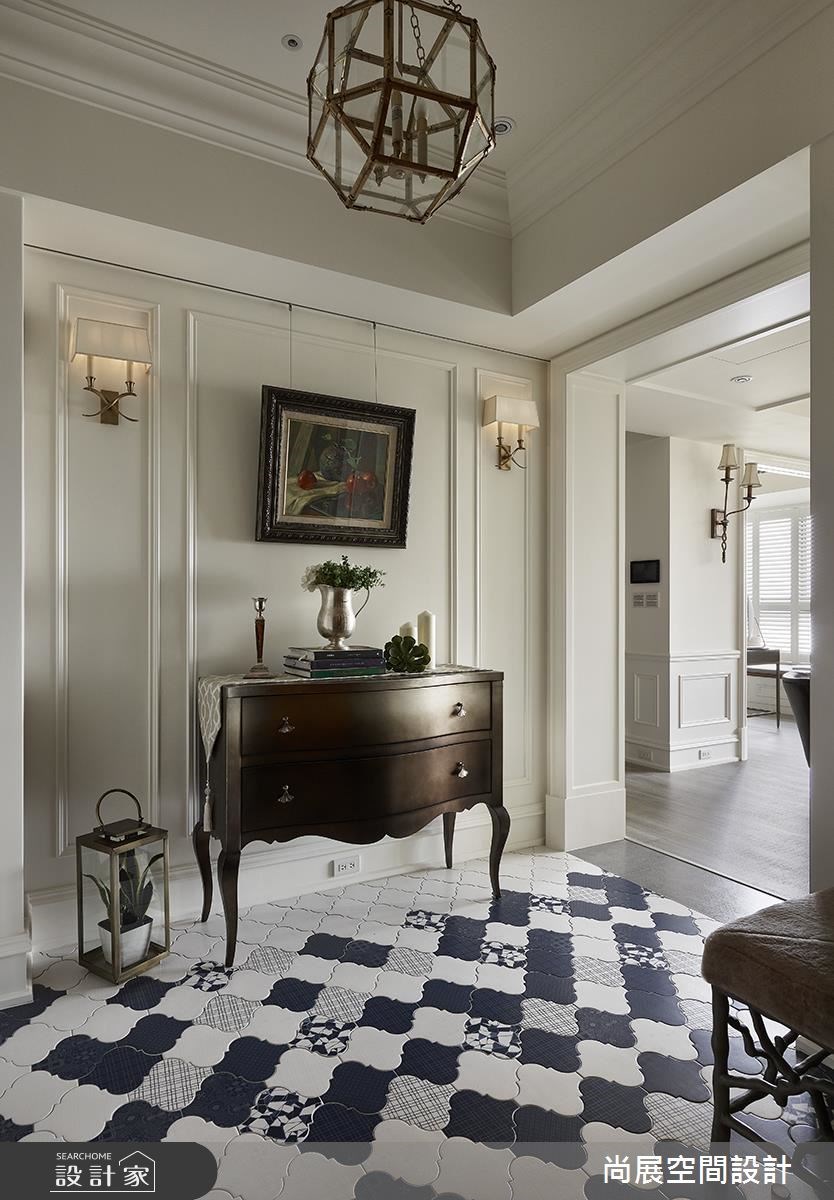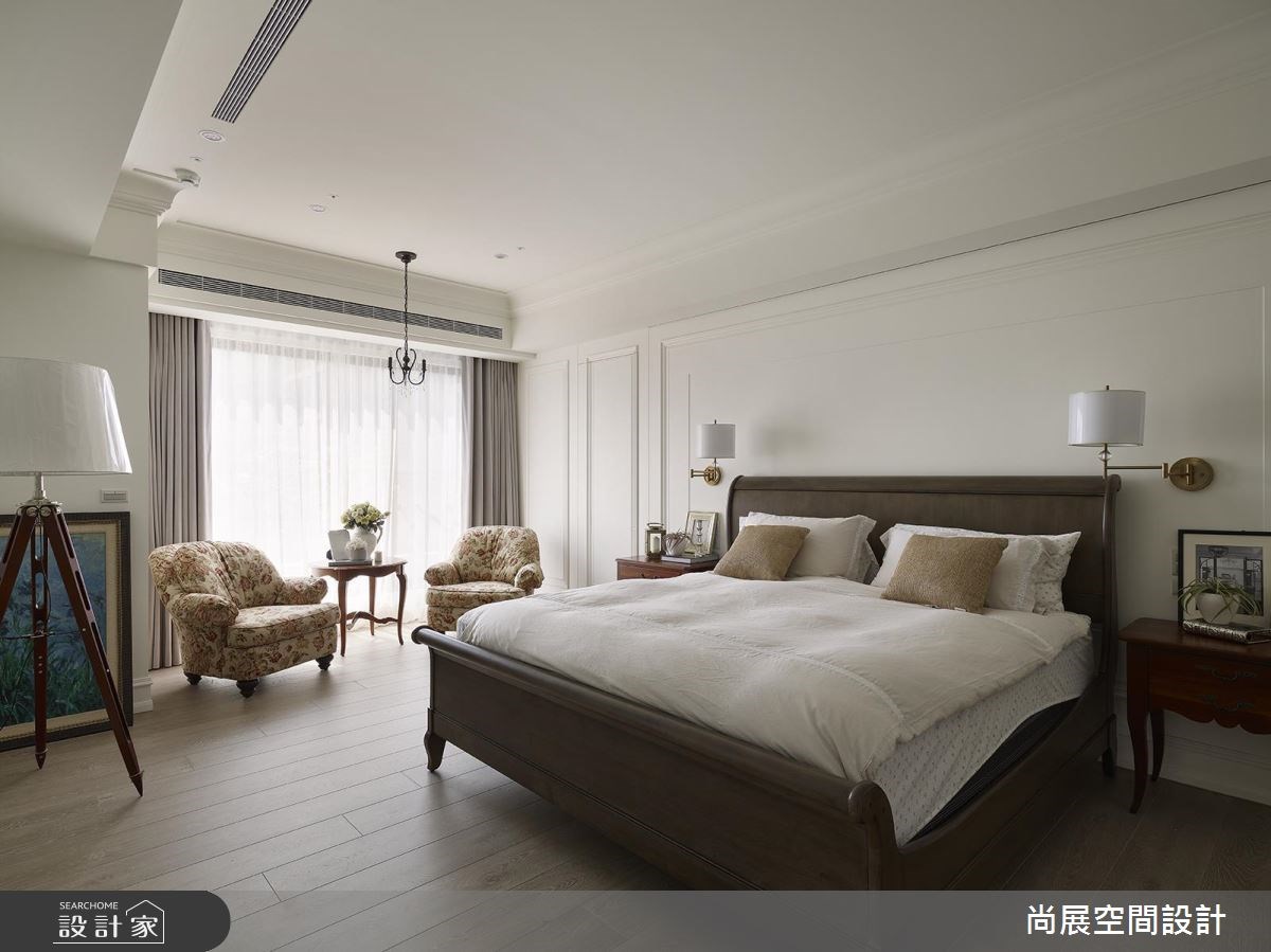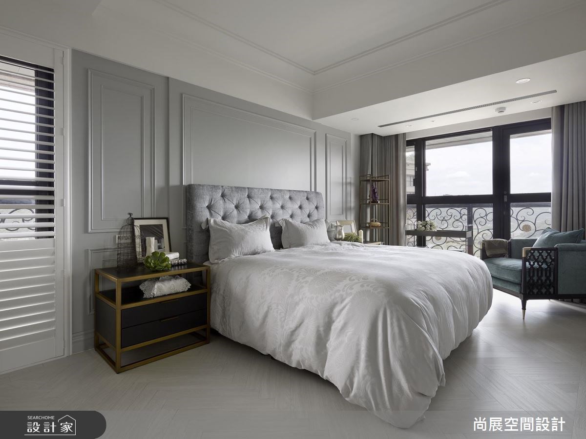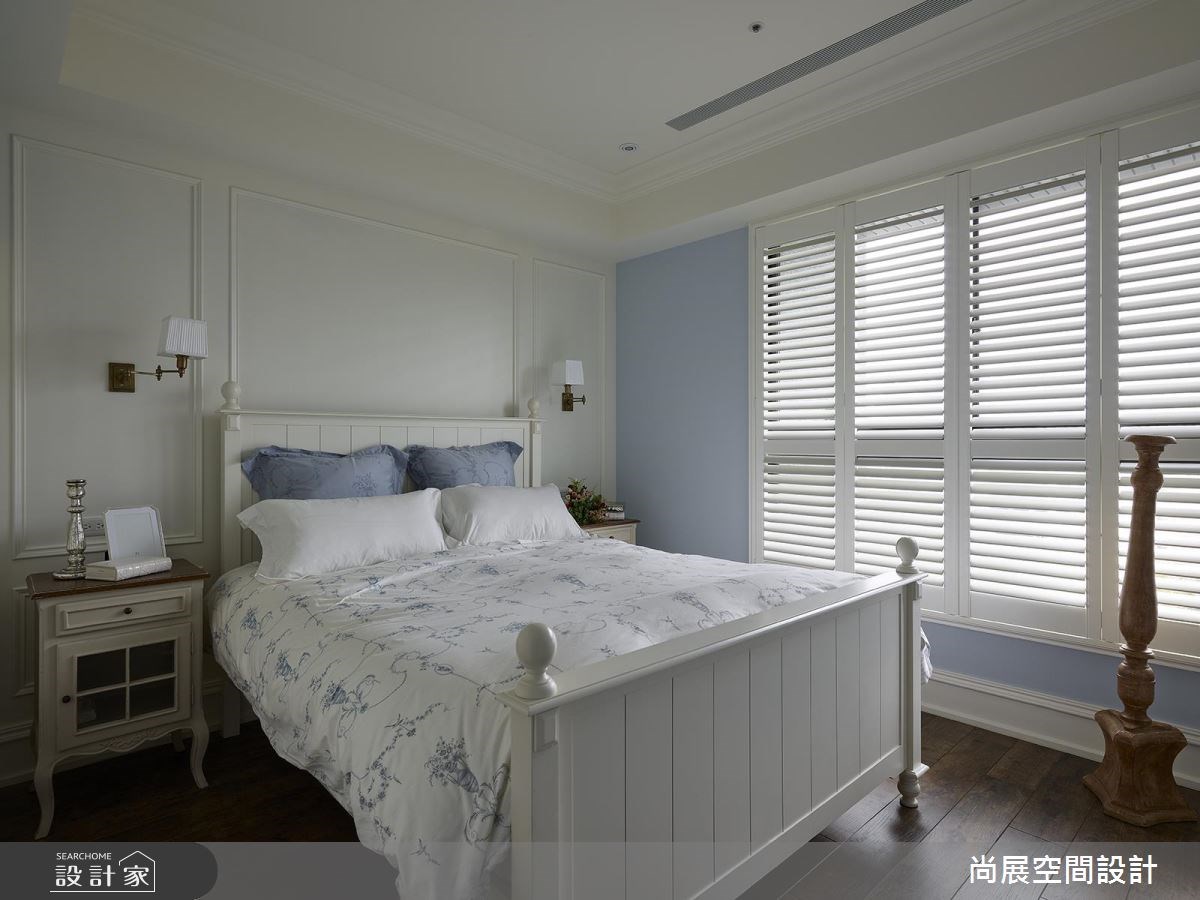年少有成的屋主,在 40 歲以前即規畫好了自己的退休生活,他找來了設計師,替 110 坪大宅做出設計,把紐約漢普敦 (The Hamptons) 的美式語彙注入居宅;在空間裡,可感受到沉穩大器、但不失年輕感的氛圍,並以淺藍色為基調,搭配相得益彰的家具、家飾等,傳遞出島國的度假情懷,繪出了一幅美好的退休生活藍圖! 走進家中,可見到巧思規劃的穿鞋椅、燈飾等,搭配清新感的藍色壁面,形成美好的端景意象;客廳則以白色、水藍色定調,搭配飽滿採光與線板元素,營造出一股別緻的海洋氣息,並在電視牆兩側結合鏡面設計,於對稱美感之中,創造延伸的視覺感受;穿越門斗可來到餐廳,一旁配置了白色玻璃格子窗,讓居宅內的光線可自在流通,創造明亮的用餐環境;書房則運用對開門片作出領域隔屏,並規劃大面書牆,形成美感、機能兼具的立面,而木地坪、木作書桌椅的陳列,則傳遞質樸的書香味道;臥房空間則以色彩作出主題,無論是質感淺灰、法式粉紅、異國草綠等,都各具優雅情調,尤其在客房中,更於床頭牆鋪陳花鳥壁紙,與綠色床單作出呼應,呈現舒心療癒的島國氣氛! 小編的最愛 一間滿分的衛浴,不僅須具備空間美感,更要將淋浴、洗手台、泡澡、收納等作出明確劃分,營造清爽的使用體驗;在案例中的衛浴空間,設計師不僅善用材質呈現素雅視感,更納進景觀、採光,把泡澡雅趣也融入了退休生活裡!