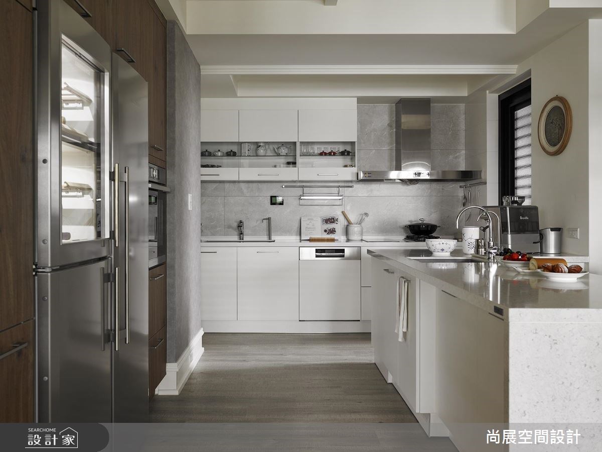 年屆七旬的夫妻,選擇改造80坪中古屋大宅,做為退休後的新起點;除了無障礙空間設計,女主人也期望可擁有一間高機能廚房,並於空間中延攬舒心好採光,同時搭配著美式風、現代風的薈萃融合,開啟最適宜樂活養生的生活場景,快跟著小編一起來看看吧! 居宅整體呈現寬敞平坦的視野,且加入無門檻的安全性規劃,更貼近屋主生活所需,並打掉既有格局、重劃平面,將客、餐廳、書房盡量敞開,推演每個角落及面向的明亮感,成就溫暖的現代美式風格,尤其電視牆更結合俐落的鐵件嵌玻璃,運用略為穿透的隔間設定,網羅場域之間的視線互動性;餐廚地帶,也是改造的重點之一,將原先一字型、顯得狹窄的廚房,改裝為 U 字型的寬敞高機能廚房;且打造出一間加大的陽光主臥,以及一間孩子回家可睡的客房,替每位居者保有專屬的暖心寧靜。 小編的最愛 設計師選用大理石或磚材,妝點於玄關、廁浴或電視牆,以淺灰、灰色的紋理彰顯俐落沉靜,搭襯大面積的溫潤木質素材,調和出和煦的居家溫度!