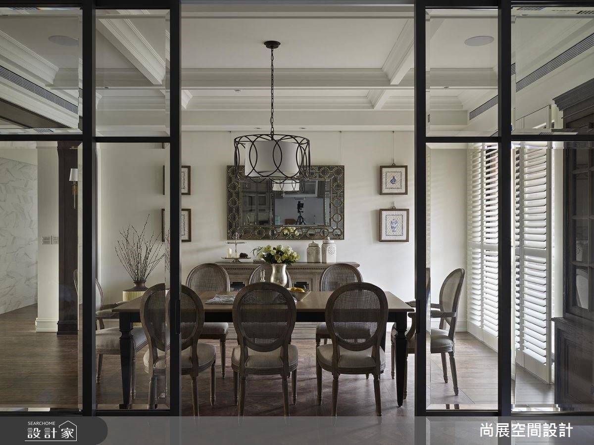 近百坪的空間以美式風貌包裝,從氣度、格調至採光、動線,在在皆成為豪宅典範,在現代居家中彰顯的經典復古情調。 為重現道地美式宅邸格局,一入內玄關即可看見雙色拼花大理石與圓弧線板穹頂,搭配鏤空格菱紋與對稱擺放的仿舊桌椅,成為氣派非凡的迎賓端景牆。穿越造型有別於以往的 4 邊型拱門,到達開放式公領域,設計師善用 L 型開窗採光,讓客廳與餐廳皆能沐浴在充沛陽光裡,設計師更別出心裁,沿窗設置多功能流理台,讓簡易料理動線更加流暢。客廳天花以優雅的格狀線板作為場域框設,ㄇ字型擺放的家具與單椅同時強調對襯特色,純白百葉窗不僅能調節日光的流動,更進一步提純經典美式風格。 小編的最愛 近百坪居宅內大量採用釘扣單椅、皮製沙發、複合金屬櫃體、弧形碗櫥等仿舊家具與老件,讓人宛如身處 18 世紀的殖民風格時代,體會美式經典風格。