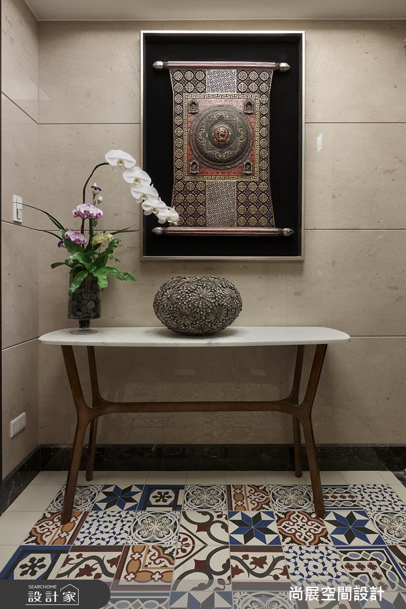 由於屋主是一對著迷於影集的年輕夫妻,先生更是鍾愛福爾摩斯系列,因此與擅長古典風格的尚展設計合作,整個家比照電影場景打造,更特別規劃專屬神探的經典書房! 設計師掌握色彩與家具配置 2 大原則,以紳士灰與灰藍色為基底,加上一張釘扣皮革沙發,成為入門的第一印象。分布在客廳及書房的沉穩色調,彰顯了偵探般沉著冷靜的性格,客廳搭配十字拼法的超耐磨木地板,更提純復古紳士魅力。由於屋案坪數寬敞,因此設計師打造富特色的廊道串連空間,完成宛如歐美居宅的格局。穿越設置花磚與穀倉門的廊道即可到達起居間,比照歐美住宅為屋主設置了起居間,維持夫妻的互動與隱私,而起居間色調為因應女主人喜好,以暖調奶茶棕作為主軸。廚房利用色彩濃重的灰黑色調構築,運用灰色馬來漆塗刷不規則紋路,佐亮面軌道磚打造優雅的異國廚房。 小編的最愛 私領域調性轉為溫柔甜美,善用藍紫色調搭配簡約優雅的家具;衛浴則以大理石建材,凸顯專屬復古氛圍的大器與經典。