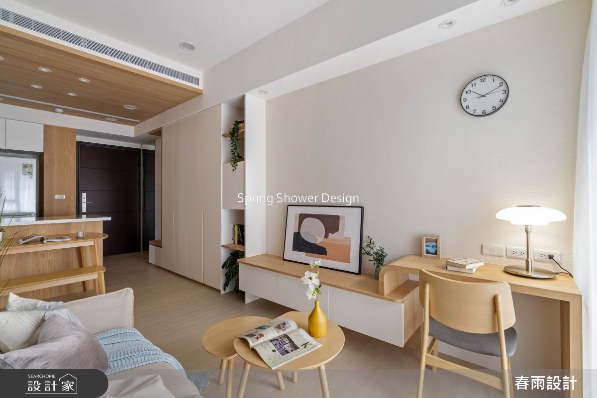 由春雨設計精心規劃的12.5坪一房住宅空間,家庭成員一共有1位大人。因應屋主需求,設計師運用混搭風作為主軸,搭配木作、系統櫃、長虹玻璃、旋轉鞋架,打造全家人的夢想家居。