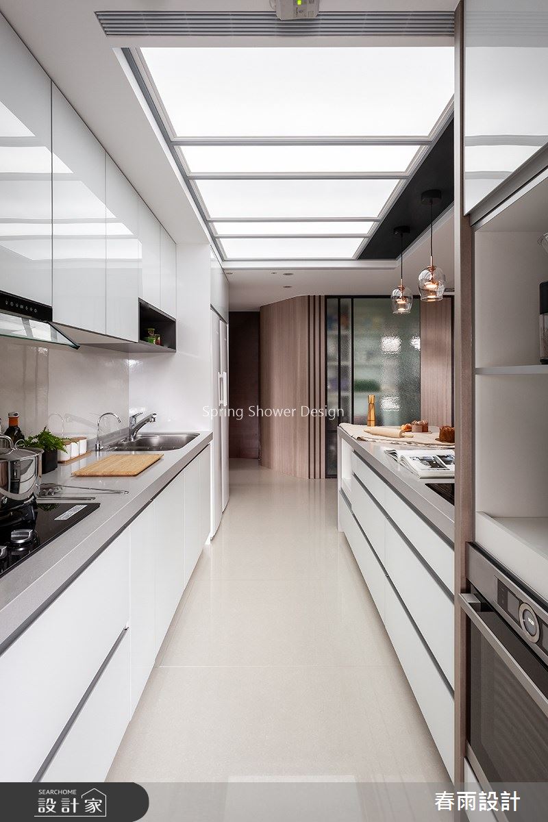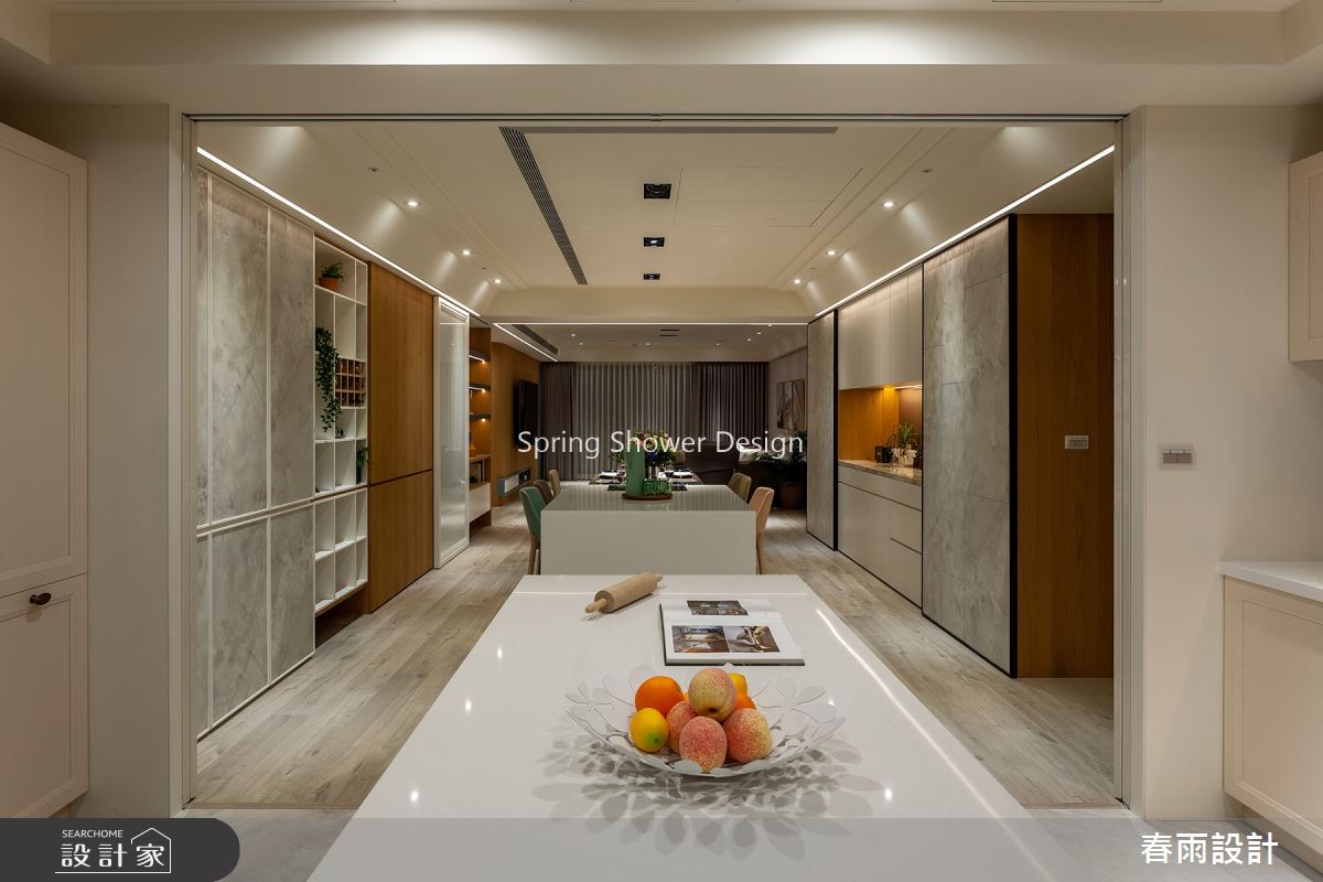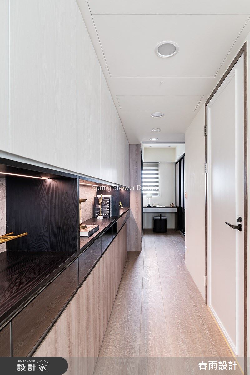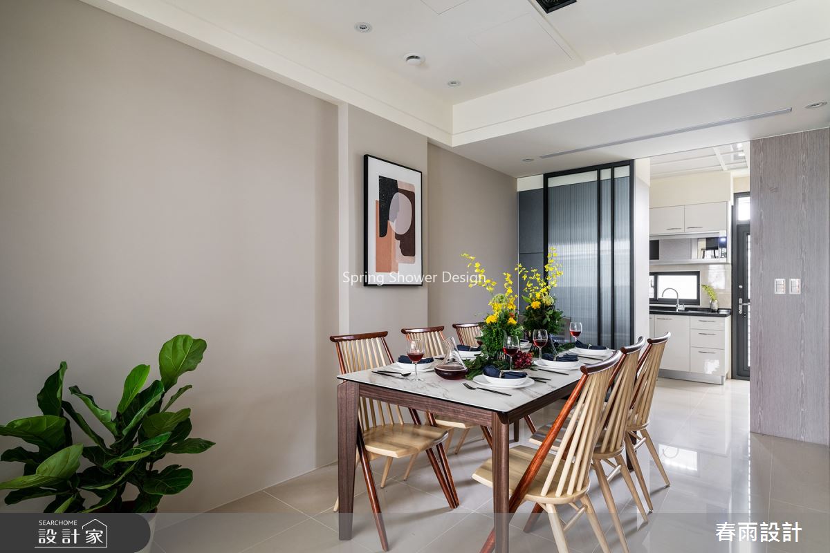 春雨設計以超耐磨木地板、鐵件、大理石、賽麗石、皮革、木作、大板磚、鍍鈦板、地暖、帝雉石、黑鏡、灰玻璃、長虹玻璃、茶玻的搭配應用,呈現現代風居家氛圍,將此間61.1坪、四房、單層、新成屋(5年以下)打造成舒適愜意的家庭空間,完成2位大人、2位小孩、1位長輩全家人的夢想之居。