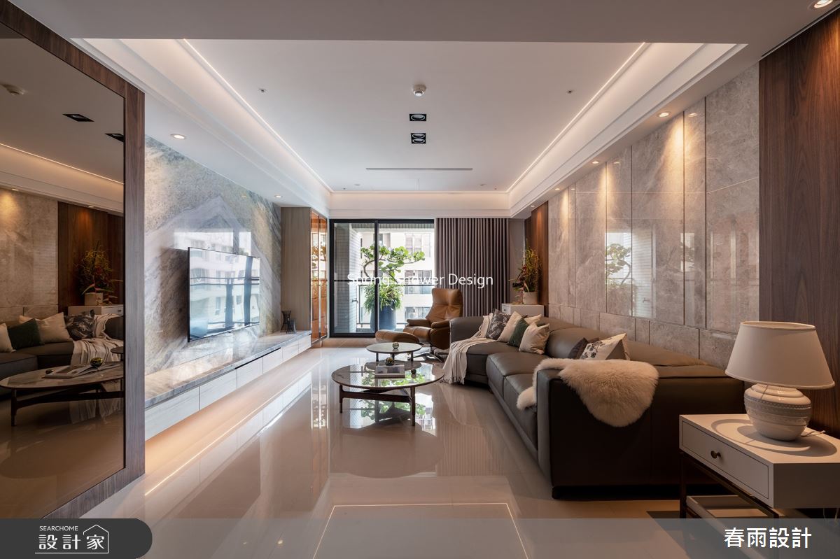由春雨設計精心規劃的45.3坪三房住宅空間,家庭成員一共有2位大人、2位小孩。因應屋主需求,設計師運用現代風作為主軸,搭配木地板、大理石、茶鏡、鍍鈦、夾紗玻璃、美耐板、系統板、五金,打造全家人的夢想家居。
