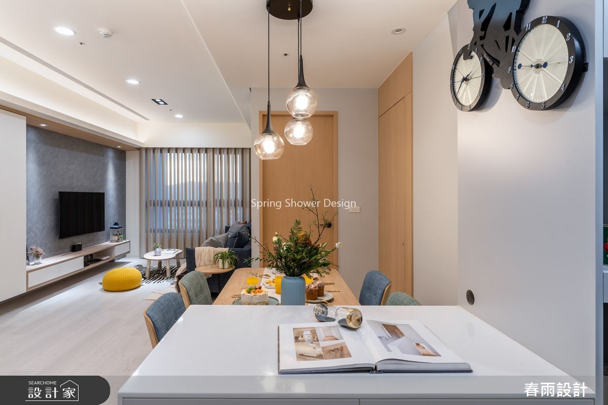 春雨設計以壁紙、超耐磨木地板、大理石、美耐板、木作、系統櫃的搭配應用,呈現現代風居家氛圍,將此間22.5坪、三房、單層、預售屋打造成舒適愜意的家庭空間,完成1位大人全家人的夢想之居。