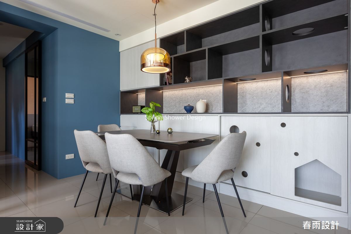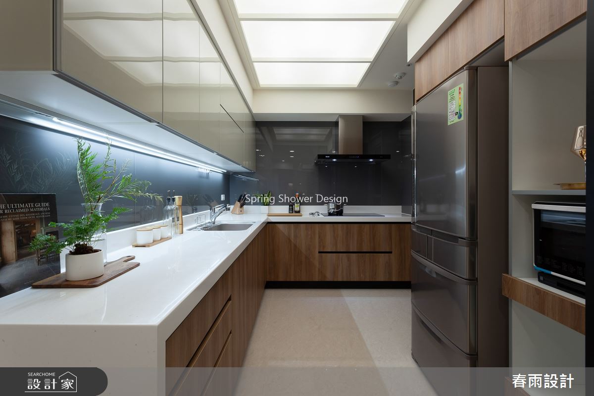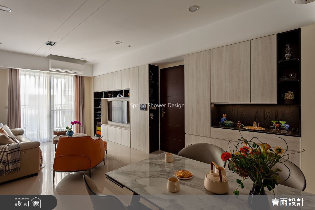 由春雨設計精心規劃的39坪兩房住宅空間。因應屋主需求,設計師運用現代風作為主軸,搭配超耐磨木地板、大理石、木作、系統櫃、美耐板、玻璃、鏡面,打造全家人的夢想家居。