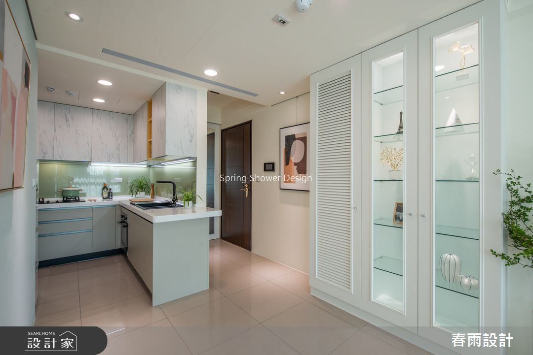 來自春雨設計的20坪美式風住宅案,屋主一家人共有1位大人,是一間單層預售屋的兩房格局,設計師藉由建材以大理石、人造石、木作、系統櫃、強化玻璃、烤漆玻璃的搭配應用,實現一家人的理想生活。