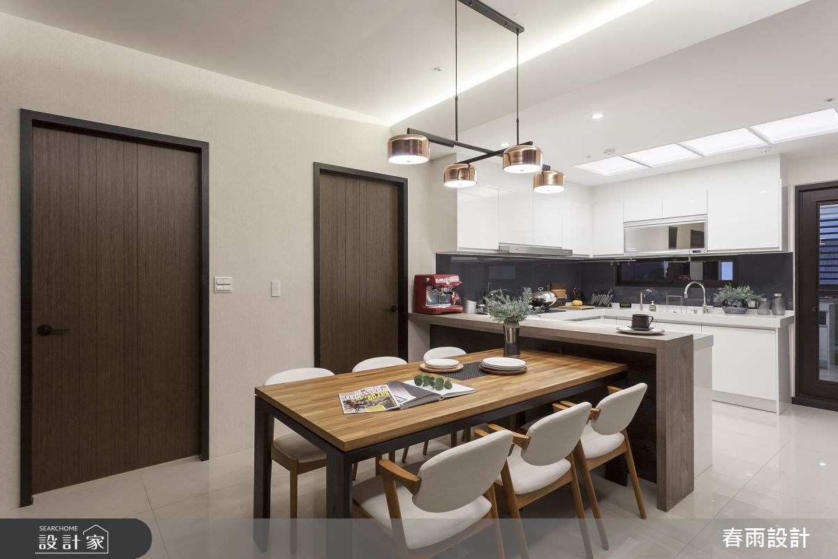 一家四口的 35.1 坪空間,以開放式的客、餐廳規劃,拉開長型格局共享區的活動範圍,轉角開放櫃的設計、簡約且實用的餐桌安排、大面櫃體規劃,順暢生活動線,完整生活機能。風格設計上,運用敞亮的白色系鋪陳,從牆面延續至收納櫃體,帶來清爽北歐風格;電視牆的立體感的錯落拼貼灰牆、用餐區淡藍色牆面與米灰收納櫃的安排,適度變換了色彩及建材,劃分出開放場域的機能,豐富了生活色彩。