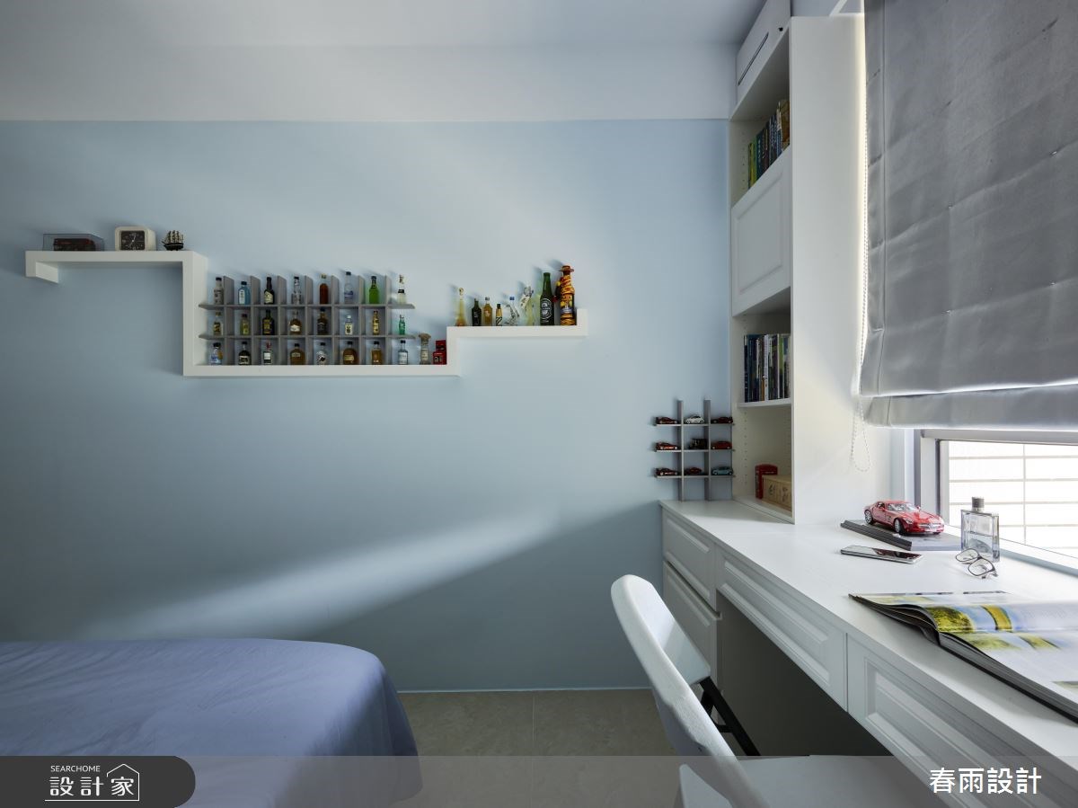 孩子大了,讓屋主萌生了換屋想法,選了擁有 4 房的 37 坪新居作為未來的避風港,並以放鬆溫馨的美式鄉村風,圍塑新生活獨有的優雅氣氛。 落塵區九宮格打造的鏡面牆,巧妙隱藏電箱並賦予檢視儀容、收納機能;抬頭看見的雕花明鏡及跳色矮櫃拼搭,製造令人印象深刻的端景視覺;文化石鋪排的側牆屏風,加強了開放公領域的隱私,特意鏤空的小窗台造型,為玄關區帶來採光,微微顯露的日常景況及窗外景致,不自覺引導視線入內。開放式的客、餐廳,藉由純淨的木百葉窗,注入居家生活應有的暖意,牆面上以彩度較高的藍色系鋪陳,定調色彩主軸,佐對稱語彙的白色線板櫃、質樸文化石電視牆,展現美式與鄉村交融的放鬆氣息。穿越深藍色調的廊道,迎來截然不同的主臥風格,立面以浪漫中帶有適合睡眠的舒服粉嫩色包覆,再利用大面衣櫃修飾樑柱及畸零格局,完整發揮坪效,替兩個人的小房間找到更多收納空間。 小編的最愛 視為公領域之一的開放書房,透過天花樑柱及半牆輕隔間,圍塑獨立範圍;書桌、鋼琴分屬兩側,靠窗處則賦予臥榻收納規劃,動線單純、活動範圍足夠,增加公領域機能及情感互動。