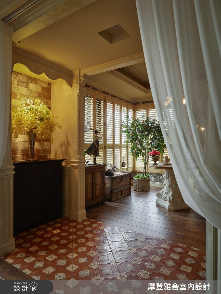 王思文、汪忠錠兩位設計師,心中極為憧憬西班牙的鄉村風設計,在西班牙旅遊之後,決定在自己的招待所盡情揮灑創意,以藝術手感設計結合鄉村語彙,將多種異國元素融會貫通,打造出令人無比驚豔的空間表情,快跟著小編一起走進來看看吧! 從玄關入門處開始,即以手繪隔屏做出動線導引,引領人進入夢想世界,並將木造材質結合既有建物門片,營造與世隔絕的古堡風格;餐廳藉由大面窗連結陽台,讓視野可延伸至戶外景色,於天花加入金屬餐燈,牆面施以仿壁爐造型,搭配延伸開放的格局視野,建構大器工整的端景畫面;客廳、餐廳之間以家具簡單區劃,同時保有場域之間的交流對話,窗面一貫地延續圓弧語彙,並配置木百葉創造紓壓氣息與調節採光,客廳盡頭則大膽規劃一整面泥造牆面,搭配燈光投射型塑立體視覺,構成活靈活現的古典壁畫,且在牆面融合展示櫃體,內部暗藏儲物空間,開啟機能的趣味表現形式;起居書房內藉由挑高斜木屋頂設計,挹注峇里島度假風韻,將手繪油畫的繽紛花樣揮灑於牆,帶來度假感十足的南洋風情! 小編的最愛 全室使用木紋添注復古色澤,並在玄關,客廳、臥房等每一處空間,貫徹設計師獨一無二的精心手繪,使人備感驚豔,提升整體的藝術氣息!裝修預算:500萬以上