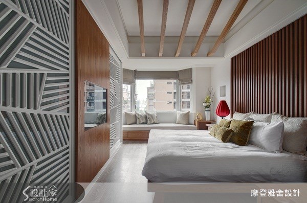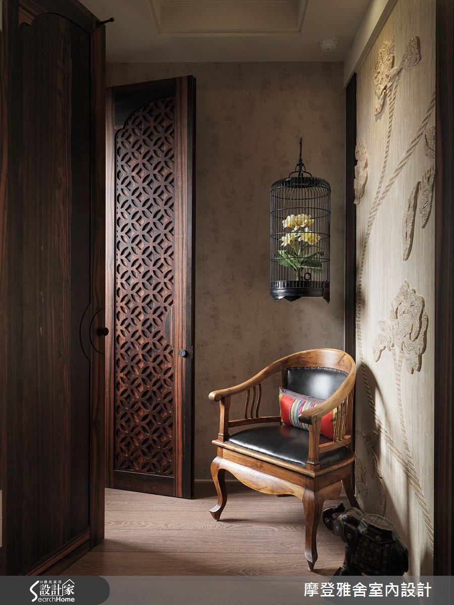 本案是位於台北市的中古屋,由於有風水上的考量,因此室內不考慮使用石材,但因屋主也不想使用壁紙,但卻又不希望牆壁過於單調,於是找來摩登雅舍做出巧思規劃;首先,在廳區採用進口壁板作搭配,並親自於牆面描繪了一朵牡丹花豐富空間表情,透過植物的藝術畫作,帶進鮮明且具悠閒氛圍的東方風格;書房空間則陳列中式椅凳、骨董茶几或略帶斑駁的斗櫃等,營造歷史悠久的氣質,搭配錢幣花樣的窗櫺或格柵,讓空間因光影變動產生不同表情;臥房領域則以大片白色和木色作為背景色彩,營造禪意氛圍,同時加入紅色造型燈飾,透過鮮豔色畫龍點睛,型塑視覺焦點。裝修預算:500萬以上