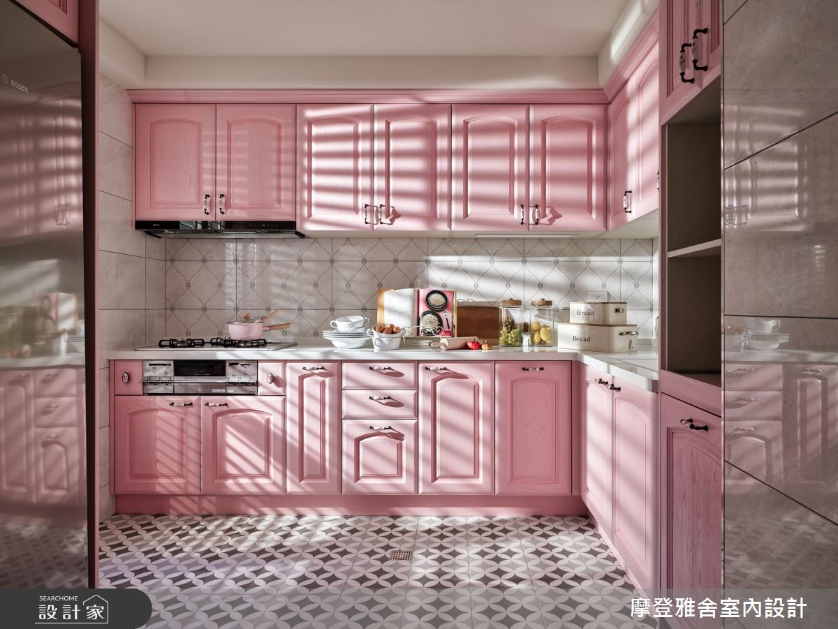 在台北這個 50 坪的家,女主人長期生活於國外,她從異國飛回台灣,與白領男主人結了婚,兩個人,一起在這個家編織出了美好的生活樣貌;同時,他們也找來了設計師,在居宅內注入鄉村風語彙,不僅強調風格美感,更融合體貼的人性化設計,成功規劃出兩人夢想中的生活感居家! 走進空間裡,即可見地坪的花卉圖案磁磚,簡單地做出玄關領域定義,放眼望去,則是一道拱門設計,形成居宅中的溫馨端景;客廳空間則呈現濃郁柔軟的香草色調,於天花板、線板、櫃門展現立體層次,牆面上採用的是輕淺而柔和的壁紙,襯托出一股不甜膩的清新味道,並在窗前規劃百葉折門,引進戶外的暖洋洋日光,透過一張座椅、幾道光影,營造讓人回味無窮的溫柔意境;廚房則配置格子門,與餐廳做出分界,餐廳旁則是孩子們的遊戲室,規畫大片的清玻拉門,使採光得以流通於各角落,並在遊戲室內設計一幅黑板牆,繪出一家人的生活記憶,裡頭則陳列隨時可挪動的家具,替領域未來的使用主題增添可能性;來到主臥,則以壁紙、窗簾等注入輕柔色彩,搭配的床架寢具也與空間調性相呼應,完美展現居住者性格! 小編的最愛 設計,不只講求視覺美感,更須體貼人性。由於男女主人都是高個子,設計師特別在檯面高度做出客製規劃,像是廚房流理台、客衛的洗手台等,皆刻意拉高了水平線,給予居住者最舒適的生活體驗! 裝修預算:500萬以上