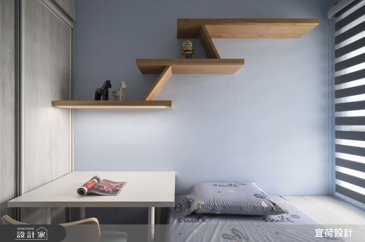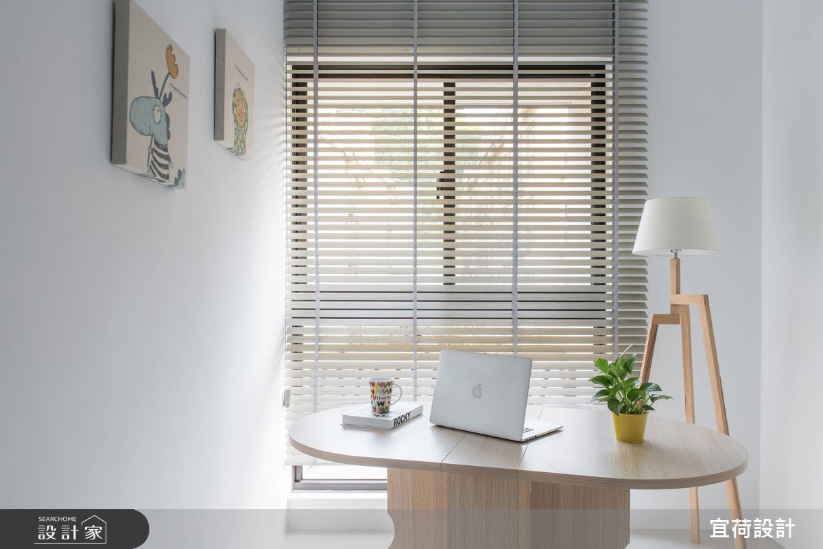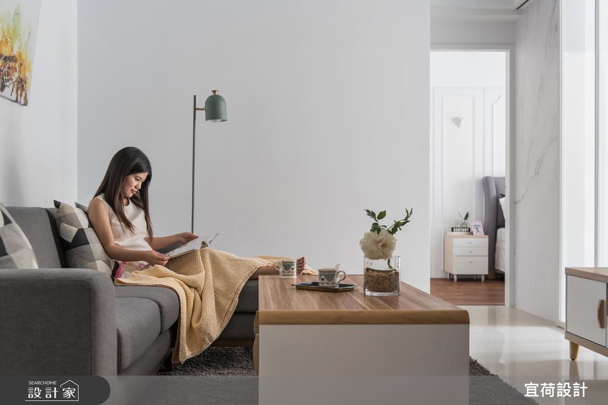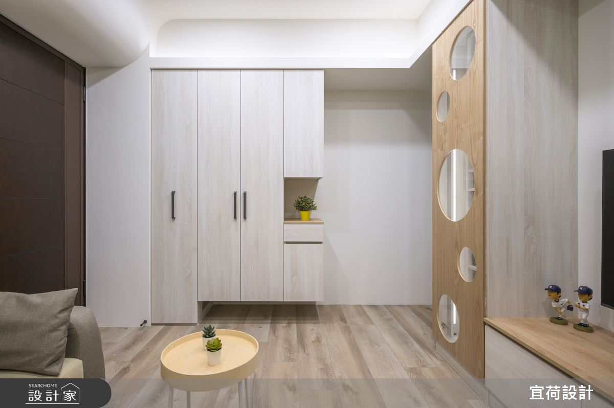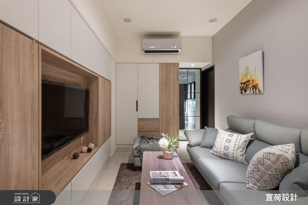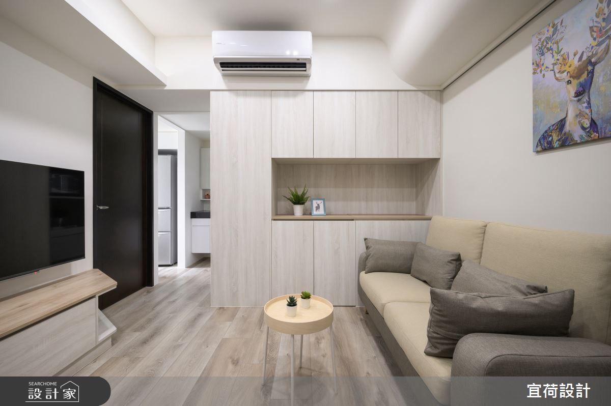 宜荷設計以乳膠漆、木地板、木作貼皮、系統板材、磁性板的搭配應用,呈現簡約風居家氛圍,將此間15坪、兩房、單層、預售屋打造成舒適愜意的家庭空間,完成2位大人全家人的夢想之居。