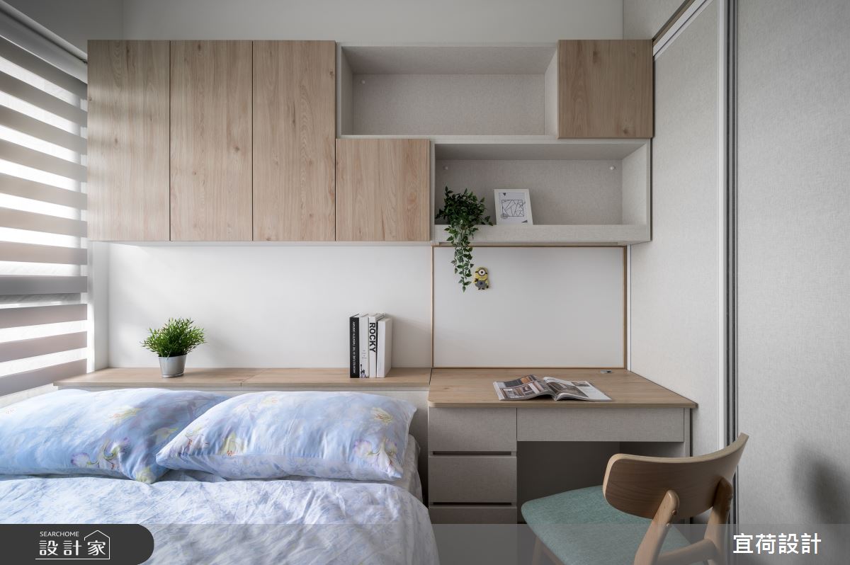15 坪簡約風新婚宅,以白色底蘊搭配溫潤木紋,構築 2 人世界清新溫暖氣氛。考量新成屋狀況佳但採光不足缺陷,設計師發揮巧思減少格局變更,降低屋主裝修預算,而客製化系統櫃設計,滿足屋主收納需求外,兼具縮短工期的優勢。 玄關區屋主介意的開門見灶疑慮,設計師以雙面活用的收納櫃化解,省去變更廚房位置的大工程,並為玄關、廚房擴張收納空間。考量公領域的敞亮度,書房隔屏改以清玻璃材質,解構實牆阻斷的視線與光源,讓豐沛採光流入客廳;電視牆選擇以低矮收納櫃取代,不做滿的手法抬升小客廳的視覺高度,並保留視線交流,拉近2人世界的生活距離。開放式 L 型廚房,因位處公領域角落,擁有既開放又獨立的特色,僅透過更換淺木門片的混搭美學,打造一氣呵成的暖木簡約風。 小編的最愛 主臥以純白色包覆壁面、收納櫃,佐線板俐落典雅線條、柔和光暈,勾勒浪漫意象;床鋪及書桌化妝區置中設定,讓床頭櫃、衣櫃左右對稱鋪排,以配合夫妻一人一邊使用機能的規劃。