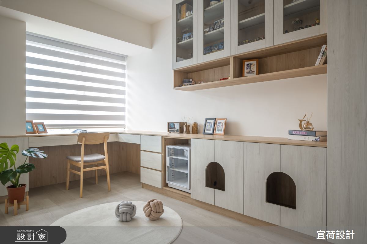 由宜荷設計精心規劃的32坪一房住宅空間,家庭成員一共有1位大人、3位小孩。因應屋主需求,設計師運用侘寂風作為主軸,搭配乳膠漆、六角磚/蜂巢磚、花磚、木紋磚、不鏽鋼、灰鏡、鍍鈦金屬、鋼刷木皮、系統板材、大理石、磁磚、木百葉、水磨石、珪藻土、石材、噴漆、司曼特,打造全家人的夢想家居。