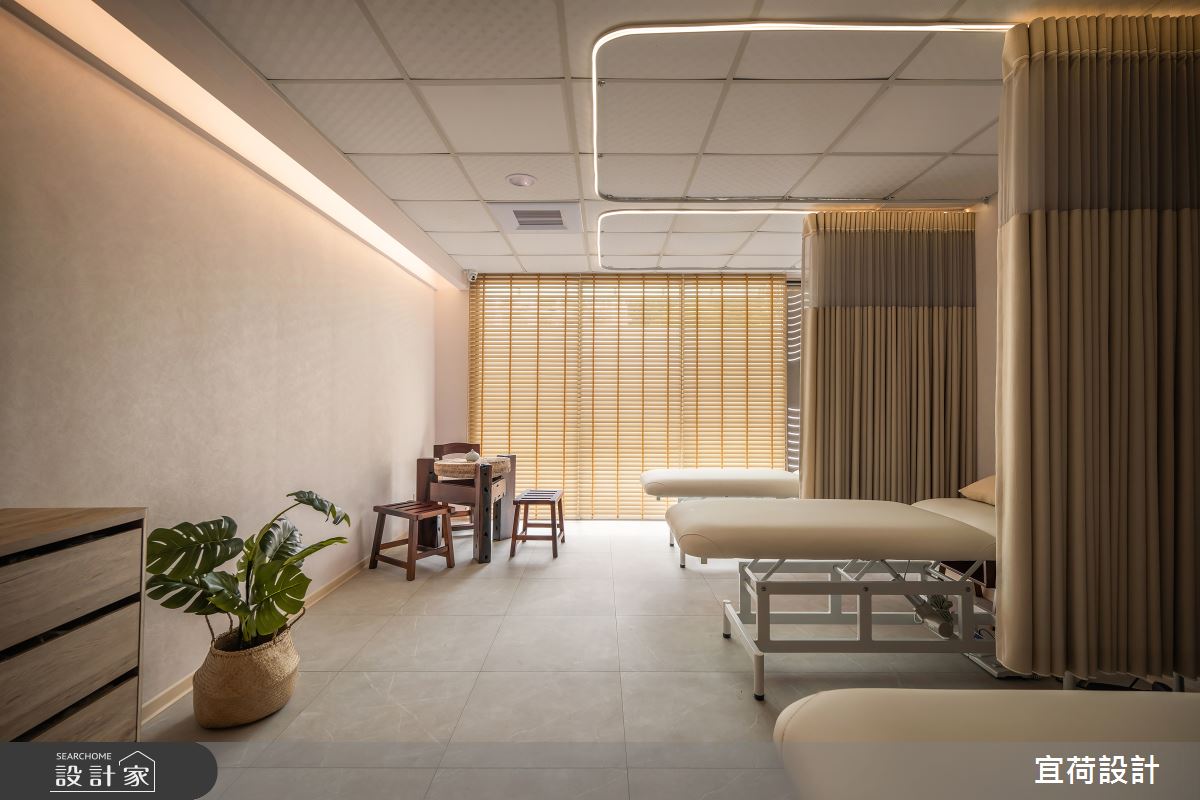宜荷設計以仿石漆、乳膠漆、花磚、壁紙、系統板材、磁磚、水泥/水泥粉光、木百葉、人造石、軌道燈、噴漆的搭配應用,呈現現代風的風格氣息,將此間46坪老屋(41~50年)優雅詮釋成舒適愜意的商業空間。
