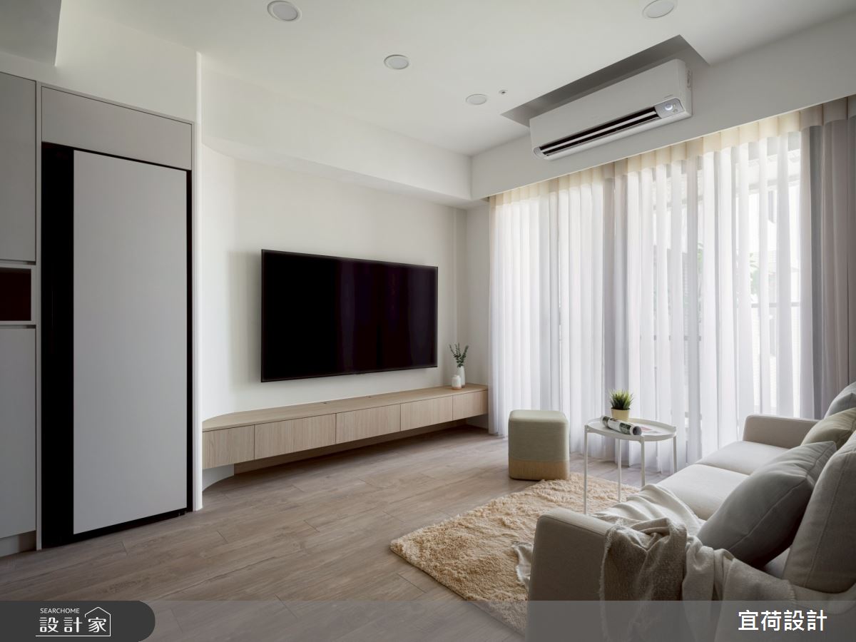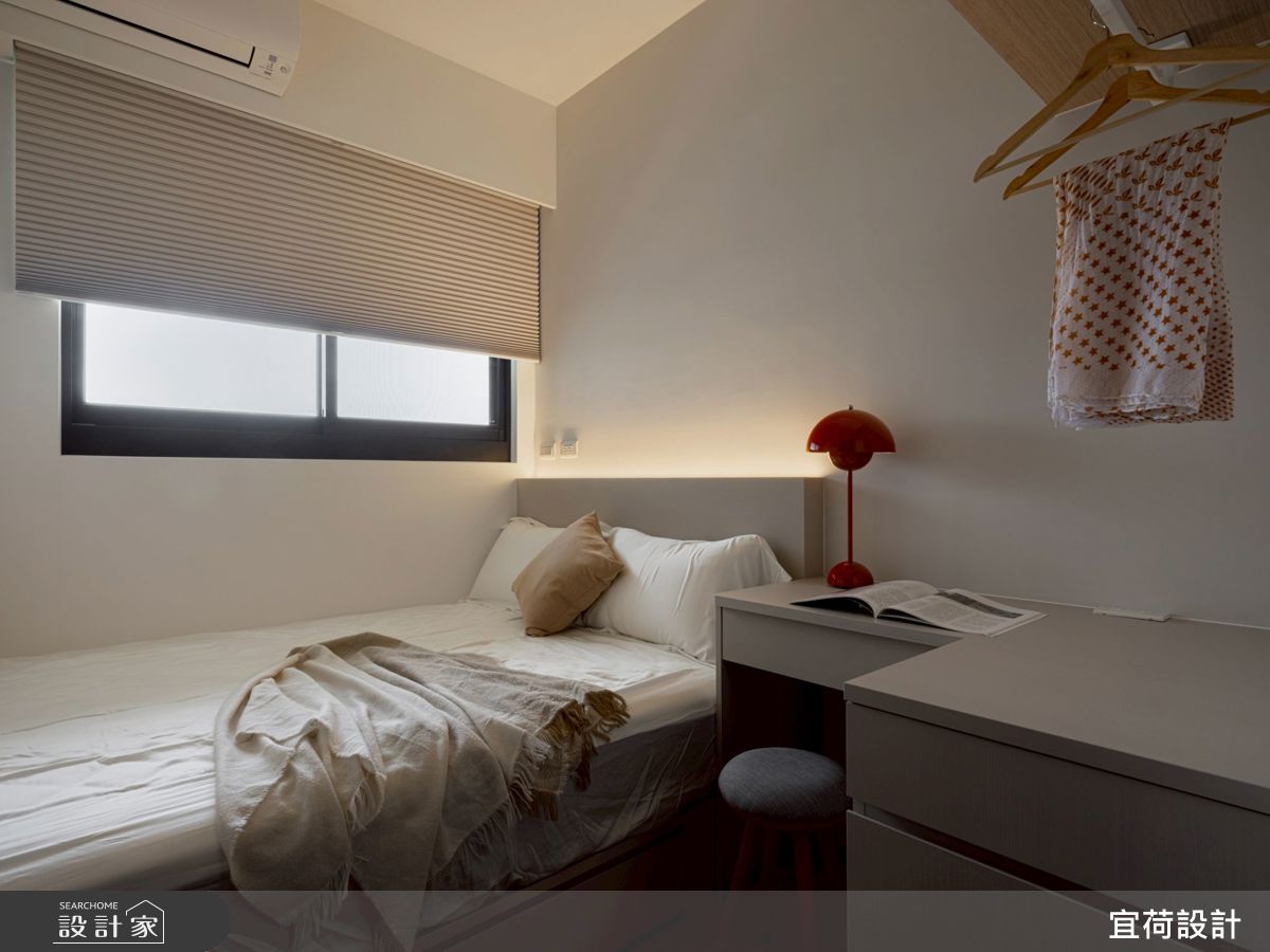 本案為宜荷設計的15坪現代風預售屋設計作品,格局為單層一房的居住空間。居住成員包含1位大人。全室建材的搭配,應用乳膠漆、壁紙、超耐磨木地板、木作貼皮、系統板材、磁磚、噴漆,展現溫馨的居家氛圍。