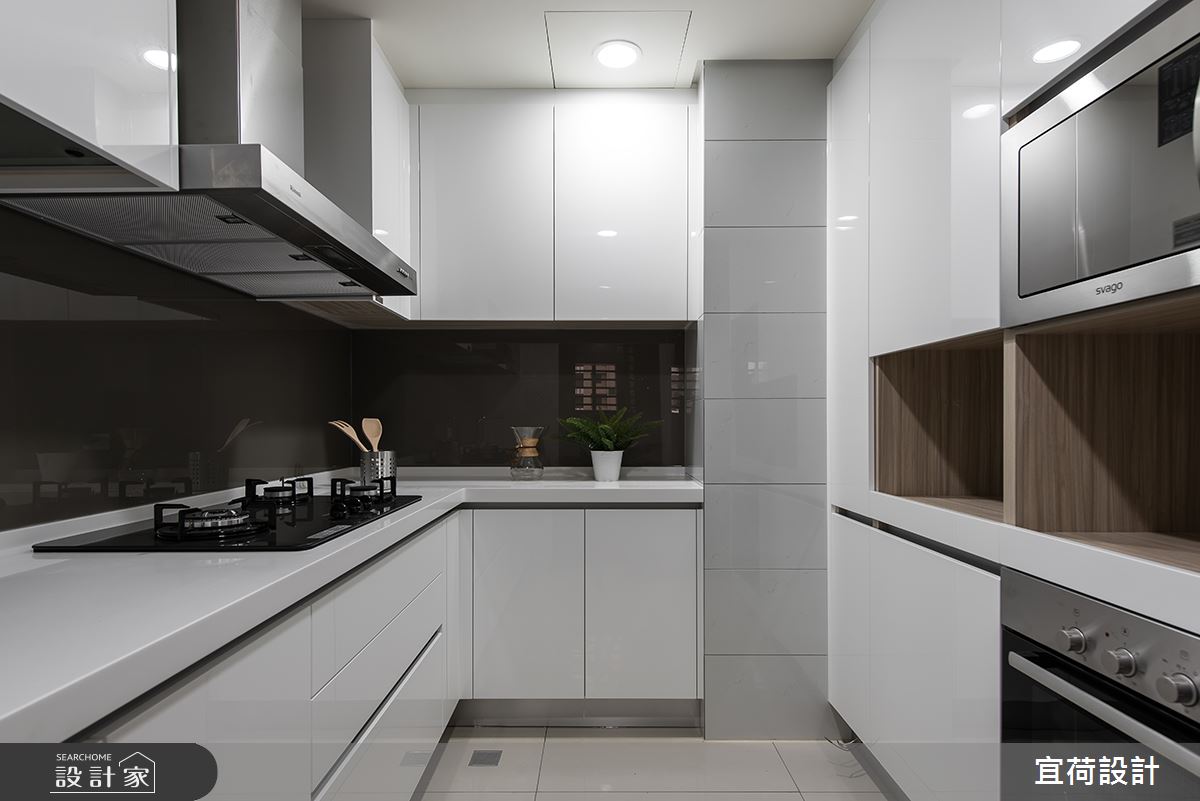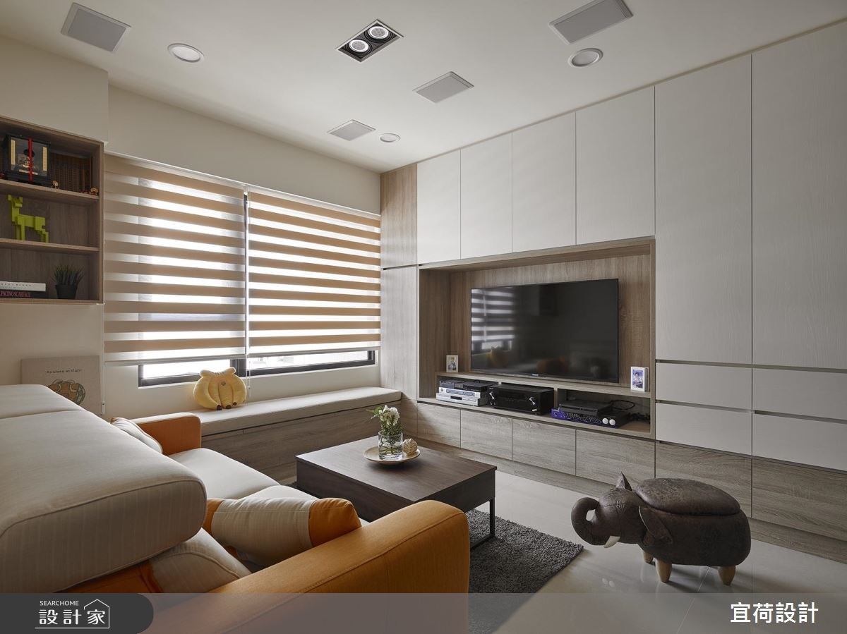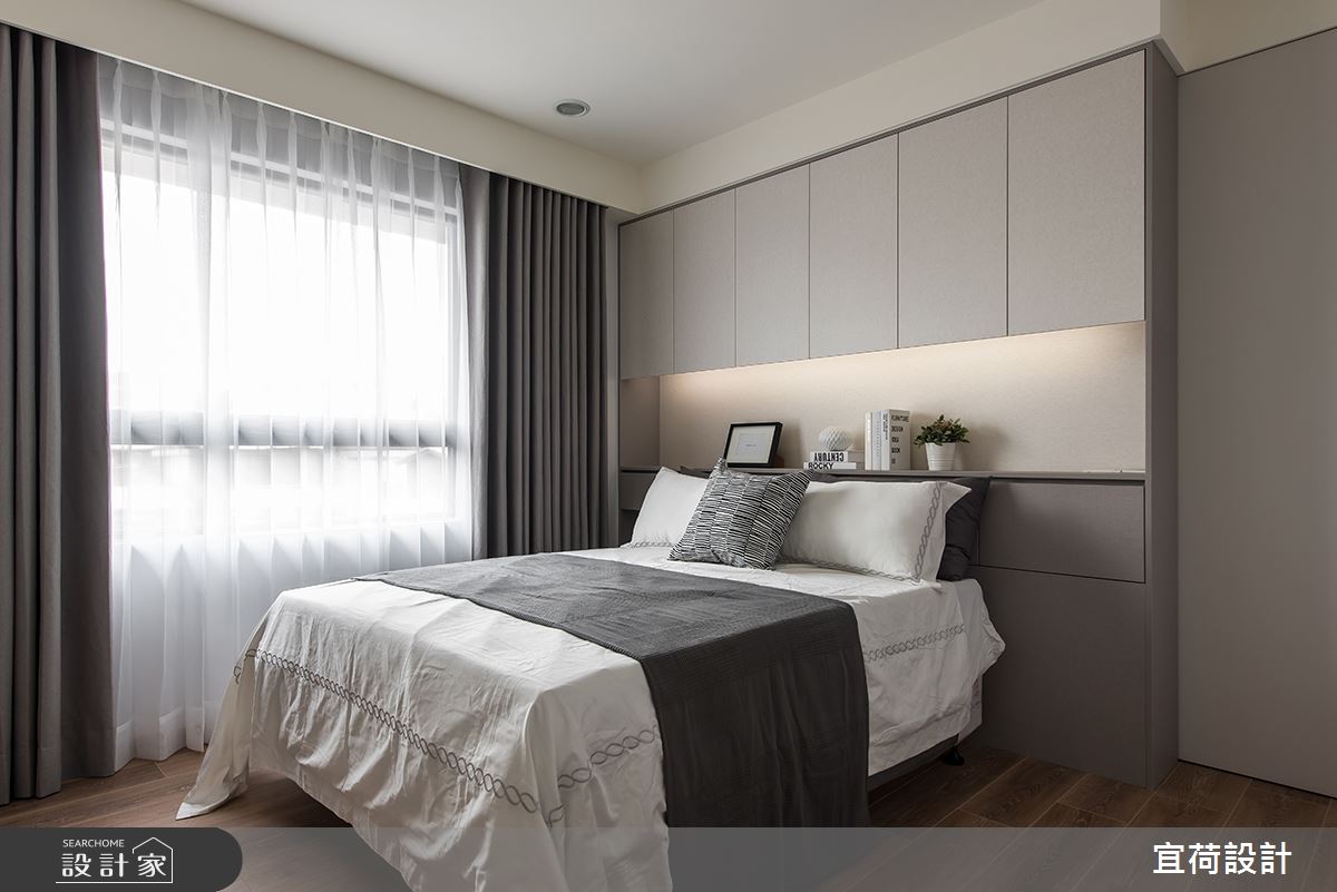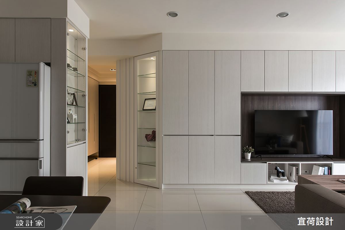 生活可以簡簡單單,平凡就是最大的幸福!身為小資族的屋主,在年底即將步入禮堂,希望能在有限的預算下,發揮空間最大的效益,與設計師討論後,善用系統收納的環保、輕便與快速特性,僅45天便裝潢施工完成,打造舒適簡約的新婚小宅! 入室後的玄關空間狹小,右側櫃體拉到後方客廳的沙發位子,讓出日常動線;並打破制式化的單調櫃體,左側收納櫃結合檯面跳色與投射燈光的展示設計,伴隨植栽或風格物件的陳列,壁面則懸掛淡雅色系的畫作,營造清新、愜意的迎賓氣息。將原有電視牆與沙發背牆格局調整,解決沙發壓樑與背向大門之格局,並利用電視牆整合多功能儲藏機能,電視牆的兩側挑選深入木紋門片,挹注溫馨情懷,在銜接天花板大樑與地面的櫃體則安排白色門片,降低深色量體的視覺感,讓空間更顯開闊;而原本一進家門就會看到廁所,藉由隱藏門設計巧妙化解尷尬狀況;而客廳無採光的問題,也在廚房採鋁框與清玻璃的活動拉門,解決了光線與油煙問題,成功讓戶外光線間接引入,提高公領域的明亮度。 小編的最愛 主臥的床頭以鵝黃色為基底,在大樑處透過弧型的線條美化,反而產生柔和、溫潤風格感受,避開空間壓迫的可能性;同時也藉由系統櫃設計來滿足日常衣物的收納需求。