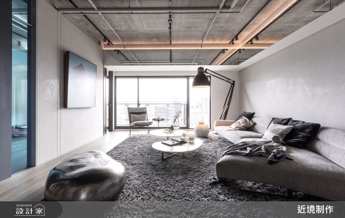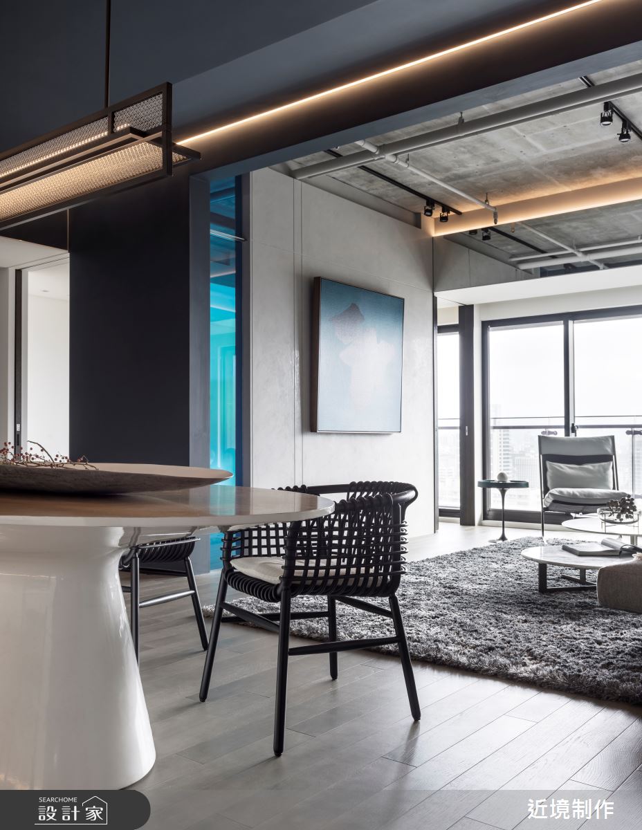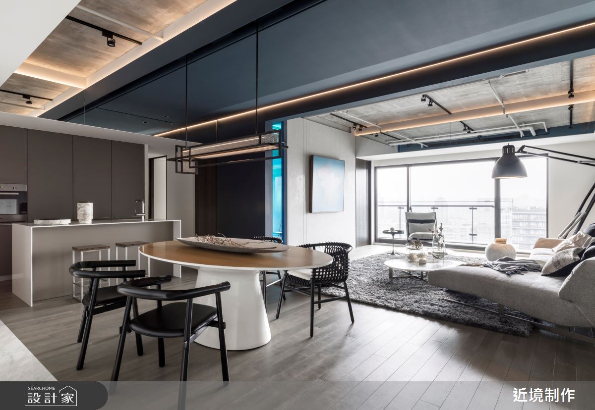 近境制作以木作、鐵件、玻璃、馬來漆的搭配應用,呈現工業風居家氛圍,將此間80坪、四房、新成屋(5年以下)打造成舒適愜意的家庭空間,完成全家人的夢想之居。