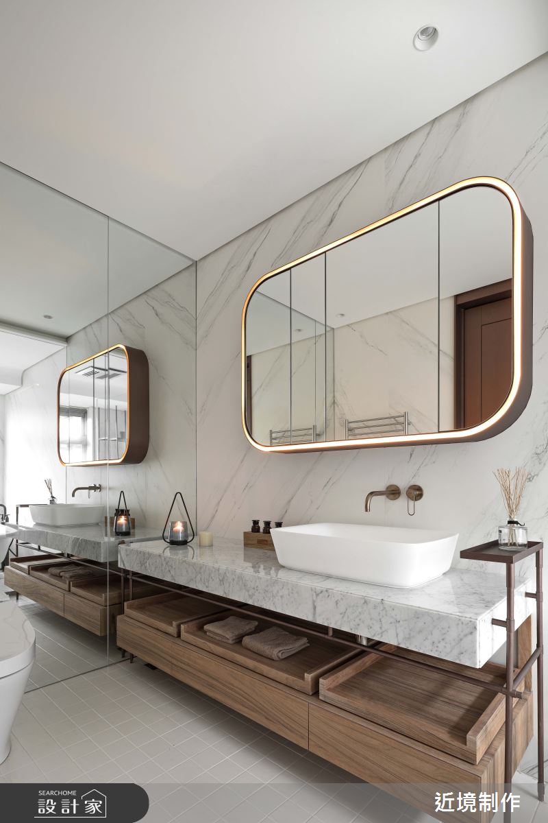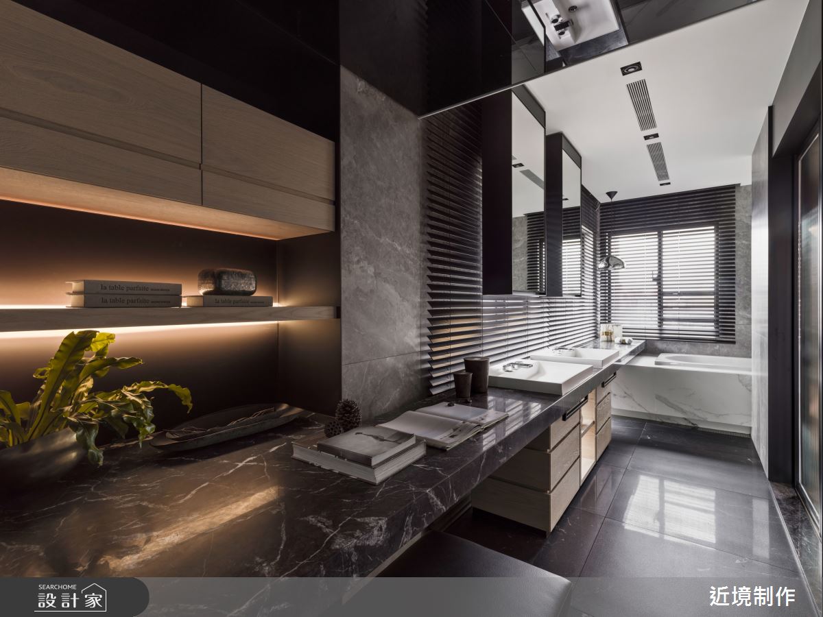 由近境制作精心規劃的105坪三房住宅空間。因應屋主需求,設計師運用奢華風作為主軸,搭配石材、深色木皮、手刷銅、鍍鈦、皮革、淺色木地板,打造全家人的夢想家居。