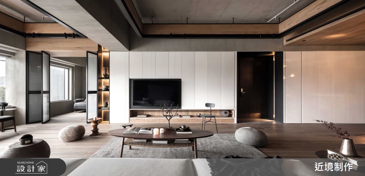 近境制作以特殊漆、木皮、木格柵的搭配應用,呈現現代風居家氛圍,將此間42坪、三房、新成屋(5年以下)打造成舒適愜意的家庭空間,完成全家人的夢想之居。