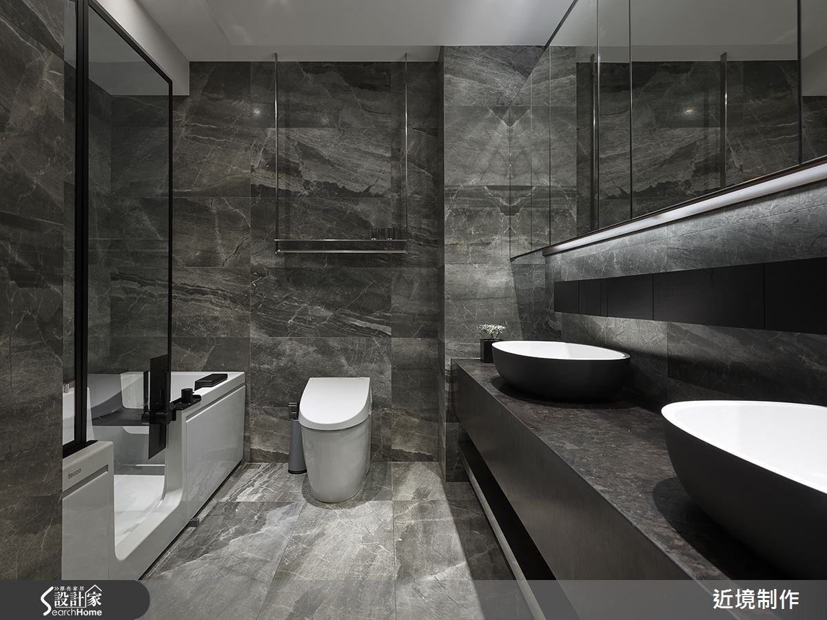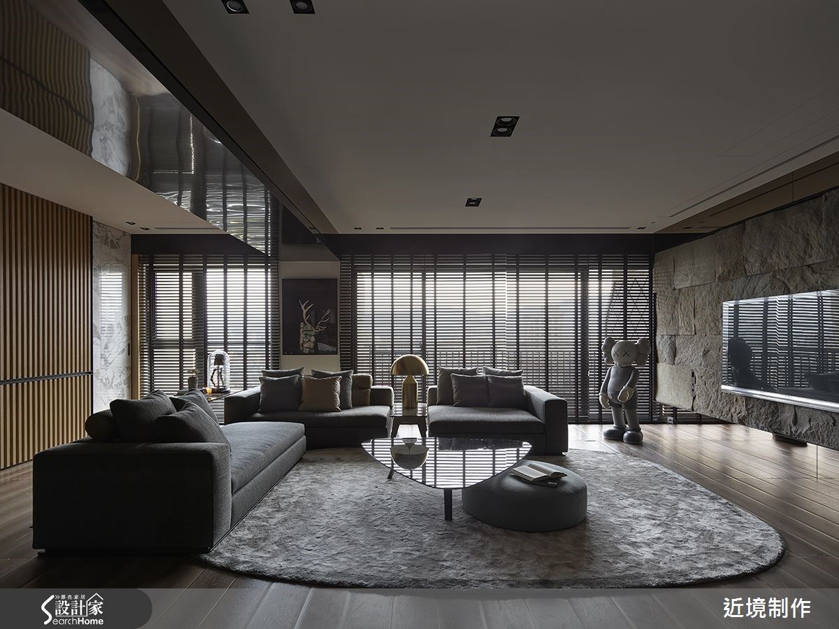 53 坪的住宅空間,設計師給予公領域開放規劃,透過線條的沉穩律動闡述視覺層次,並加入石、木、鍍鈦等材質潤色空間,搭配光影效果,傳遞空間多變的生活面向,快跟著小編一起走進來看看吧! 一走進玄關,可見牆面飾以鏡面與燈光,加入俐落的線條妝點,凸顯簡約生活哲學;客廳融入純淨的木色與陽剛的石色,配合造型簡潔的家具,互補搭配出自然穩定的氛圍,並在沙發後方牆面鋪陳律動的線性表情,平衡整體空間重量;餐廳、客廳之間則相互連貫,透過天花與地坪的材質轉換,無形中界定彼此範圍,且沿著居家廊道立面作出展示櫃設計,融入燈光效果,在明暗交錯之間映照出視覺趣味性;臥房突破了傳統的硬體牆界定形式,挹注流暢流動的動線設定,並經由窗戶導入斑駁光影,塑造輕盈美好的休憩時光;更衣間選用黑色系為基底,加入層板作出堆疊線條,並給予燈光投射,創造出帶有個性魅力的空間特質! 小編的最愛 衛浴延續石色與木色的色彩底調,搭配鏡面與反光材質妝點,瞬間提升空間質感,且融入直角與圓弧語彙,使空間立體不失溫婉!