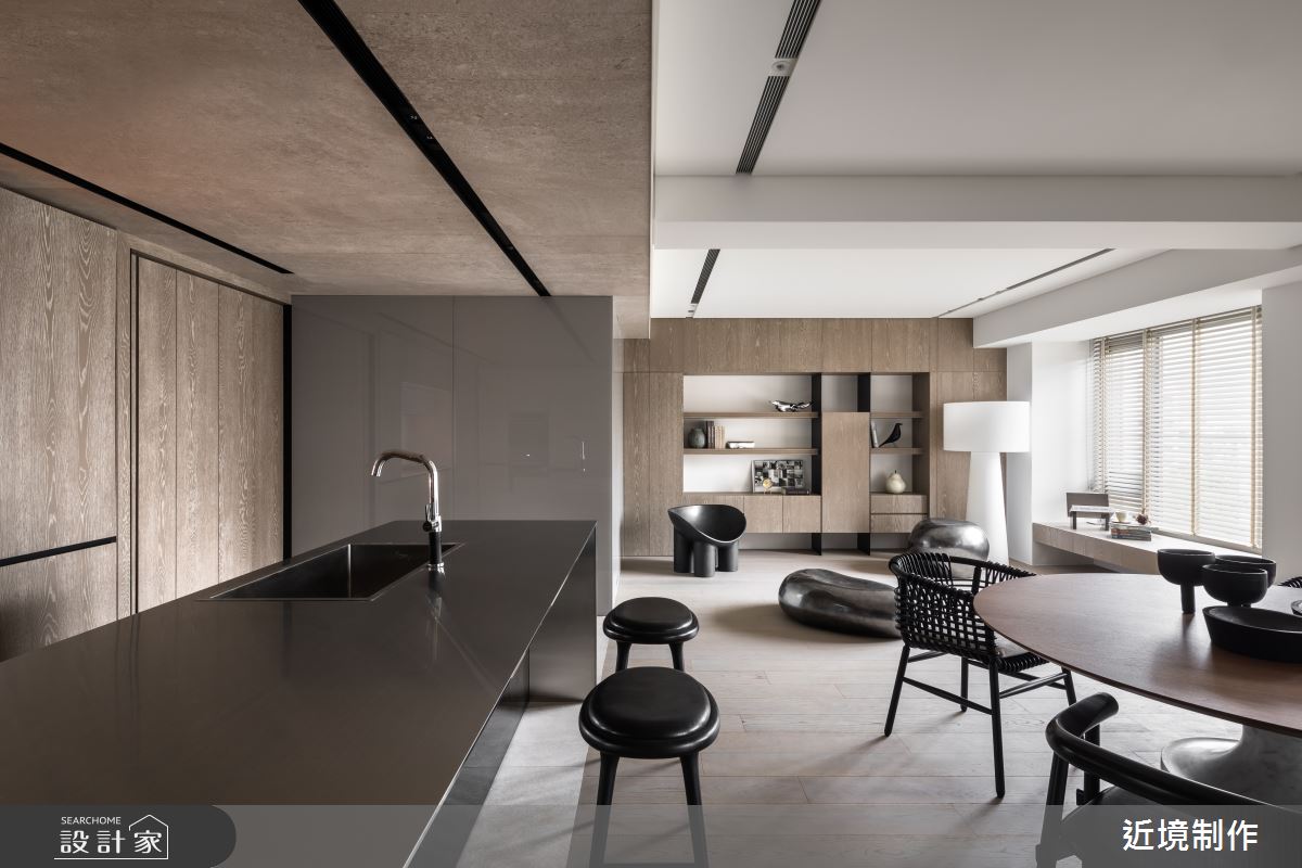 近境制作以石皮、木皮、木地板的搭配應用,呈現現代風居家氛圍,將此間121坪、四房、新成屋(5年以下)打造成舒適愜意的家庭空間,完成全家人的夢想之居。