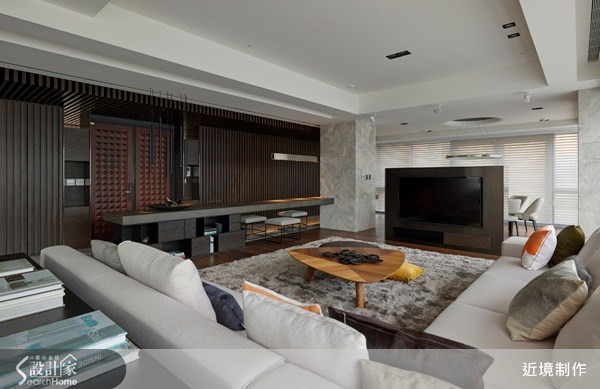 本案位於台北市士林區,116坪五房兩廳的現代風設計。三面極好的採光為基調,運用不同層次的堆疊、不同媒材的混搭,創造出帶有律動感的視覺美感;開放式的客餐區型塑出流暢的動線、無壓的感受,運用格柵牆設計隱藏式收納,利用「數大就是美」的重複性序列,表現空間氣度的磅礡;在二樓廊道處顛覆材質運用的既定思維,在石牆內嵌入亂數呈現的開放式層架,打造如洞窟般的收納,充分顯示從實用機能出發,卻以天馬行空創意,打破形式限制的巧思。主要建材:石材、鐵件、實木皮、鍍鈦、木地板、皮革。