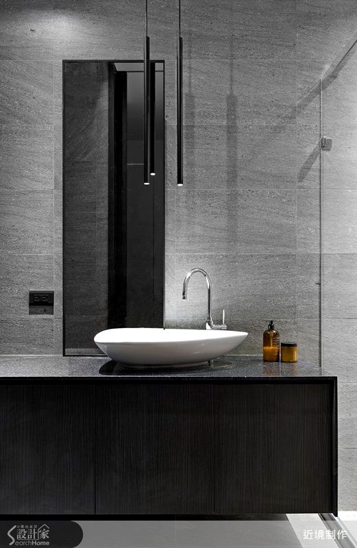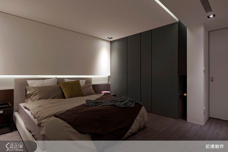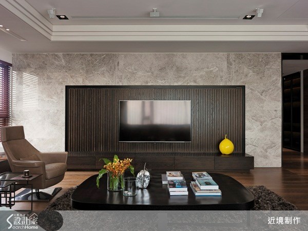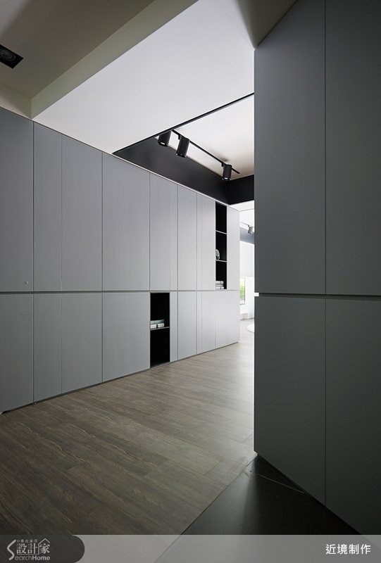 以最簡潔的線條,勾勒家的樣貌,用最素樸的材質,呈現設計的精煉,近境制作一直以來,透過概念式發想以及室內建築架構,搭配簡約而有品味的軟裝布置,將現代風格的空間美學,發揮得淋漓盡致。回到家就能感受靜謐而休閒的生活氛圍,這是工作忙碌的屋主每天最期盼的時刻。於是近境制作的唐忠漢設計師,透過開放式的格局,以及以吧檯、餐桌為主軸的動線安排,讓敞亮的公共空間在無隔間設計下,透過地面材質的不同,區畫出餐廳、客廳、閱讀區等不同生活場域,讓空間擁有多元使用的彈性與餘裕。玄關入門處的石材地坪延續至吧檯與餐桌延長線上,若隱若現的格柵則界定了內、外的分際。從客廳區延伸至閱讀區則採用溫潤的柚木地板,讓屋主夫妻與年幼的孩子得以共享天倫。電視牆的設計明顯看出近境制作一直以來用室內建築手法建構空間的特色,以木皮包覆的樑,延伸至玄關區的天花與壁面,相同材質再度於餐廳一側立面出現,透過材質的重複,讓空間調性一致。在色彩規劃上,全屋均以黑、白、灰三色及溫潤的原木色調,刻畫出自然而現代的居家氛圍。閱讀區一整片黑色櫃體中,點綴性出現木皮抽屜;客廳白色電視牆與木樑的雙色搭配,在小孩房收納展示櫃再度呼應,雙色運用的色彩配置,讓空間呈現溫馨而活潑的氣氛,也是近境制作近年來作品中難得一見的設計手法。