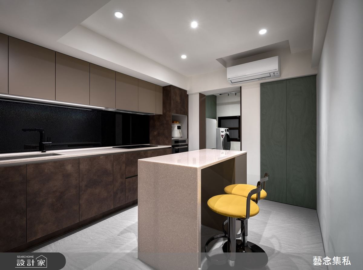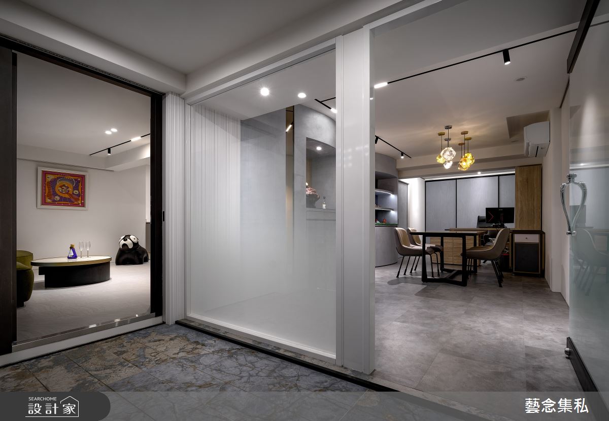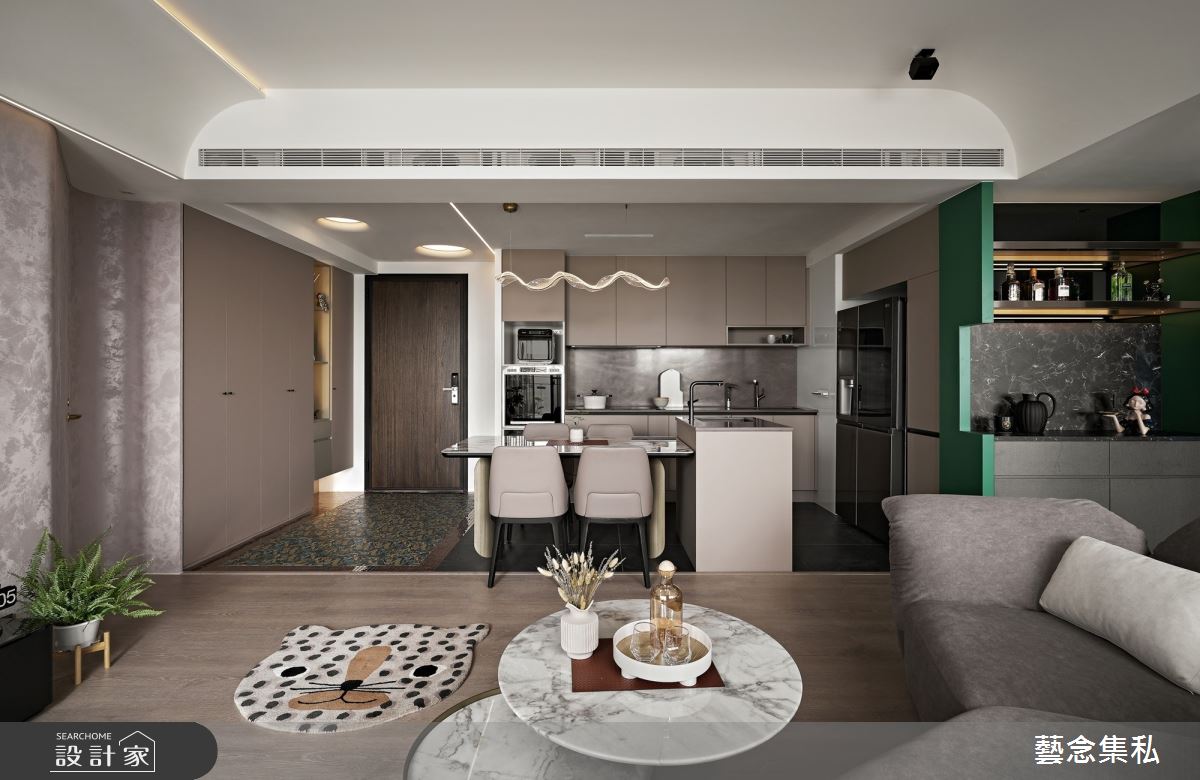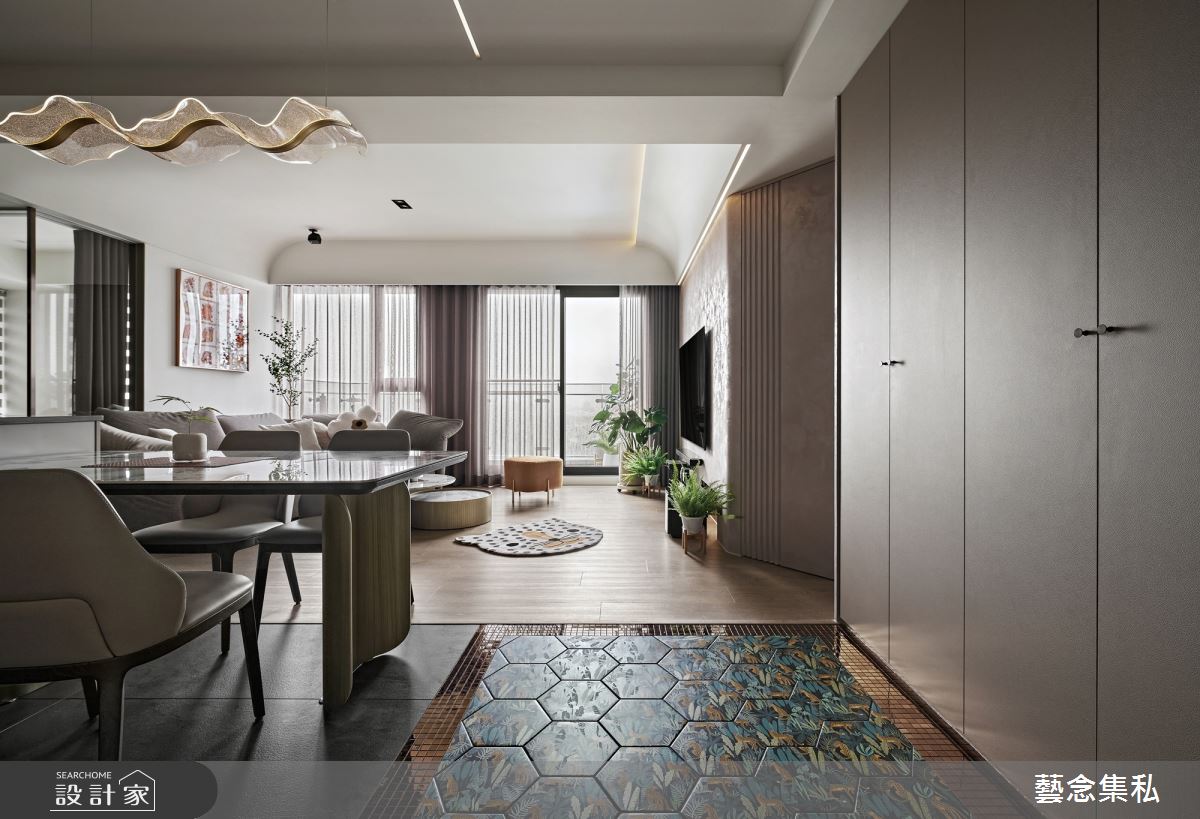 藝念集私空間設計以乳膠漆、六角磚/蜂巢磚、花磚、壁紙、石英磚/拋光石英磚、不鏽鋼、鐵件、烤玻、烤漆、系統板材、磁磚、水泥/水泥粉光、人造石、軌道燈、石材、噴漆、特殊漆的搭配應用,呈現現代風的風格氣息,將此間31.8坪老屋(41~50年)優雅詮釋成舒適愜意空間。