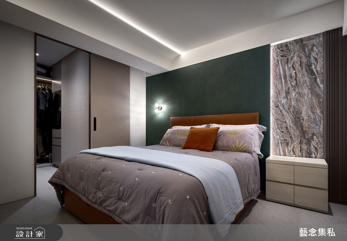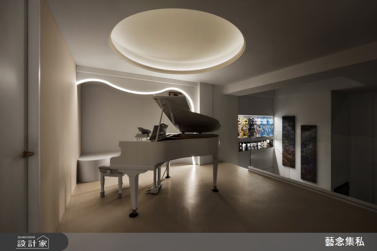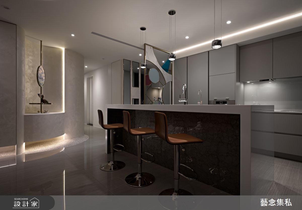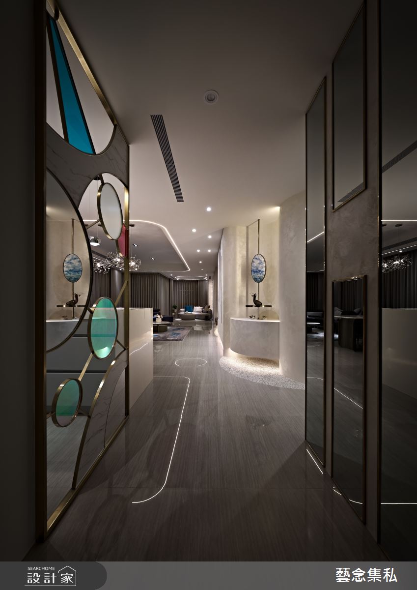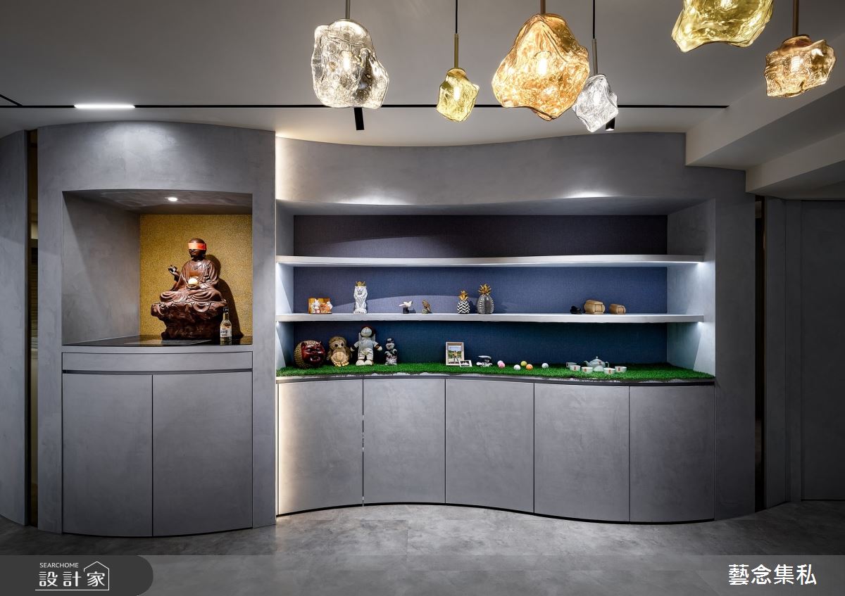 藝念集私空間設計以乳膠漆、六角磚/蜂巢磚、花磚、壁紙、石英磚/拋光石英磚、不鏽鋼、鐵件、烤玻、烤漆、系統板材、磁磚、水泥/水泥粉光、人造石、軌道燈、石材、噴漆、特殊漆的搭配應用,呈現現代風的風格氣息,將此間31.8坪老屋(41~50年)優雅詮釋成舒適愜意空間。