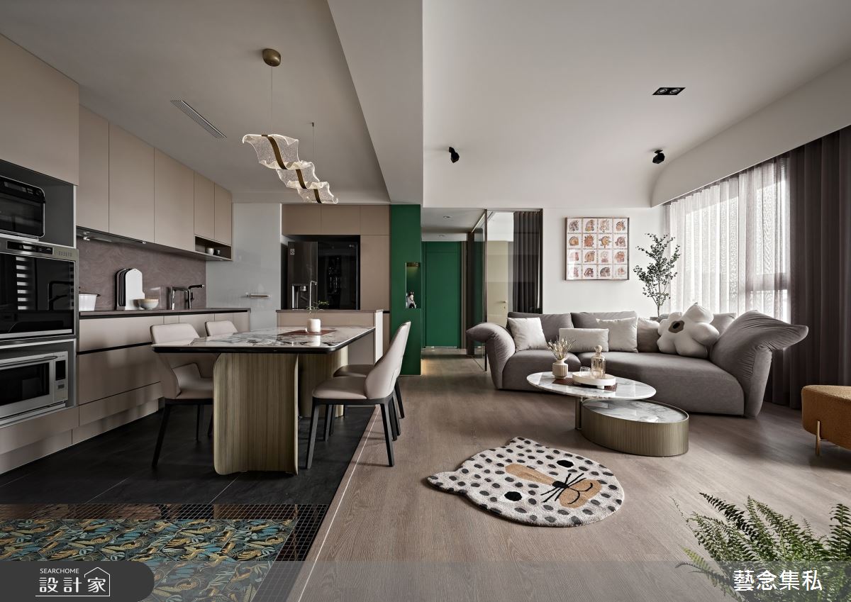 藝念集私空間設計以乳膠漆、花磚、壁紙、大圖輸出、海島型木地板、木紋磚、石英磚/拋光石英磚、不鏽鋼、鐵件、茶玻、烤玻、鍍鈦金屬、木作貼皮、烤漆、鋼刷木皮、系統板材、大理石、磁磚、賽麗石、軌道燈、石材、繃布、線板、噴漆的搭配應用,呈現現代風居家氛圍,將此間30坪、兩房、單層、老屋(16~30年)打造成舒適愜意的家庭空間,完成2位大人全家人的夢想之居。