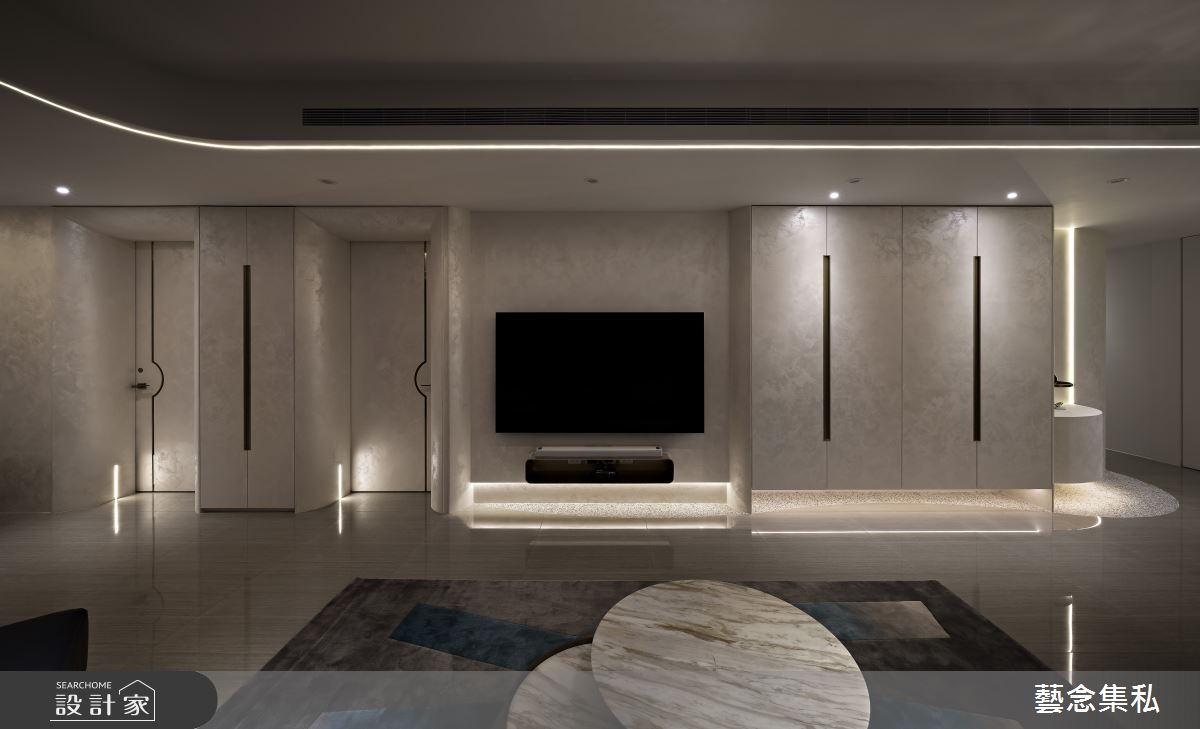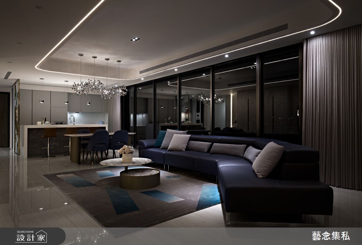 本案為藝念集私空間設計的100坪現代奢華風新成屋(5年以下)設計作品,格局為單層三房的居住空間。居住成員包含2位大人、1位小孩。全室建材的搭配,應用壁紙、水泥漆、海島型木地板、鐵件、鍍鈦金屬、烤漆、壓克力、系統板材、大理石、磁磚、噴漆,展現溫馨的居家氛圍。