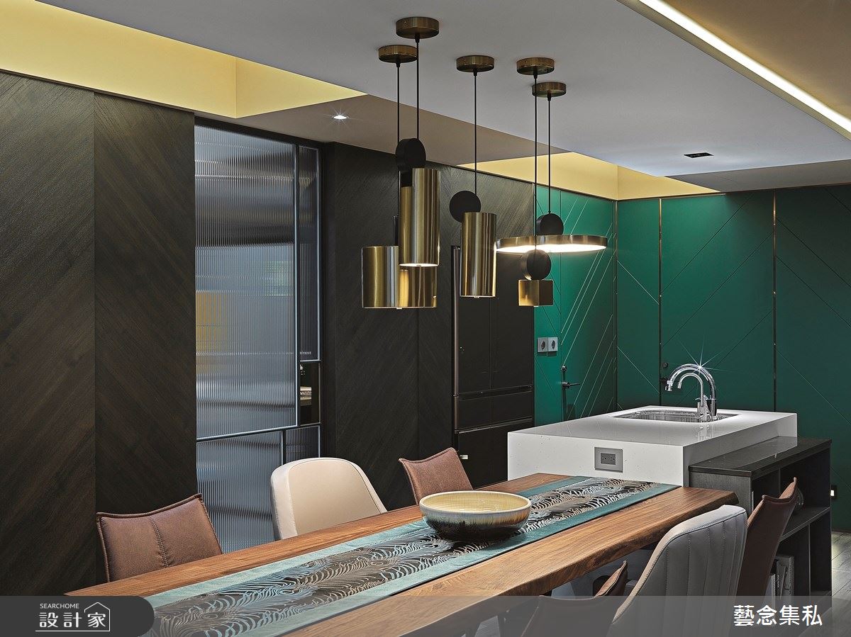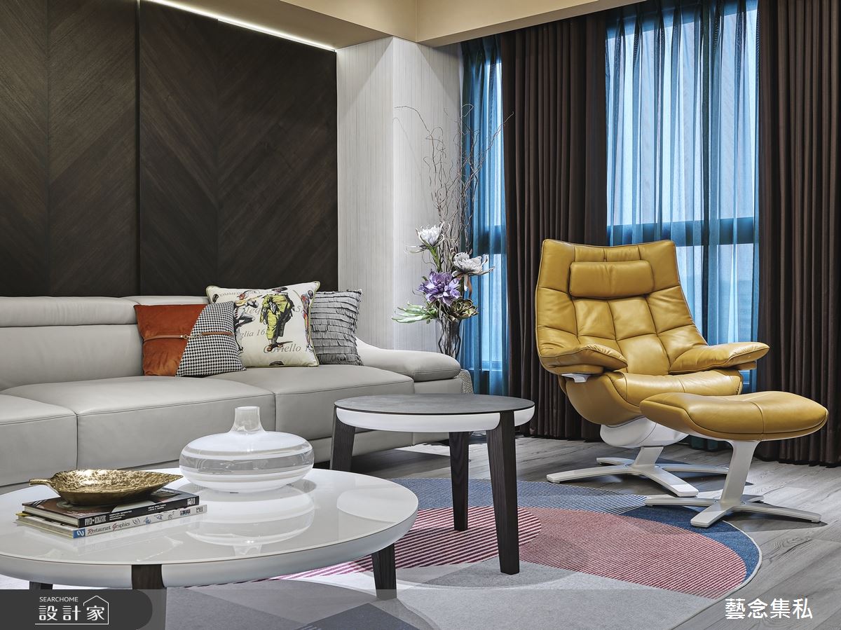 擁有一雙兒女的屋主夫妻,期望能在繁忙都市生活中,坐擁專屬一家四口的放鬆居宅,於是找來設計師幫忙,透過由裡到外、無微不至的高級訂製手法,以五感設計概念為導向,替居家空間注入人性溫度,建構出時尚抒放的度假宅邸,快跟著小編一起走進來看看吧! 玄關處,以灰白色幾何立體磚鋪貼牆面,搭配具設計感的單椅、桌几與貓頭鷹飾品,開啟充滿藝術感的入門印象;廳區於地面作出不同材質拼接,透過紋理及觸感差異,隱性劃分空間場域,延伸出不同的生活動線,客廳電視主牆則採以皮革繃板、鈦金條壓邊鑲嵌灰鏡,展現精品質感,兩側讓主臥門片、櫃體相互對應,展現端莊工整的氣韻,天花加入了斜面或線條修飾、消弭大樑壓迫感,並在餐廳作出圓形天花板造型,對照圓盤餐桌,帶入大器圓融的氛圍,後方的開放櫃體以花卉圖紋及綠色交互穿插,構成曼妙的展示端景,一旁連結的是開放吧檯和廚房,融入圓弧導角的牆面線條、並植入展示機能,創造放鬆的用餐情境;主臥電視牆加入波浪線板語彙,巧妙揉入少量綠色,襯托紫色床頭與窗簾的浪漫表情,詮釋居者的時尚精神! 小編的最愛 主臥衛浴給予加大的雙洗手檯檯面,讓使用上更舒適無虞,並選用石材、鏡面等建材,搭上燈光點綴,彰顯雍容質感,營造有如精品飯店般的低奢體驗!