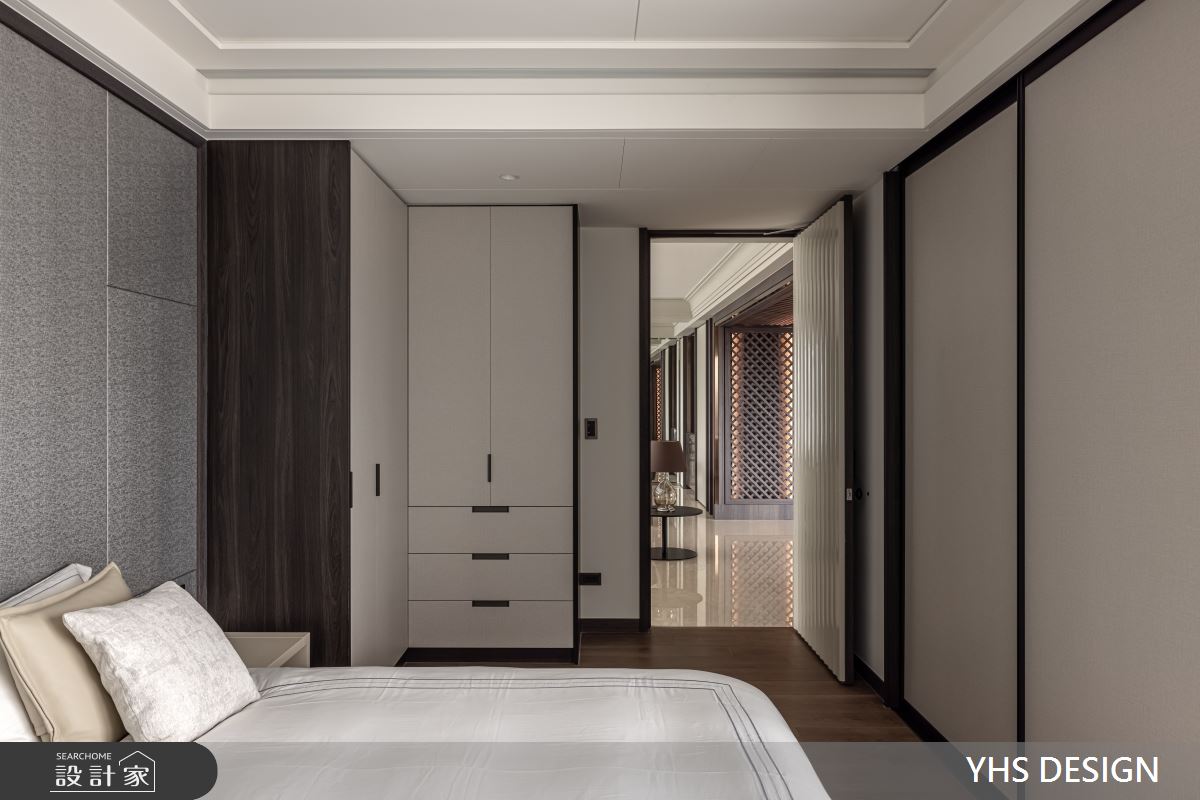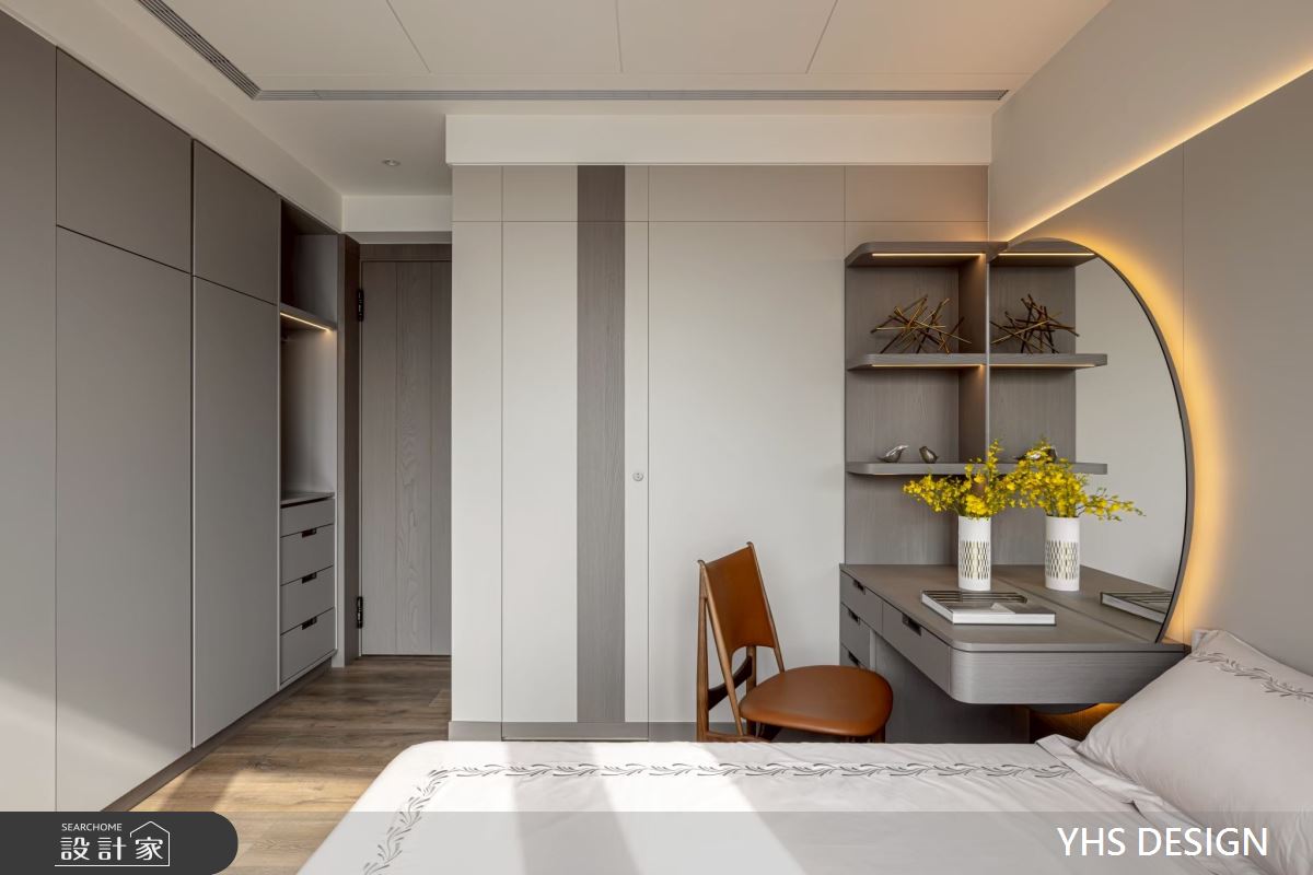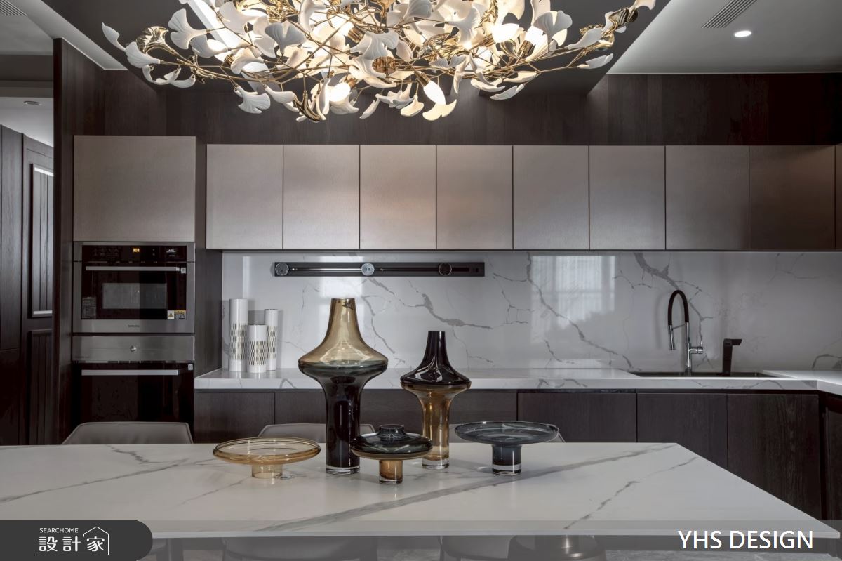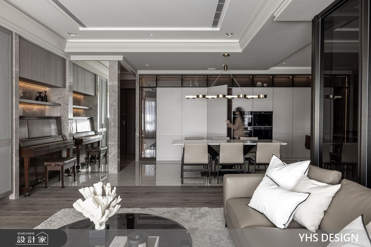 YHS DESIGN設計事業以大理石、灰玻、長虹玻璃、鍍鈦、木皮、海島型木地板、皮革、壁紙的搭配應用,呈現現代簡約風居家氛圍,將此間60坪、三房、單層、新成屋(5年以下)打造成舒適愜意的家庭空間,完成2位大人、1位小孩全家人的夢想之居。