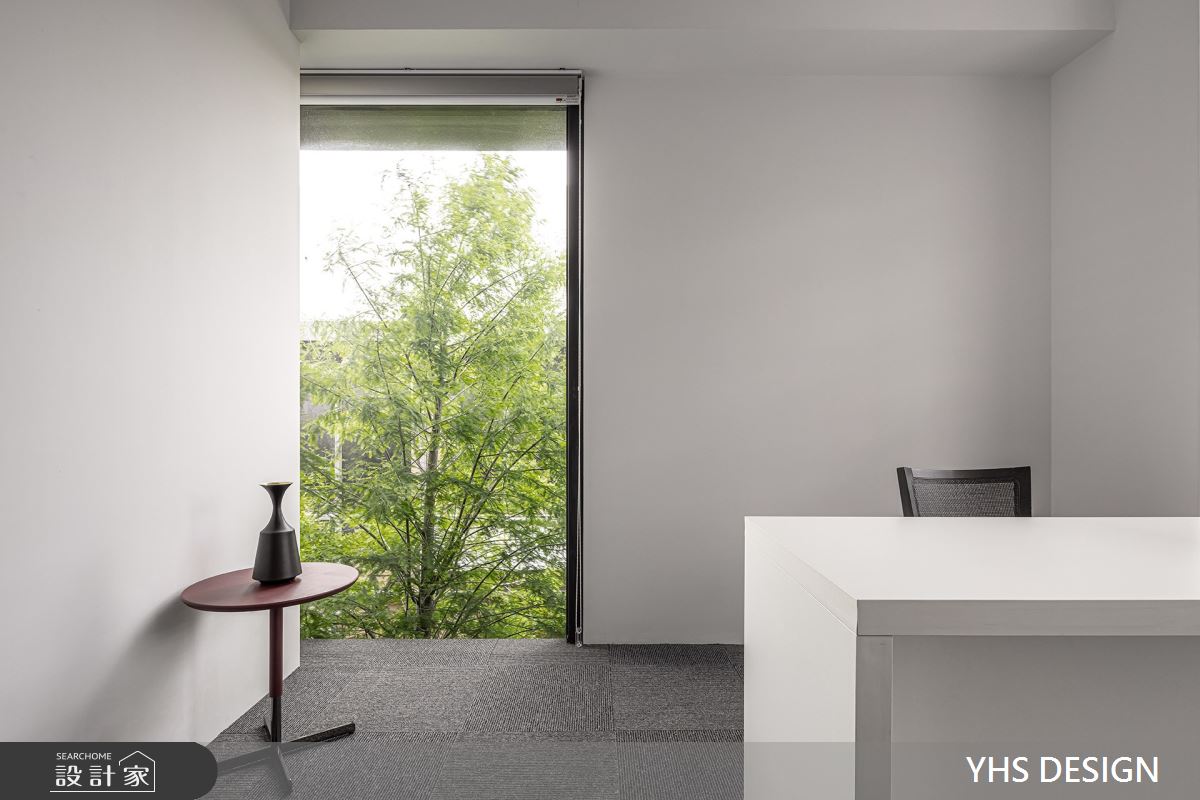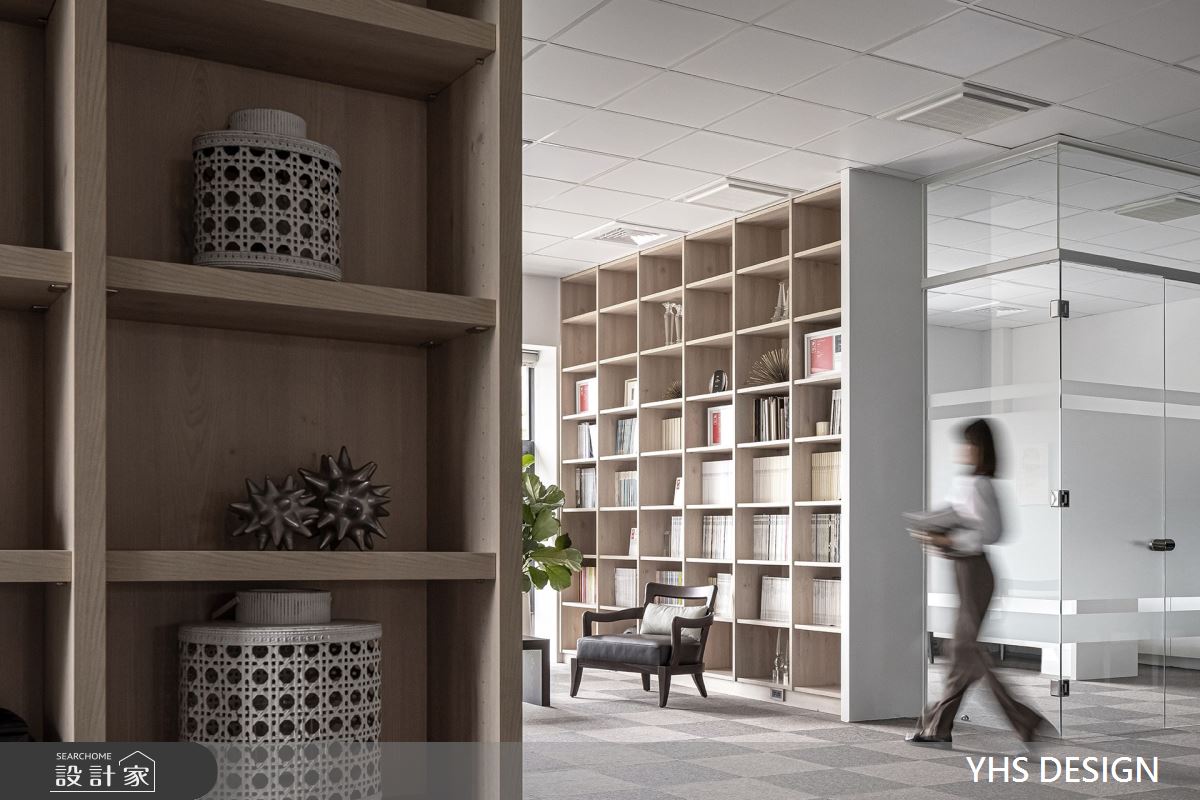 YHS DESIGN設計事業以木地板、大理石、玻璃、木皮、地毯的搭配應用,呈現現代簡約風的風格氣息,將此間90坪毛胚屋優雅詮釋成舒適愜意的商業空間。