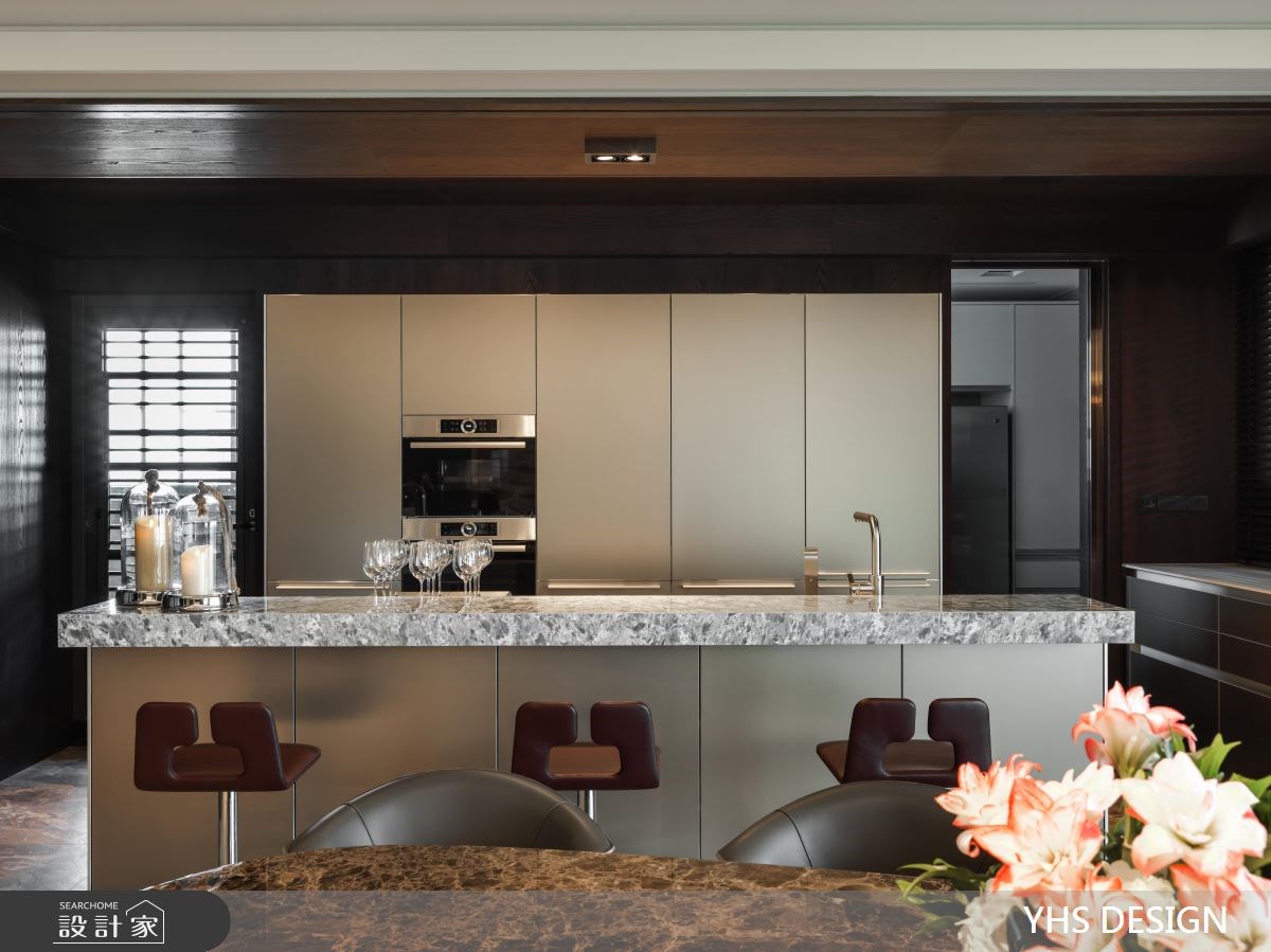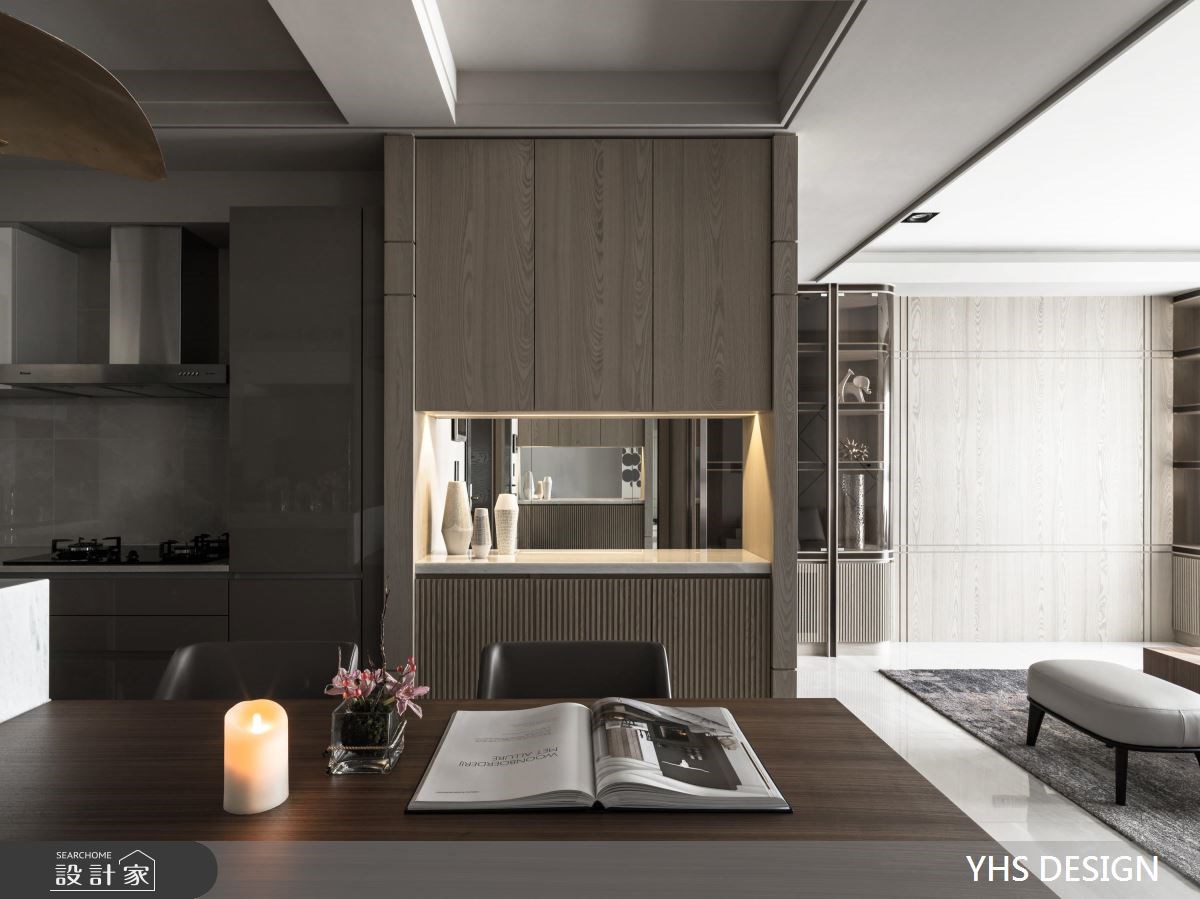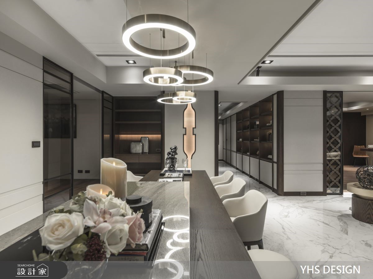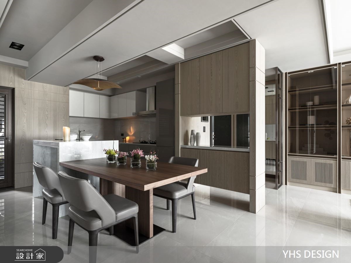 64坪室內空間裡,融入東方的美學底蘊,透過現代設計的工法,將品味與美感串連在機能、動線之中,創造出符合當代的新東方色彩,讓居住者擁有一處非凡的人文宅邸。 玄關開始以大理石材鋪陳地坪,灰色調的淡雅紋理描繪其中,雅緻的美學氣息隨之瀰漫一室,深咖啡色調的木紋櫃體安排,挹注沉穩、安定人心的感受,層板上陳列優雅的風格物件,隨著嵌燈照明的映照,醞釀動人的美學溫度。雲彩意象般的大理石電視牆擘劃一室,引入生動的自然之趣,沙發後方書房區的兩側以虛實相兼的屏風半遮蔽內部情境,空間深處隱約透露金屬線條描繪出綻放的荷花之美,雅緻的藝術美學氣息頓時散漾開來,而深色的線條收邊與勾勒陰影,形塑空間的景深,與公領域以淺色調為基底的手法相互對比,更彰顯客廳的開闊器度;餐廳空間以加長的木紋餐桌結合石材中島,機能整併且讓更多家人或好友能共享美食饗宴或生活樂趣! 小編的最愛 整體空間以色彩對比、虛實相兼、景深的變化,創造出流動的視覺感受,以及捕抓一個個精緻的視覺亮點,動靜皆是景。