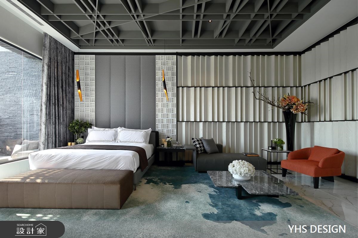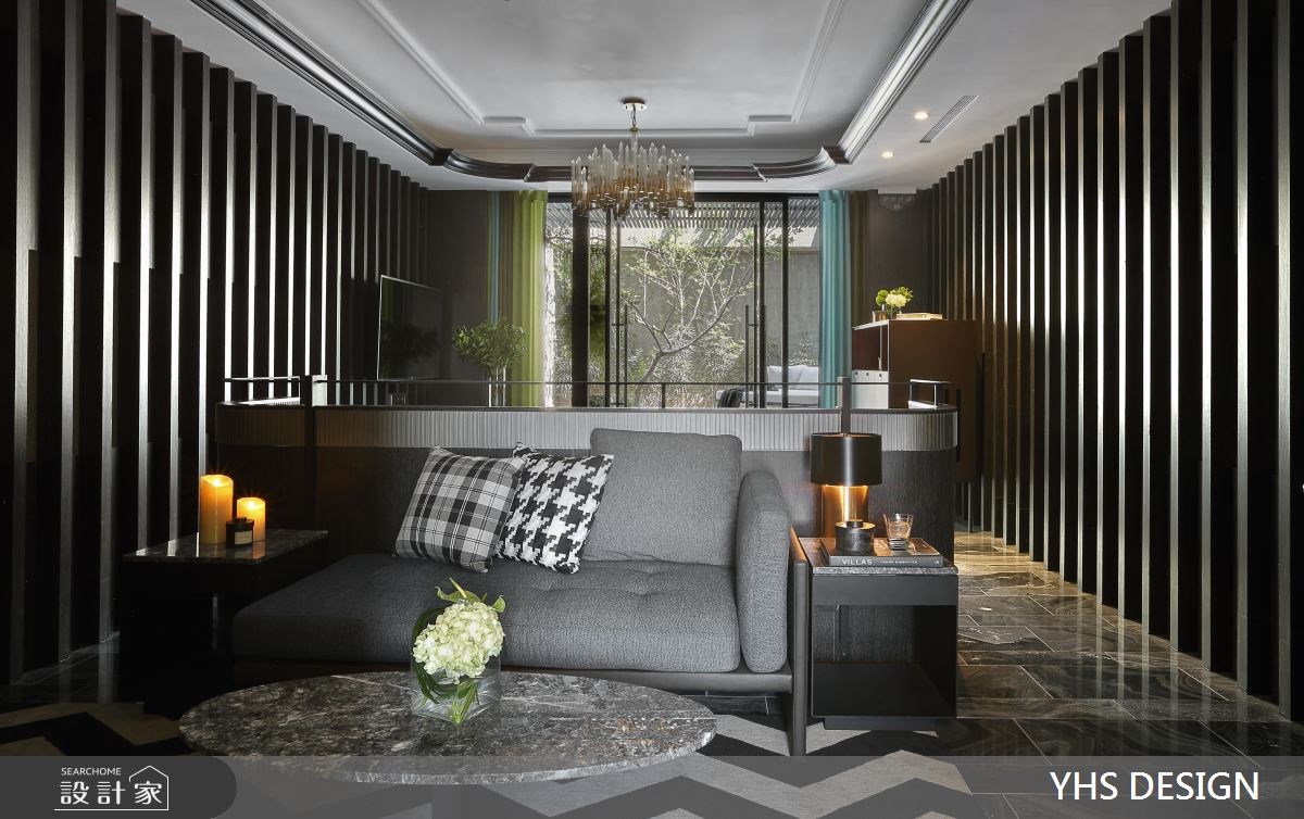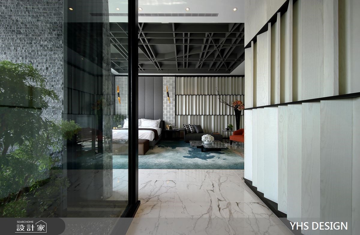 設計師以室內的沉穩灰黑,與庭院的清新翠綠形成對比,又運用立面的材質堆砌,連貫一致的垂直底蘊,讓自然與人文在柔和的日光下交疊,賦予宅邸大器不張揚的氣質。 臥房兩側牆面的起伏紋路,如琴鍵般向外擴展,用指尖輕輕觸碰,彷彿能譜出不同凡響的生活樂章。床頭板利用反射光芒的鈦金屬,妝點出精工錶帶的高尚質感。沙發的藍、窗簾的綠、櫃體的紅、吊燈的金,設計師透過重點的裝飾,在低明度的空間中,擘劃引人注目的視覺焦點。 浴室掌握淨白透亮的原則,從牆面、地坪到衛浴設備,皆用白色大理石材質鋪設,並於一側立面將石材切割堆砌,片片排列出像是骨牌般的立體感受。一階階登上庭院的藤編沙發,蓊鬱的綠意將人緊緊環抱,抬頭仰望無垠的藍天,身心靈立刻獲得滿滿的療癒。 小編的最愛 設計師把庭園綠意毫無保留地引入室內,無論是坐在沙發上沉思、泡在浴缸裡放鬆,眼睛都難以離開美好的自然風光。