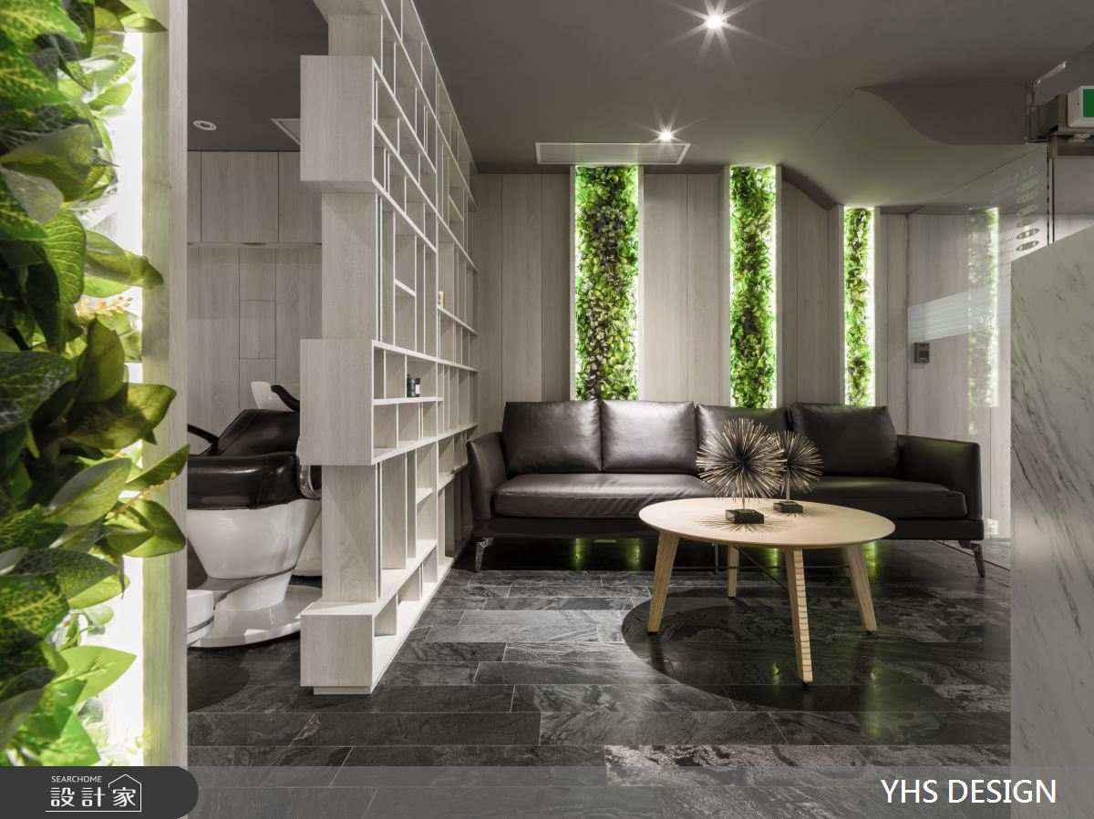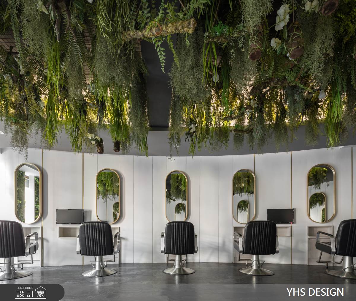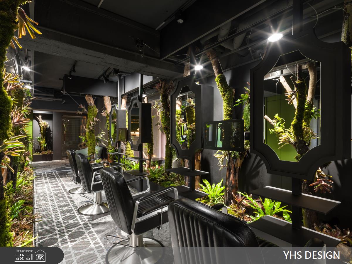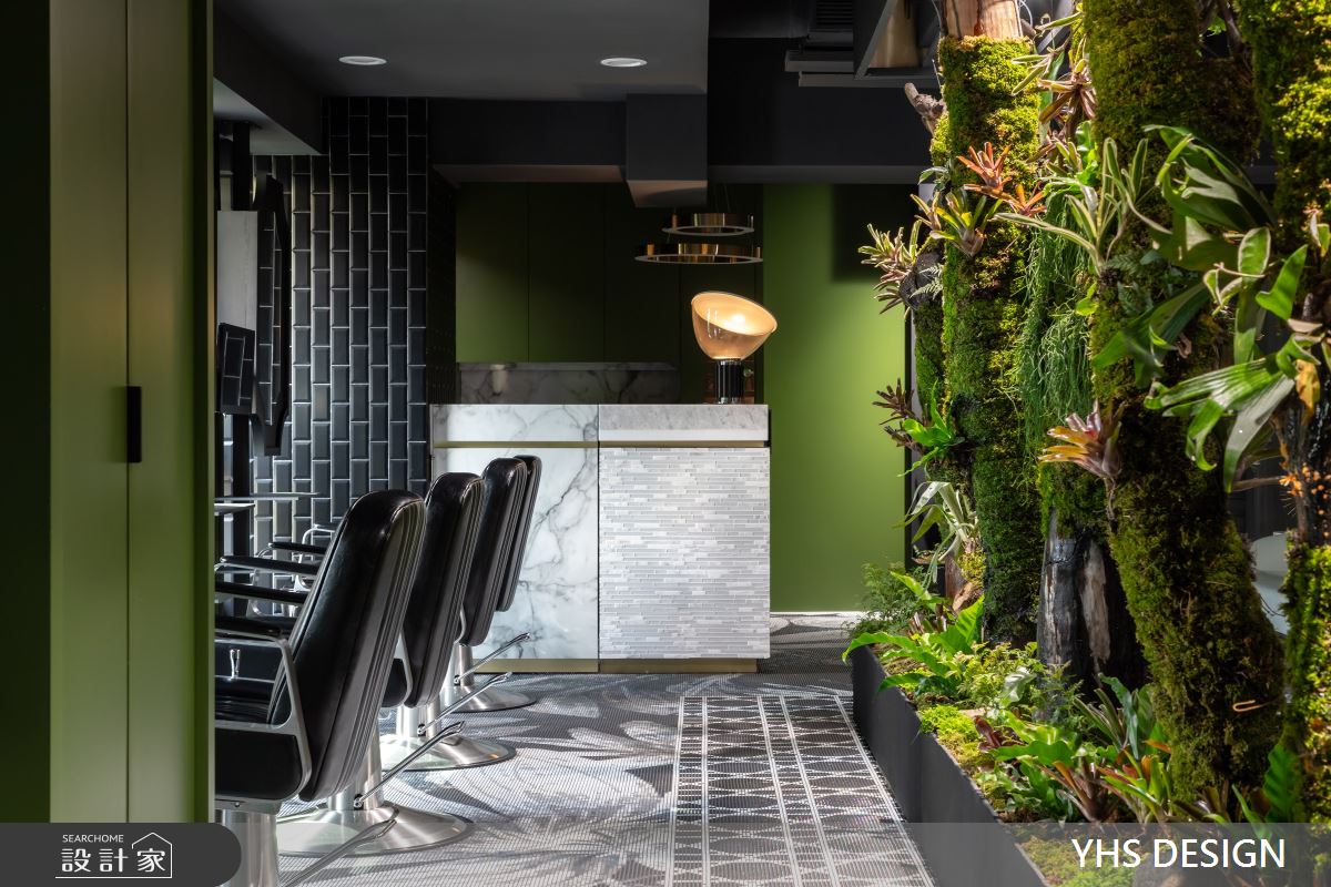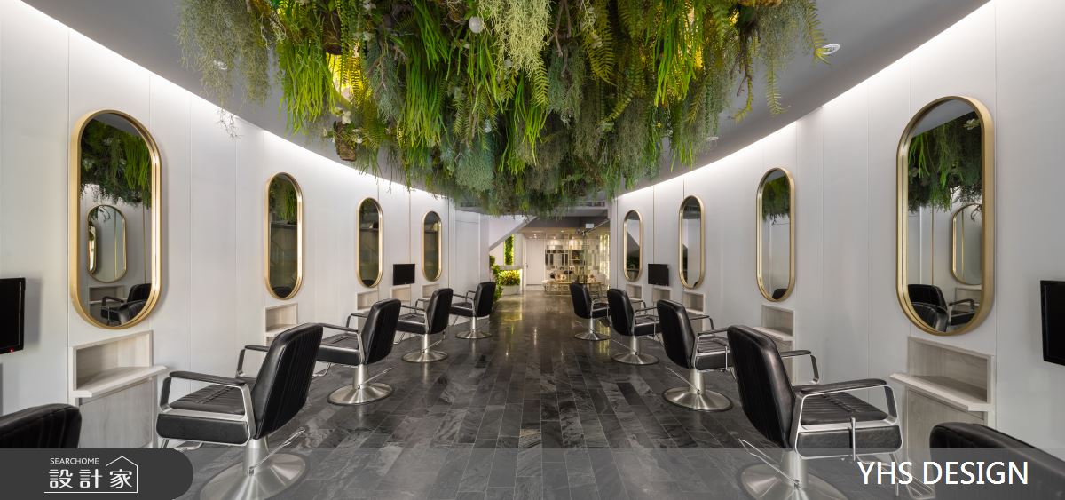當現在髮藝沙龍已經不只處理你的三千煩惱絲,還有按摩、香氛等讓頭皮以至整個身心都在這裡能獲得全然放鬆,於此室內設計就需擔負起氛圍營造的重責大任,這次YHS DESIGN 設計事業團隊捕捉花園的美好及擷取花草的意象,讓人走進空間內就被愜意氛圍徹底療癒。 這間位於香港的21坪髮廊,設計師以繁盛植栽及雅緻線條為入口,並巧妙運用樓梯上方天井引入光線,在自然光的照拂下仿若走進秘密花園。弧形櫃台旁側即為等候沙發,並以頂天幾何展示櫃區隔洗髮區,賦予視覺穿透及設計感受。踏入美髮區,放眼望去綠意環繞於空間中,特別是天花擬真的藤蔓及蕨類植物更象徵髮絲飄揚,座位鏡面倒映綠蔭之美,以霧面金框與簡單分割的線條創體現設計的質感與優雅,顧客亦能從空間設計中感受髮廊將帶給自己煥然一新的改變。 小編的最愛 空間運用大面植栽營造出室內花園意象,最令人驚豔的則是橢圓天花的高擬真植物,與髮廊印象相互呼應。