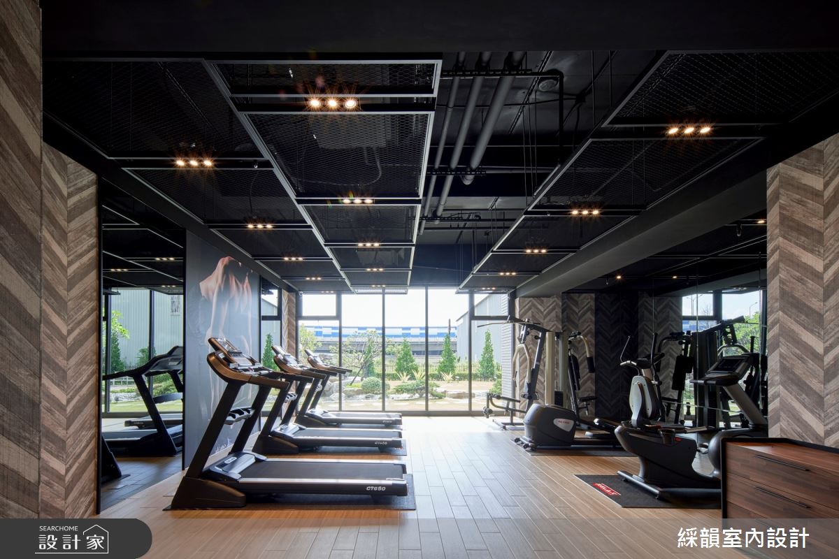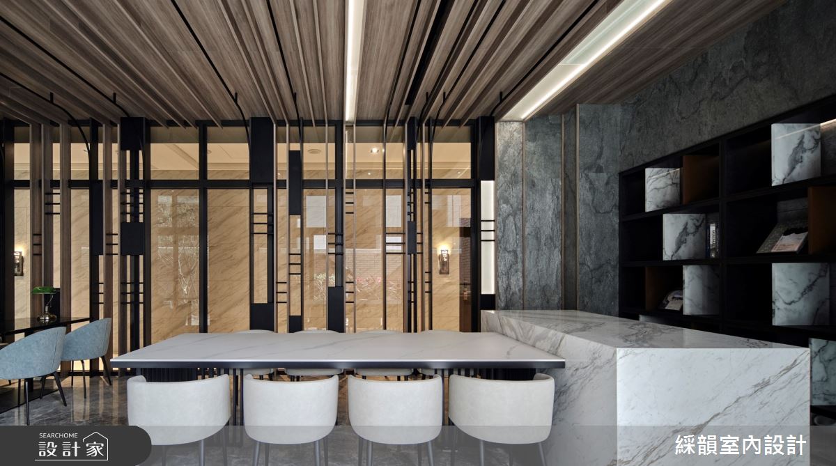 綵韻室內設計以木紋磚、鐵件、大理石的搭配應用,呈現現代風的風格氣息,將此間280坪優雅詮釋成舒適愜意的公共空間。