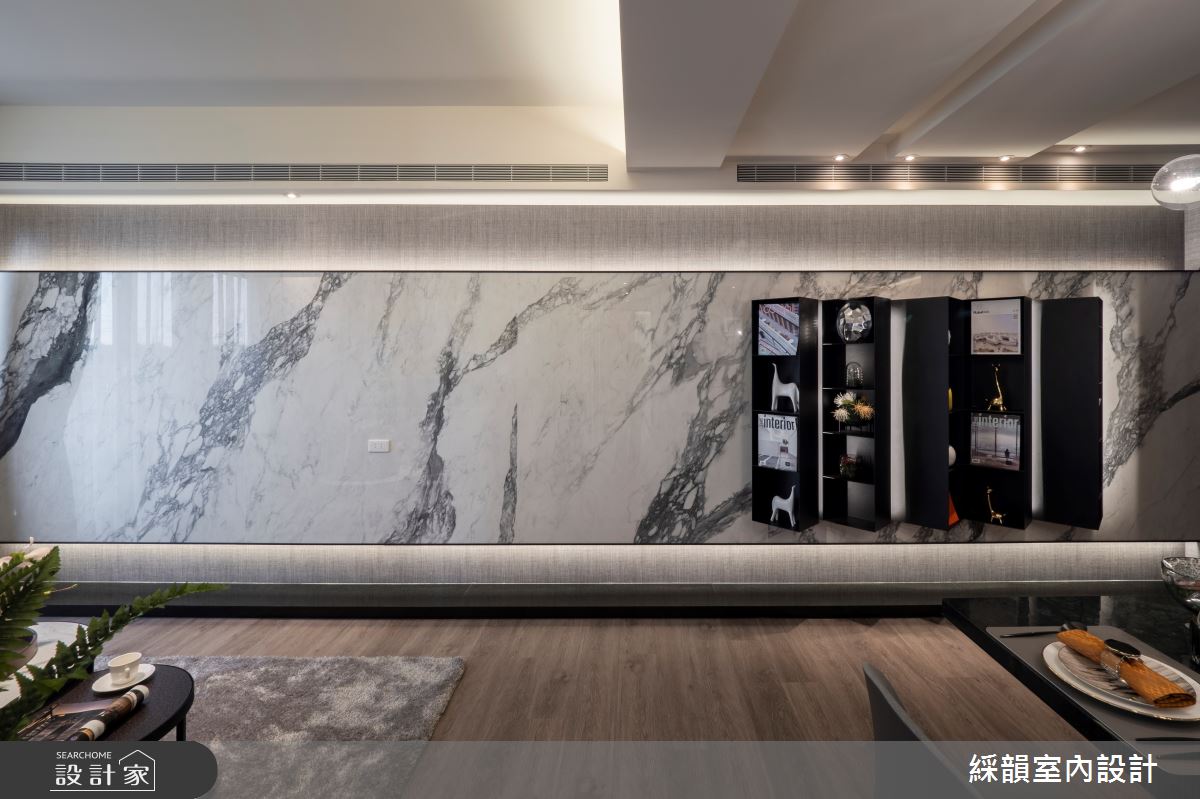 綵韻室內設計以大理石、皮革、鍍鈦、壁布、鈦鋼石的搭配應用,呈現現代風居家氛圍,將此間45坪、四房、單層、預售屋打造成舒適愜意的家庭空間,完成全家人的夢想之居。