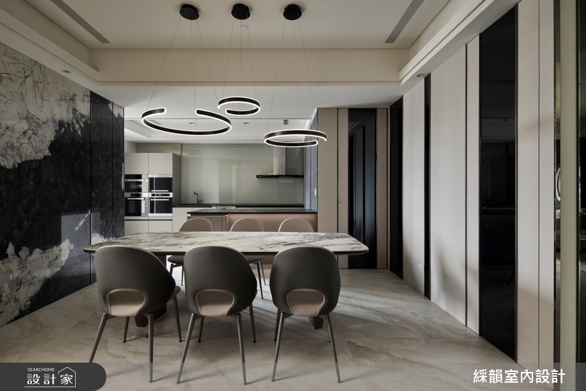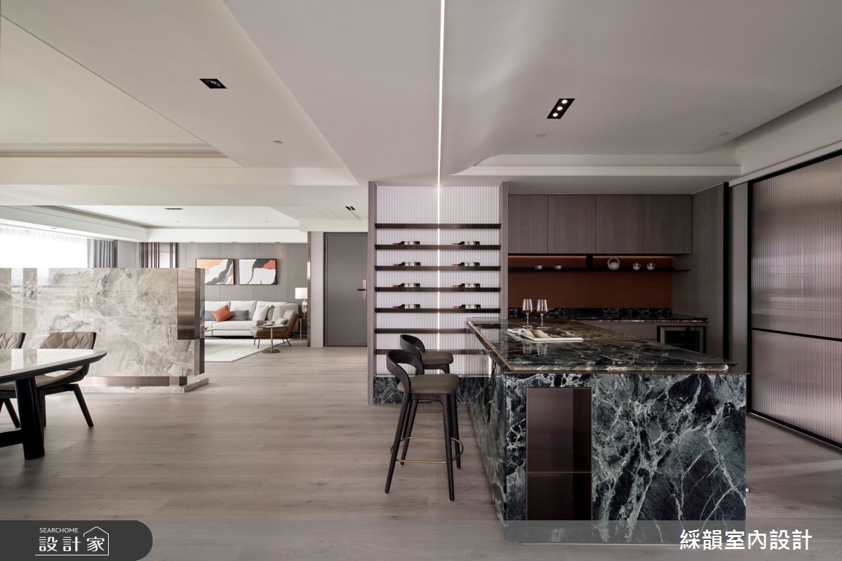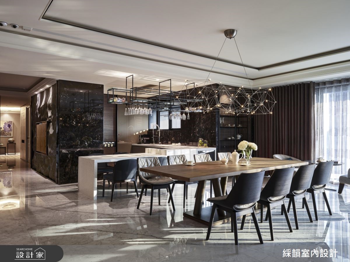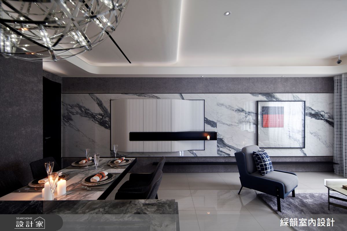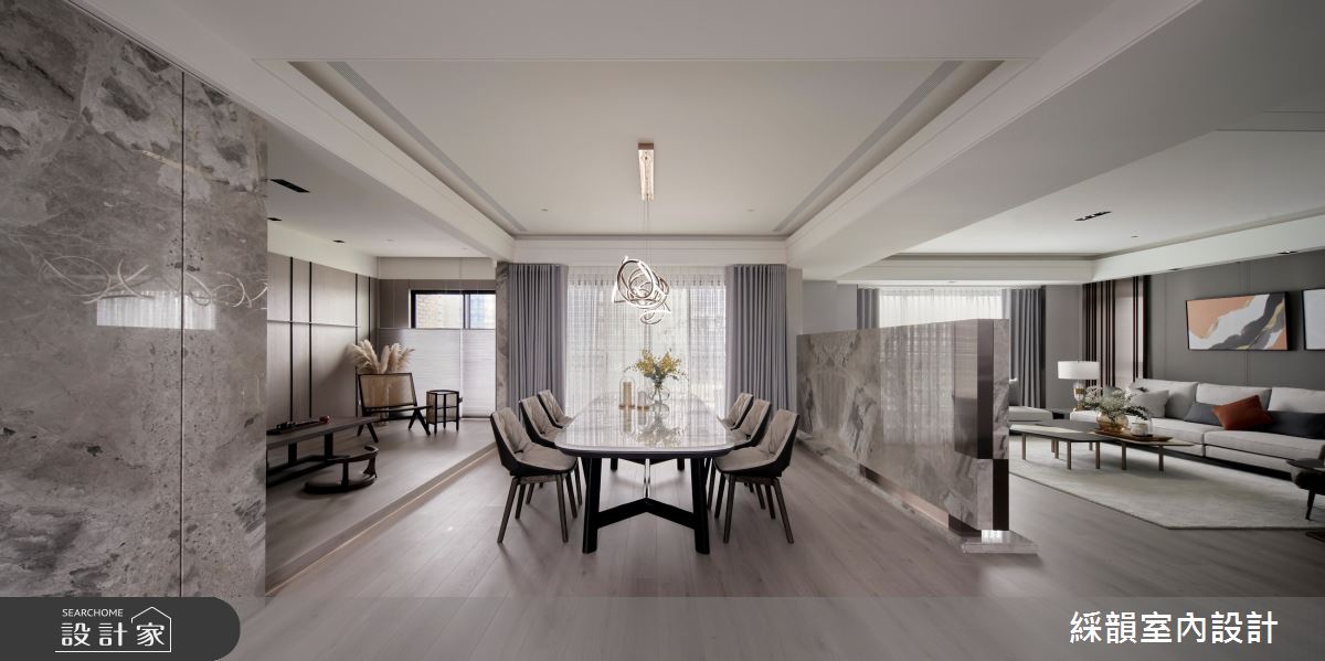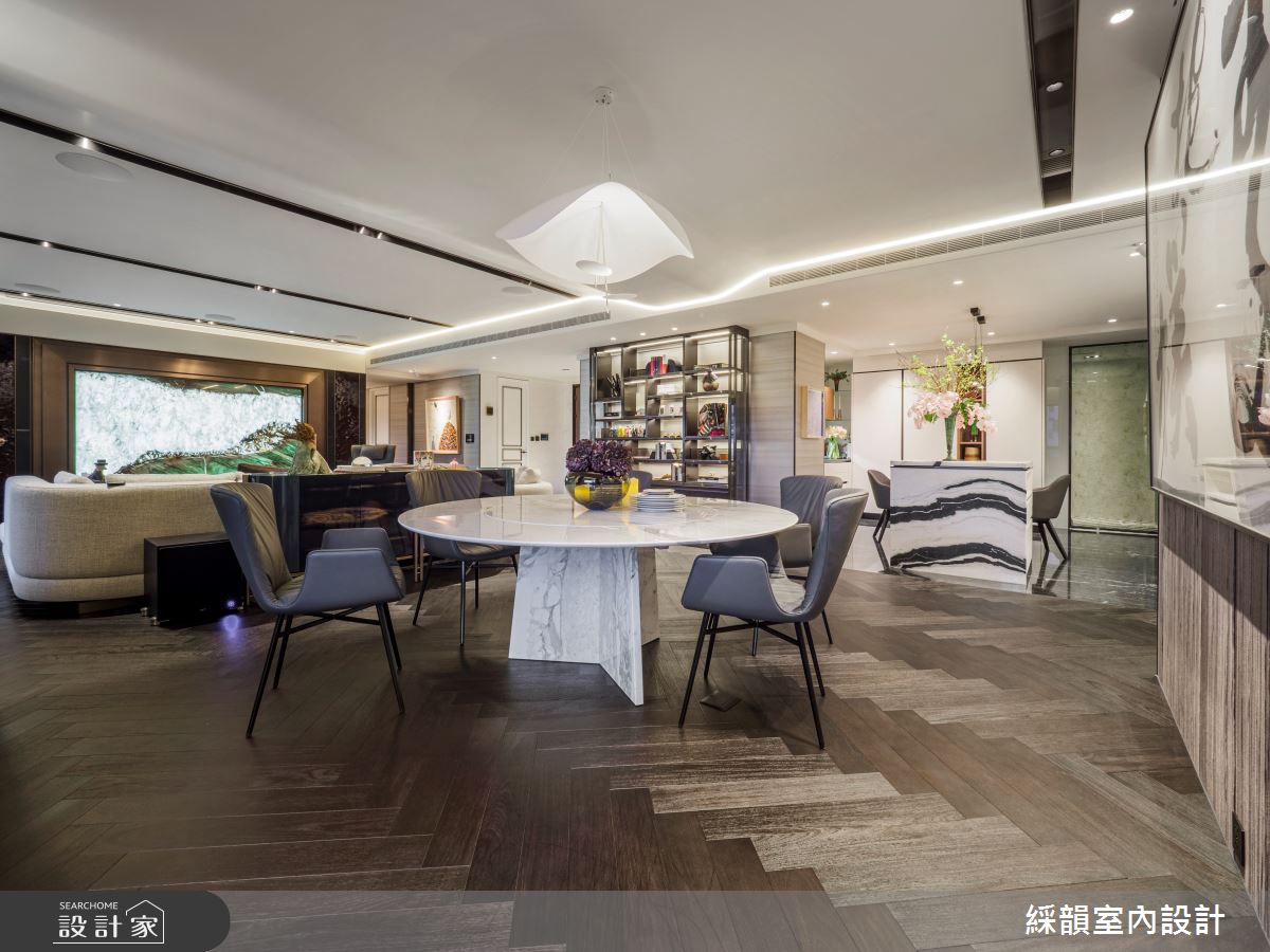 綵韻室內設計以石材、壁布、皮革、鍍鈦、烤漆、線板的搭配應用,呈現現代奢華風居家氛圍,將此間121坪、四房、新成屋(5年以下)打造成舒適愜意的家庭空間,完成全家人的夢想之居。