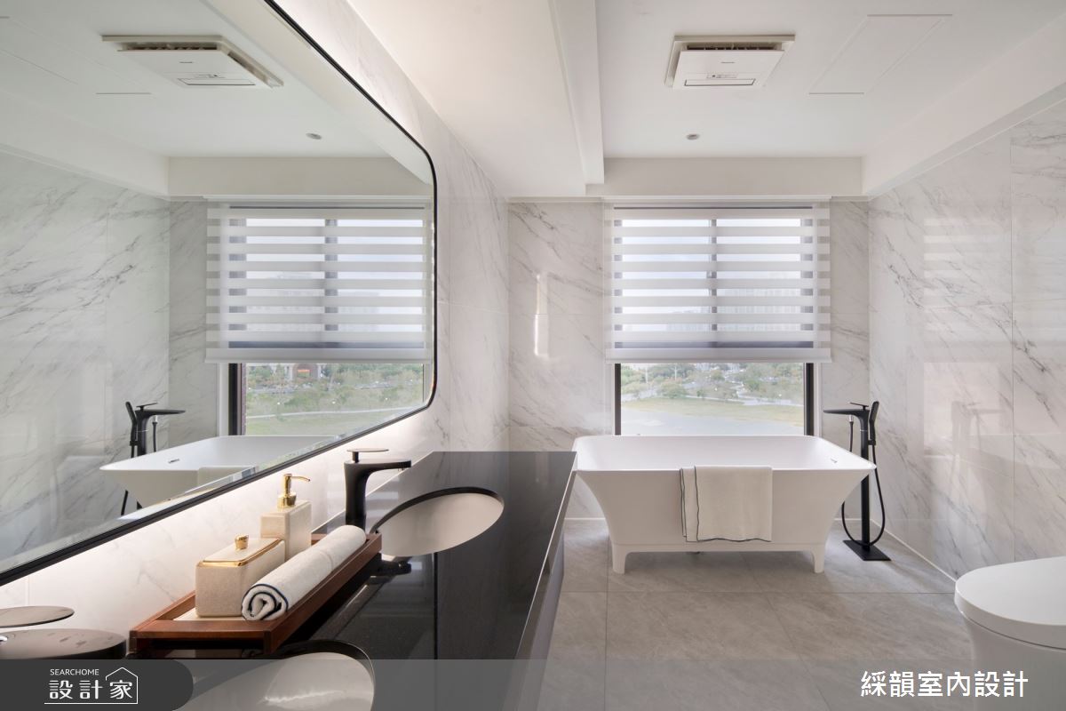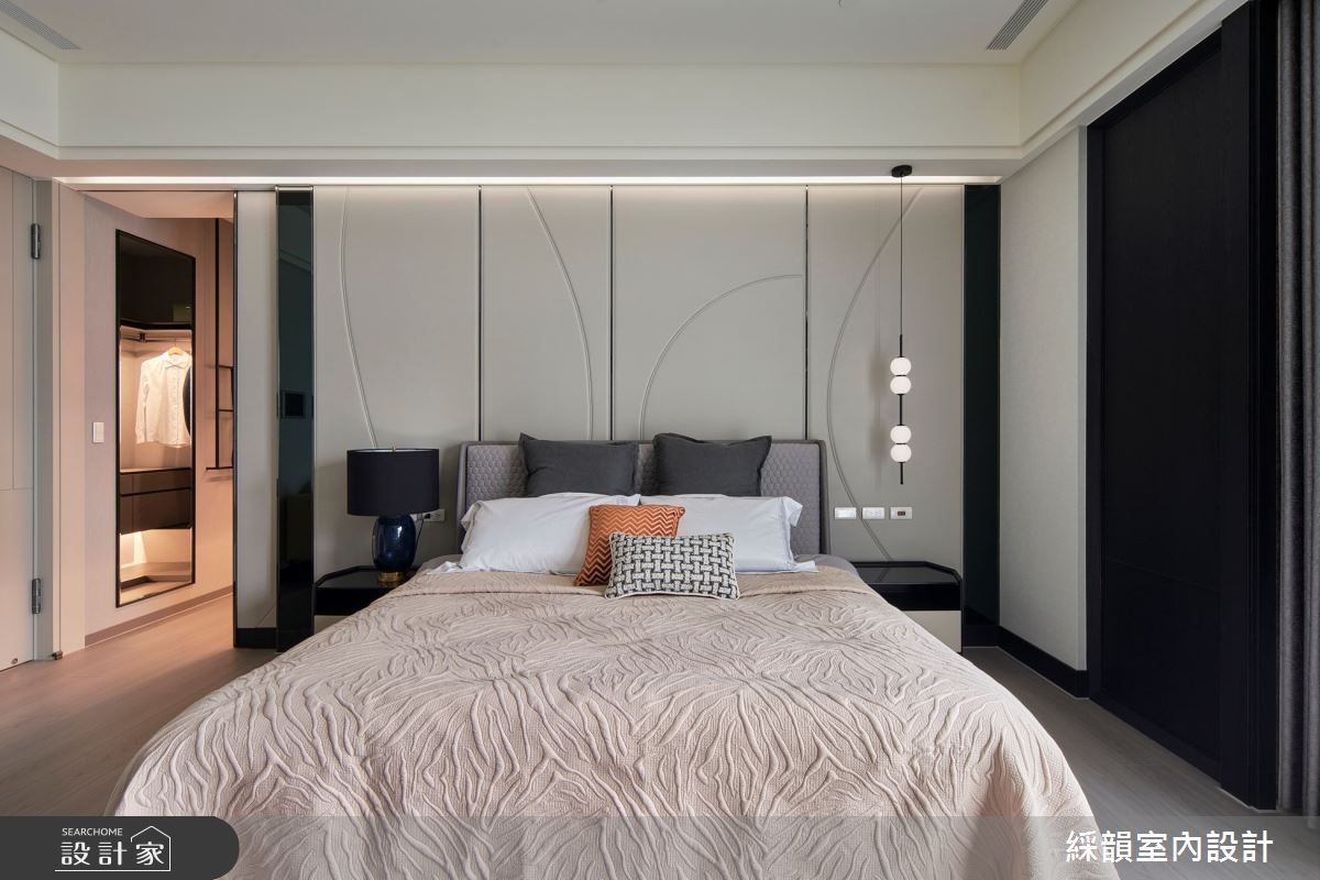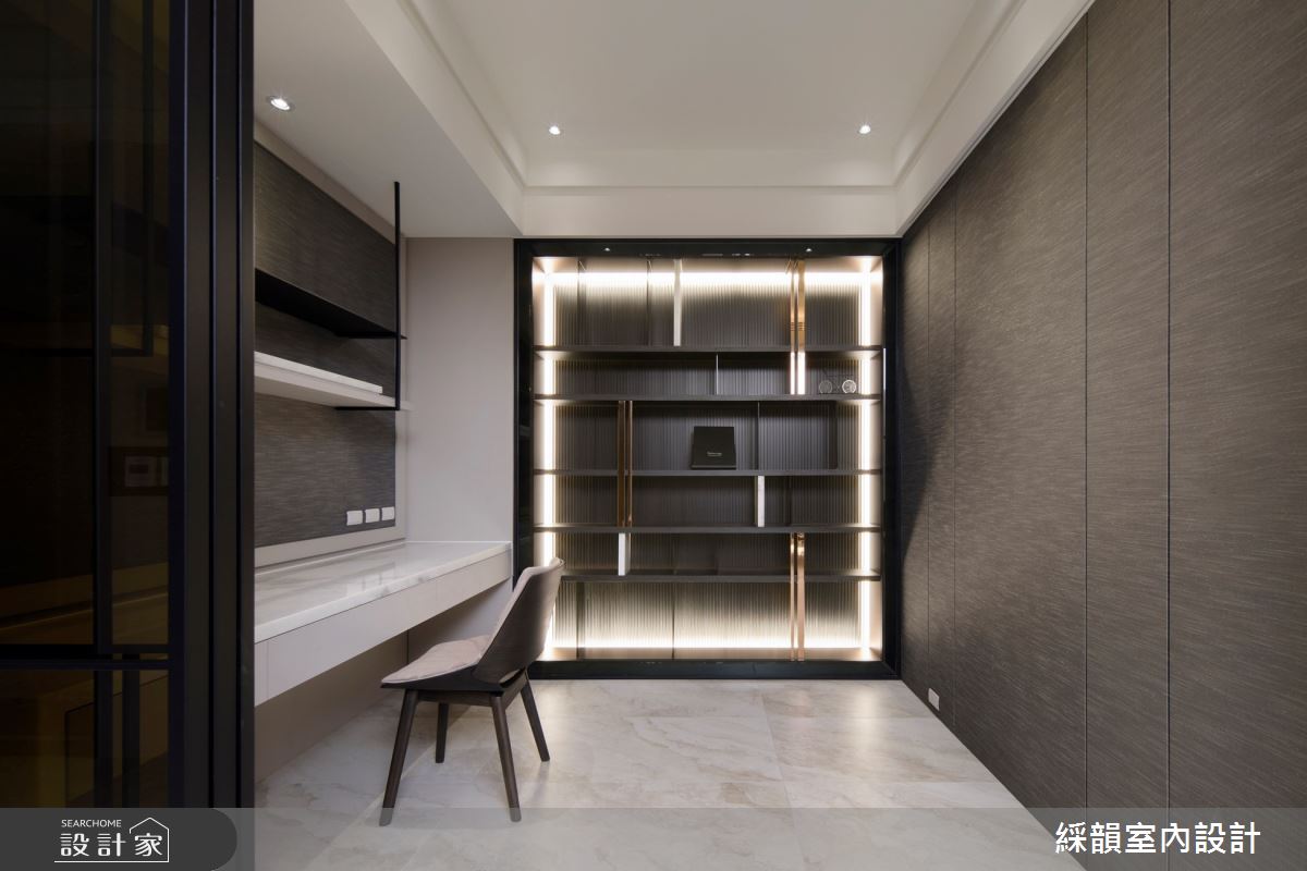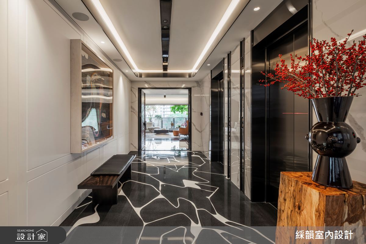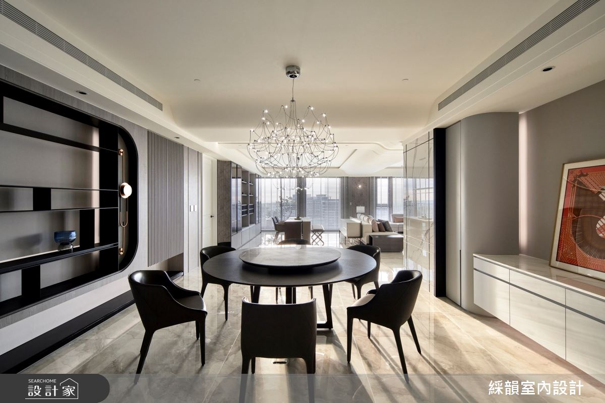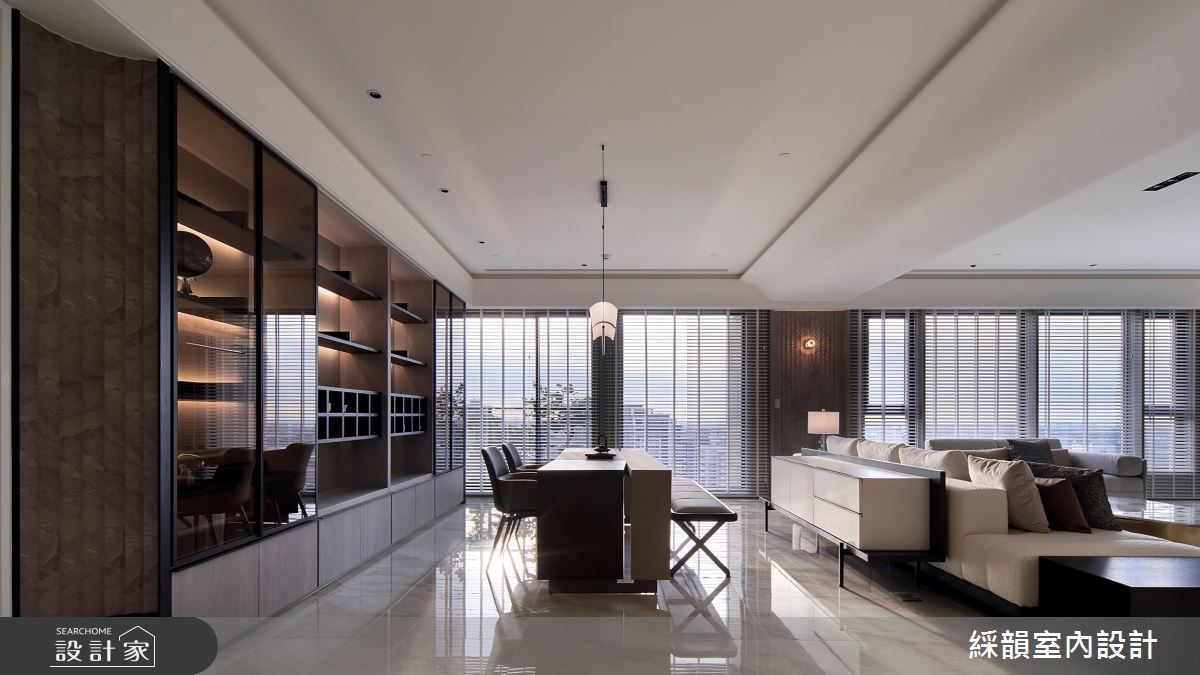 綵韻室內設計以石材、壁布、皮革、鍍鈦、烤漆、線板的搭配應用,呈現現代奢華風居家氛圍,將此間121坪、四房、新成屋(5年以下)打造成舒適愜意的家庭空間,完成全家人的夢想之居。