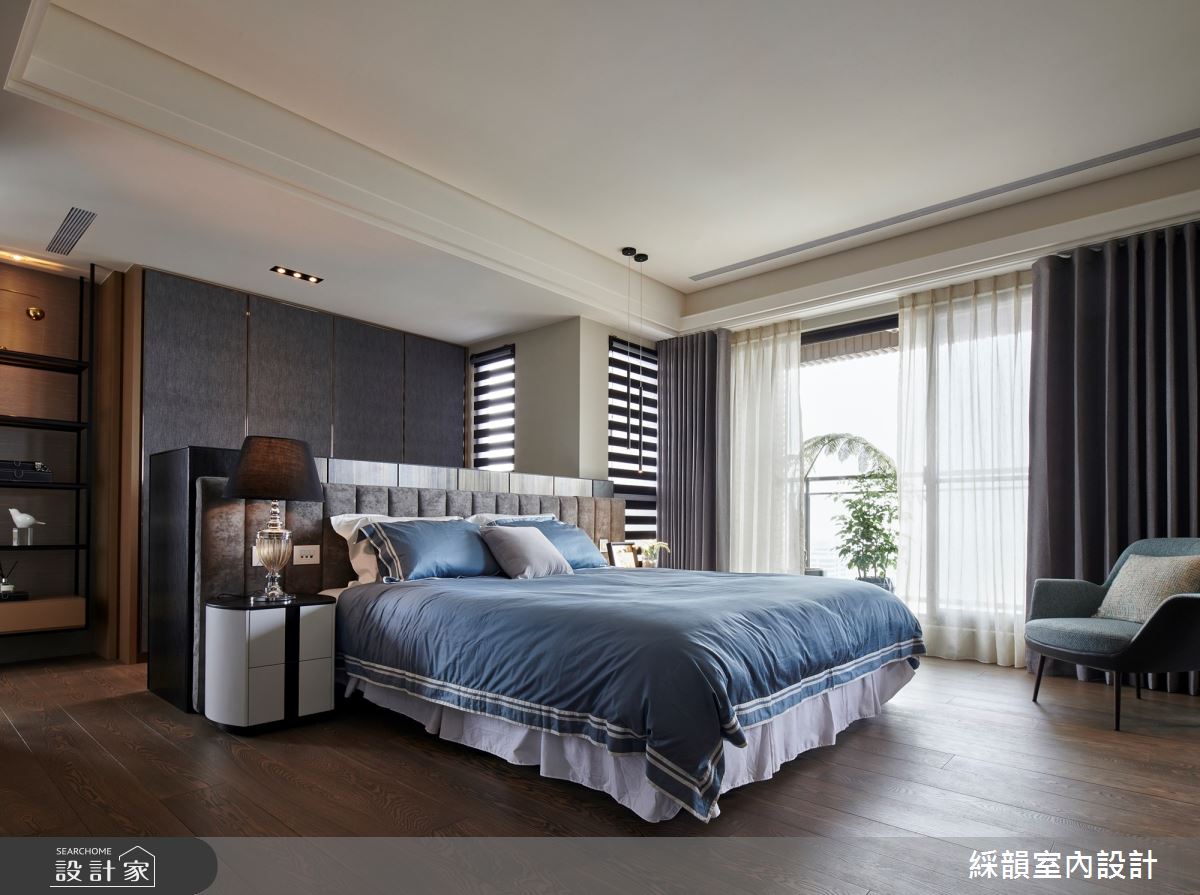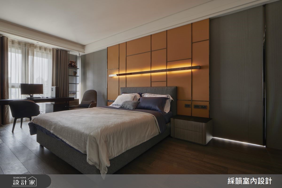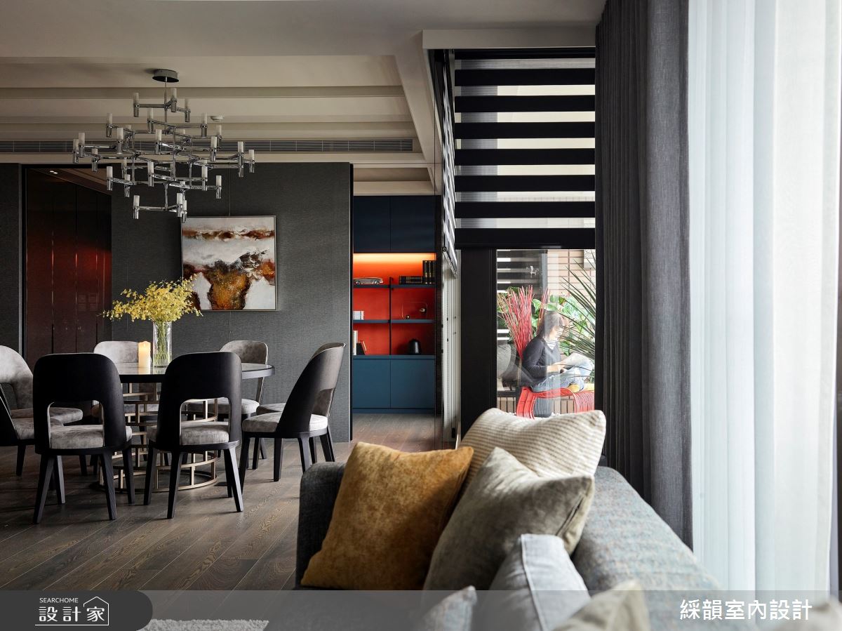 由綵韻室內設計精心規劃的121坪四房住宅空間。因應屋主需求,設計師運用現代風作為主軸,搭配鍍鈦、皮革、繃布、格柵、石材,打造全家人的夢想家居。