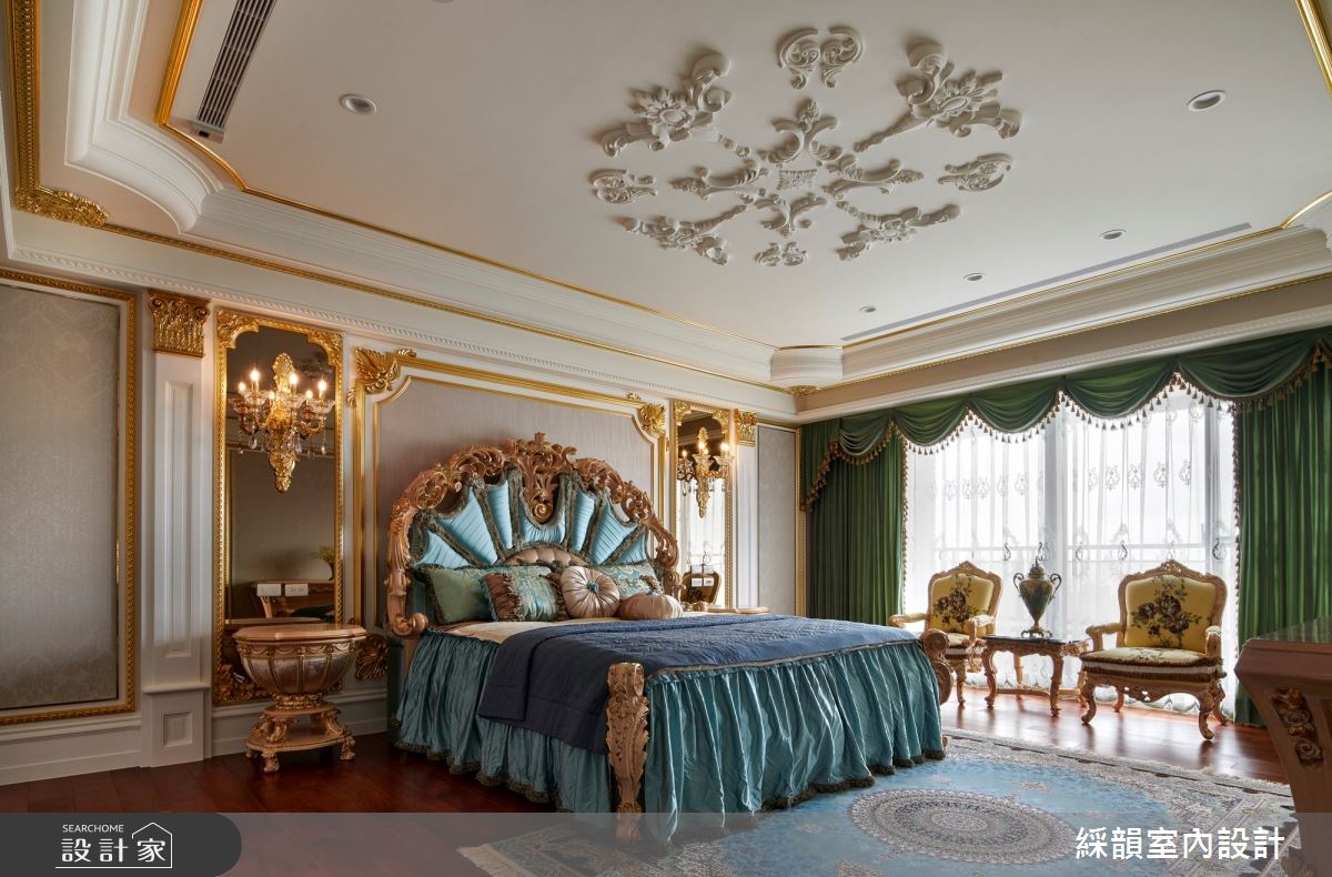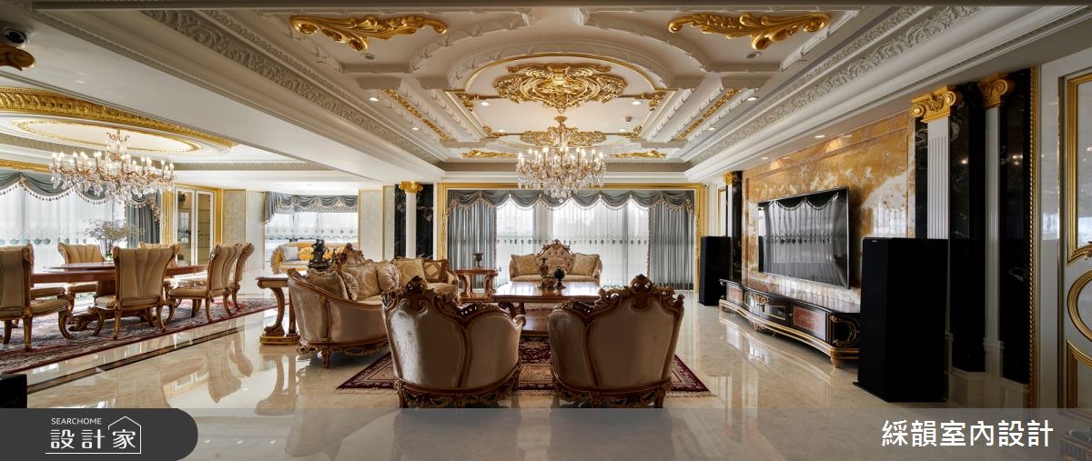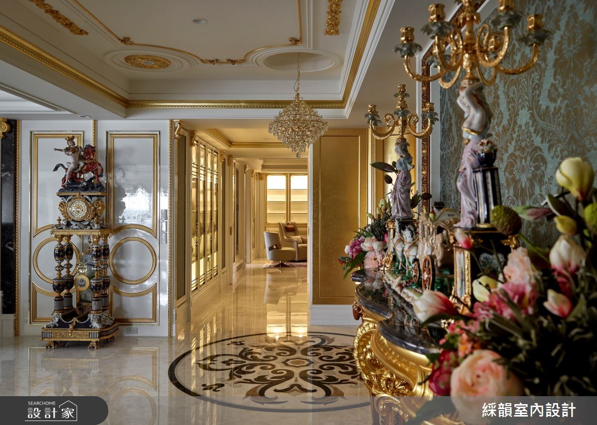 綵韻室內設計以壁紙、烤漆、大理石、線板、金箔的搭配應用,呈現新古典居家氛圍,將此間200坪、四房、單層、新成屋(5年以下)打造成舒適愜意的家庭空間,完成全家人的夢想之居。