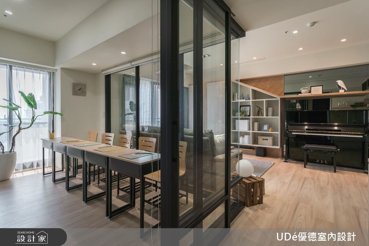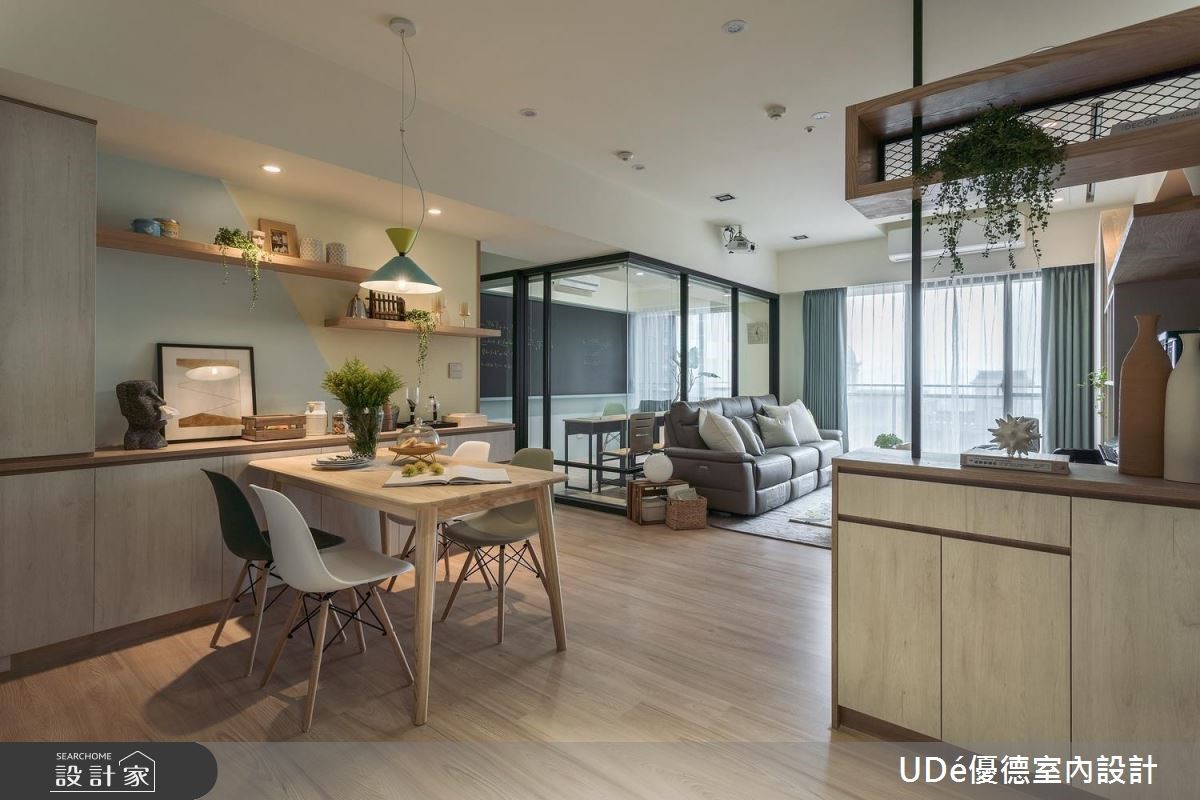 優德室內設計 X 日金空間設計以乳膠漆、木地板、烤玻、系統板材的搭配應用,呈現北歐風居家氛圍,將此間21坪、三房、單層、新成屋(5年以下)打造成舒適愜意的家庭空間,完成4位大人全家人的夢想之居。