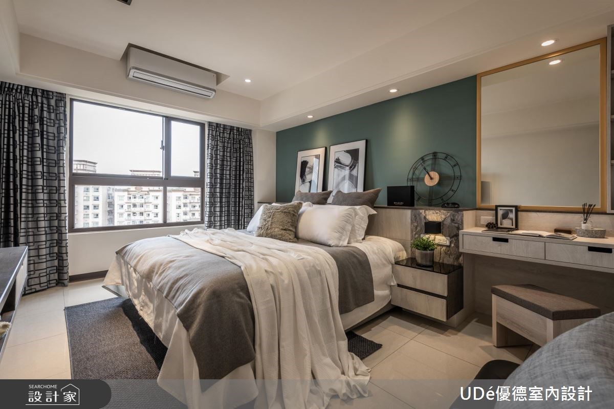 36 坪現代風住宅,一道莫蘭迪綠電視牆,傳遞溫柔沉穩氣氛圍繞整室,而坐落於市中心精華地段,雖然擁有高樓層採光優勢,但臥室空間相對較小,因此收納機能需悉心規劃,發揮最大坪效。 公共空間立面鋪排白石紋板材,展現浪漫精緻家居,角落的鐵件與木質搭配的收納櫃,則注入了個性與溫潤,有次序的建材用料,透過大型物件及重點色彩,凸顯各領域特色。客廳最搶眼的溫柔莫蘭迪綠,擺上幾幅掛畫、精準的燈光設計,創造藝廊般端景,而灰質大理石紋理鋪排的電視牆,大方又有氣勢,無形中拉寬視覺感受;餐廳領域結合小孩琴室機能,除了餐桌旁開放層外,鋼琴上方一道蔓延的樹枝狀收納,成功創造一面兼具吸睛及收納的機能角落。 小編的最愛 私領域,依據使用者個性,分別用上白石紋、彩度較高的藍色及綠色表現;而主臥原格局使用不便,設計師透過外推牆面重整空間,新增梳妝台及放大衣櫃容量,讓兩人共用空間更為舒適,並藉由衣櫃推拉門造型,隱藏主衛浴入口;小孩房在有限的空間中打造大容量收納,適時變換層板設計,豐富視覺層次。