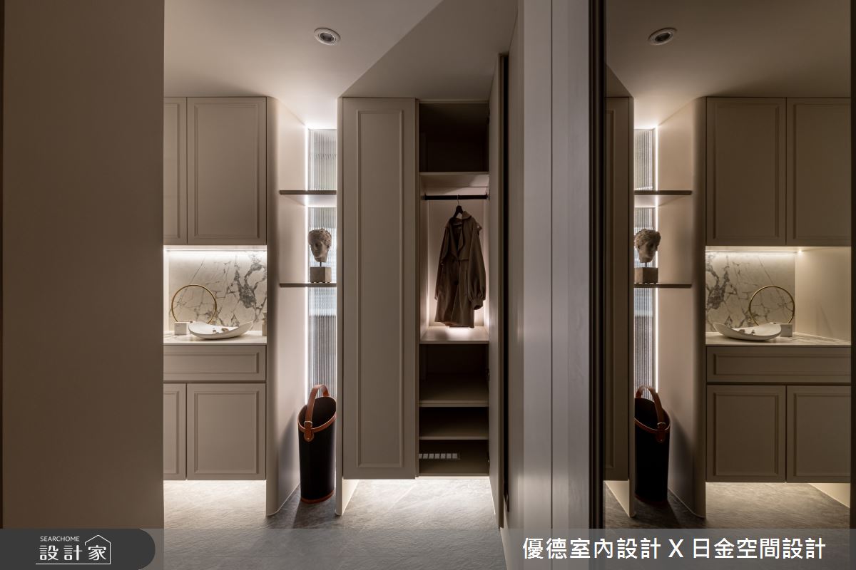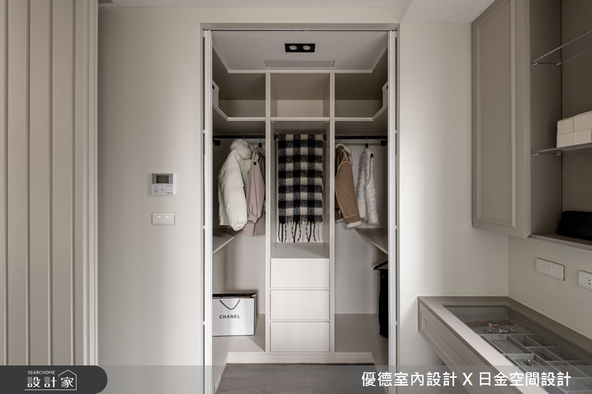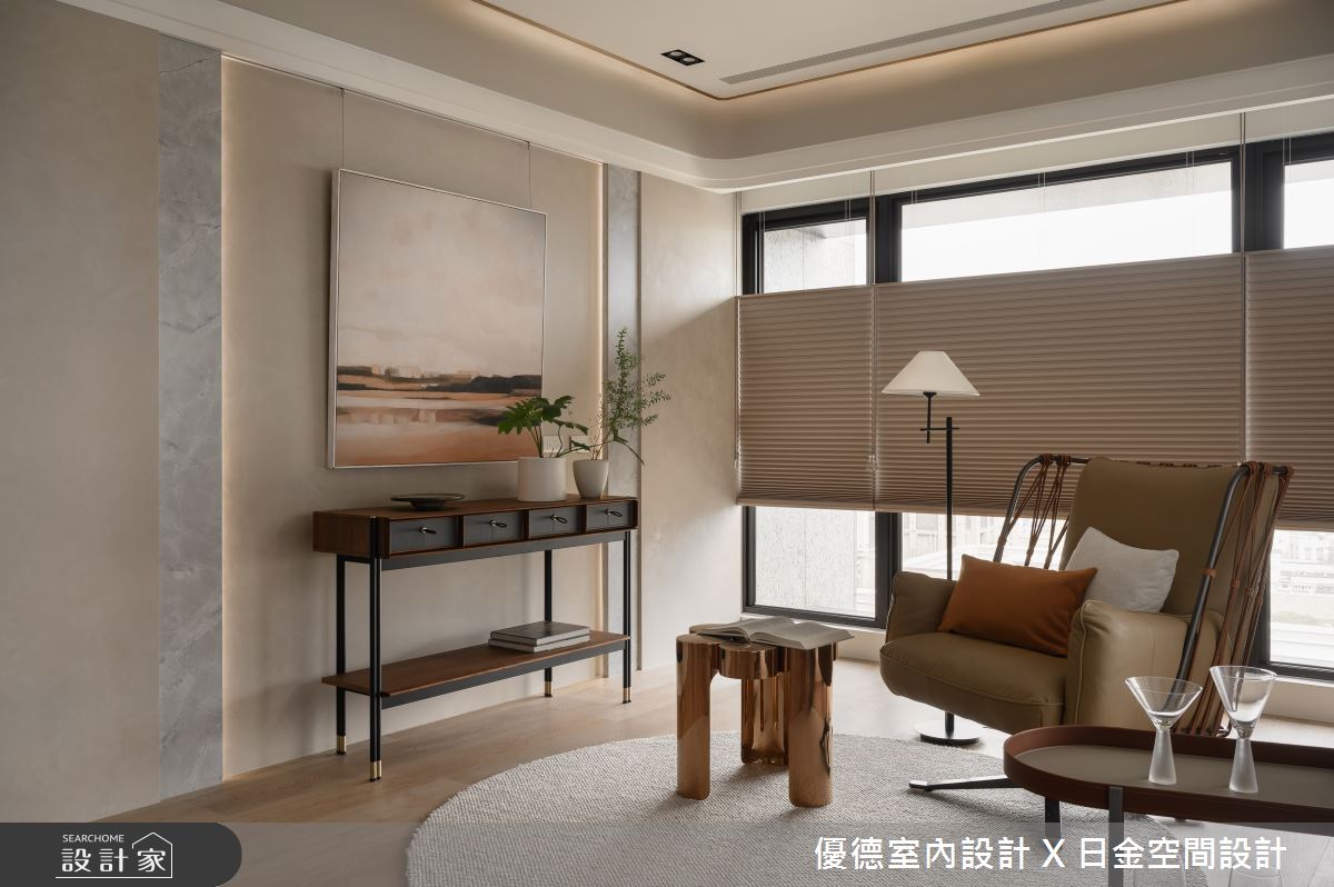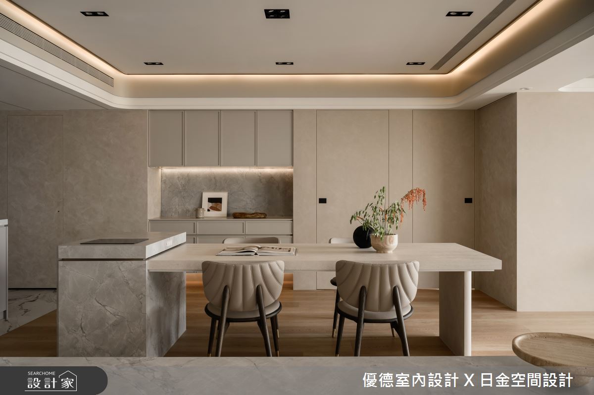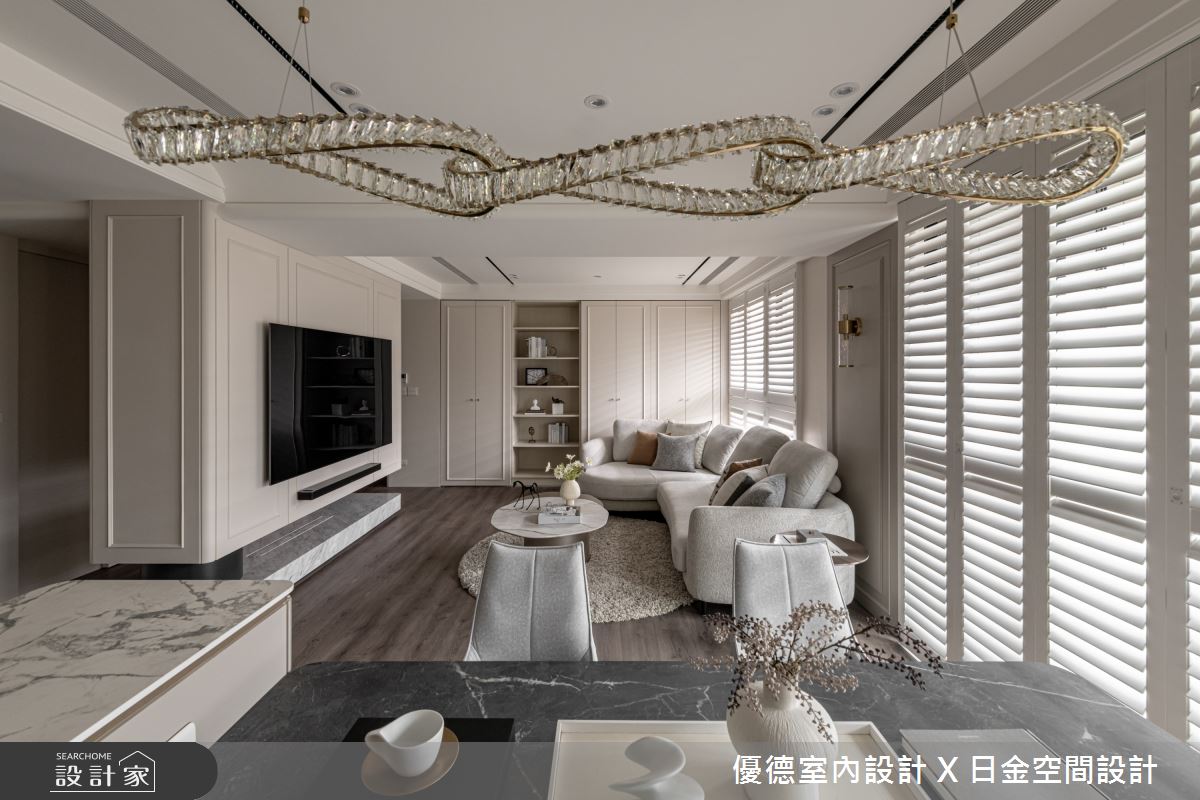 優德室內設計 X 日金空間設計以油漆、超耐磨木地板、木地板、石英磚/拋光石英磚、不鏽鋼、鐵件、茶玻、木作貼皮、烤漆、系統板材、大理石、磁磚、水泥/水泥粉光、線板、噴漆、灰玻、長虹玻璃、百葉窗的搭配應用,呈現新古典居家氛圍,將此間36.2坪、三房、單層、新成屋(5年以下)打造成舒適愜意的家庭空間,完成2位大人、2位小孩全家人的夢想之居。