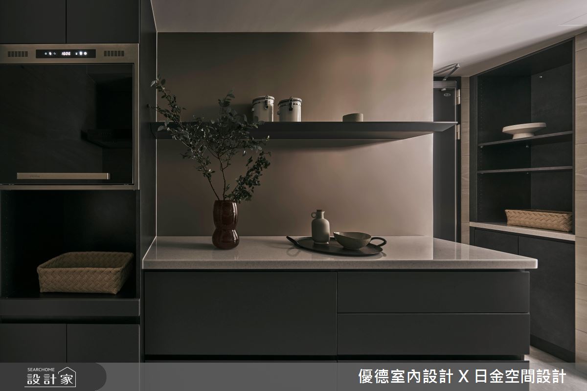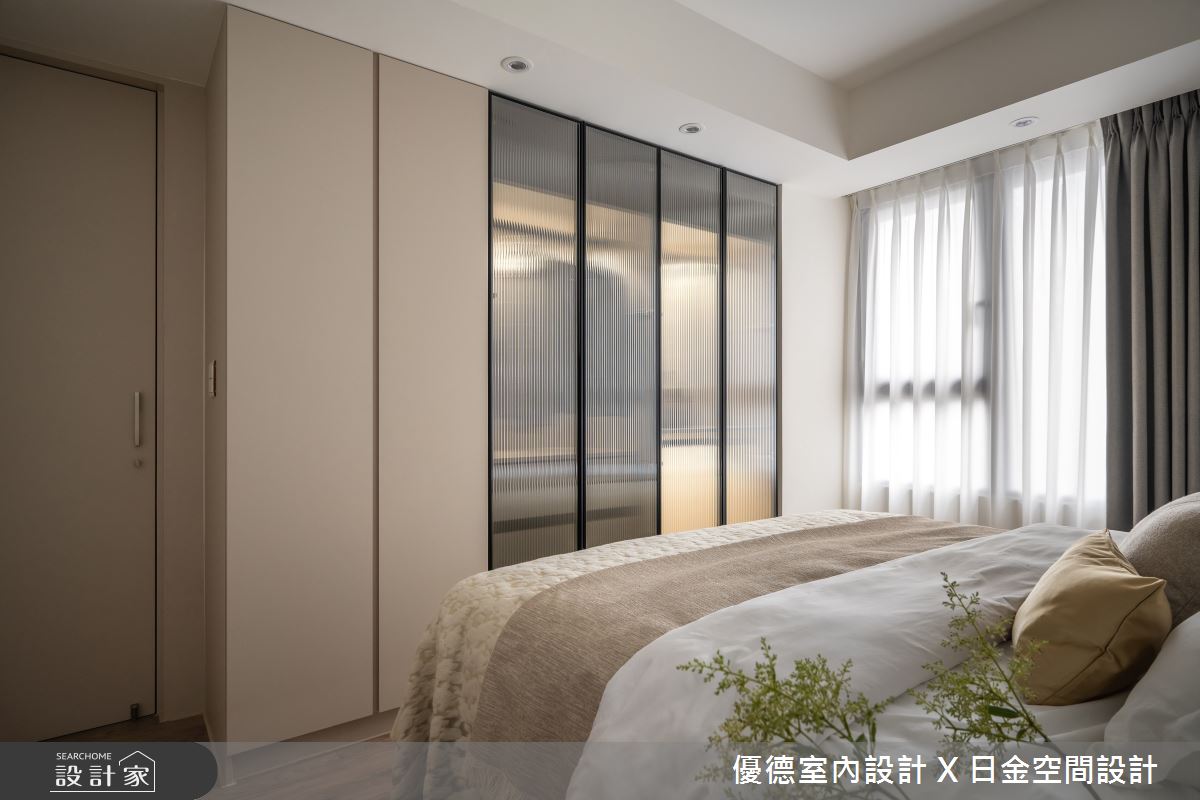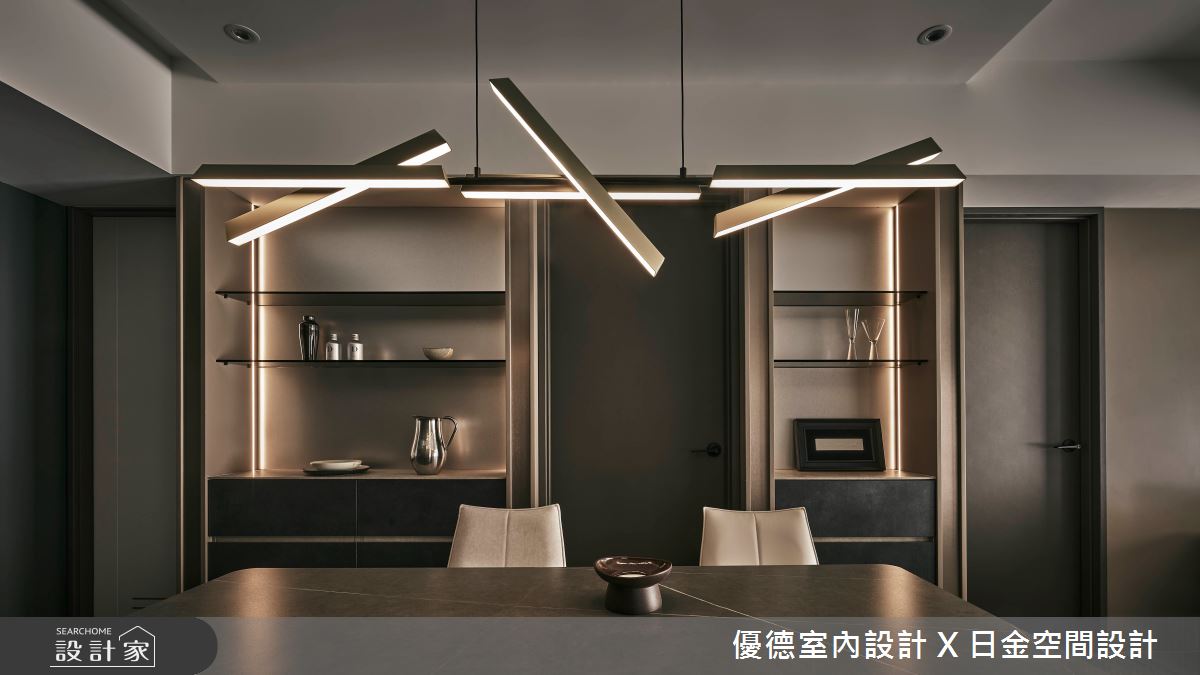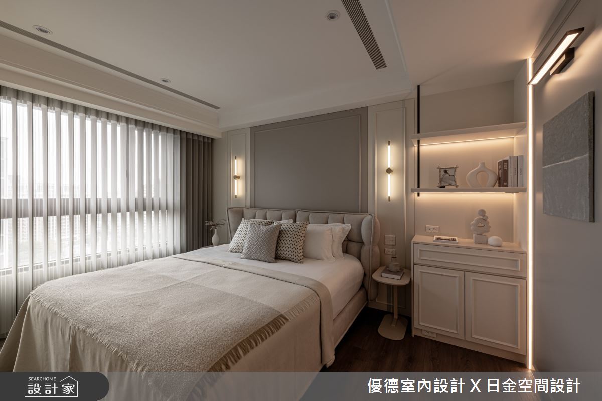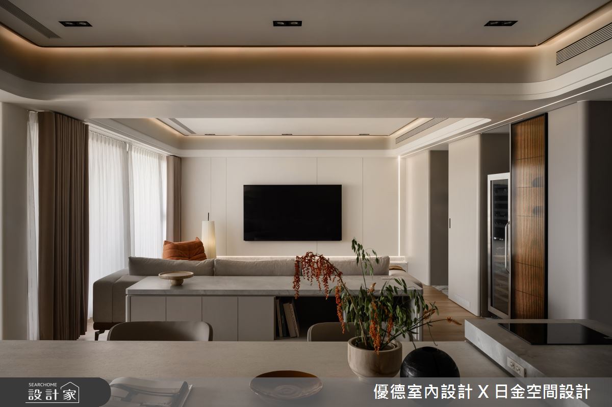 優德室內設計 X 日金空間設計以油漆、超耐磨木地板、木地板、石英磚/拋光石英磚、不鏽鋼、鐵件、茶玻、木作貼皮、烤漆、系統板材、大理石、磁磚、水泥/水泥粉光、線板、噴漆、灰玻、長虹玻璃、百葉窗的搭配應用,呈現新古典居家氛圍,將此間36.2坪、三房、單層、新成屋(5年以下)打造成舒適愜意的家庭空間,完成2位大人、2位小孩全家人的夢想之居。
