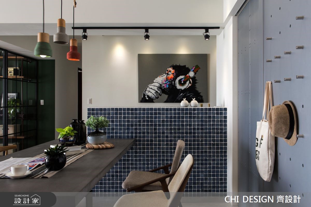 40 坪混搭風住宅,屋主兩人特別鍾情隨興的工業風設計,但又希望挹注居家生活更多暖度,因此設計師以老紅磚牆定調主視覺,佐鐵件混搭出活潑又溫暖的空間表情,並將公領域敞開,以開放式設計呈現,加乘了此屋採光佳的優點,讓充足日光灑落公共空間各角落,打造出屋主心中完美的生活模樣。 復古紅磚電視牆面,搭佐落地窗引入的和煦日光,帶出居家質樸又溫暖的場域氛圍,沙發後方以深綠牆面定調的多功能書房,敞開拉門讓公共空間融合而一,寬敞度足以容納二十人,親友聚會擁有更舒適的空間。餐廚區運用藍色磚紋設計,呼應了客廳的紅磚及書房的綠牆,鋪排出公領域的活潑視覺。私領域將床墊擺置於木質地坪,佐以一道日光,營造減壓溫暖空間氛圍,並延攬公領域每個場域都擁有專屬色彩的設計理念,將略帶鄉村休閒氣息的更衣室門片刷上搶眼藍色,混搭出臥房專屬個性。 小編的最愛 用餐區後方門片以洞洞板設計,垂直收納手法讓空間增加更多機能,並巧妙利用收納物品創造餐桌區的獨特表情,又為公領域增加另一處亮點!